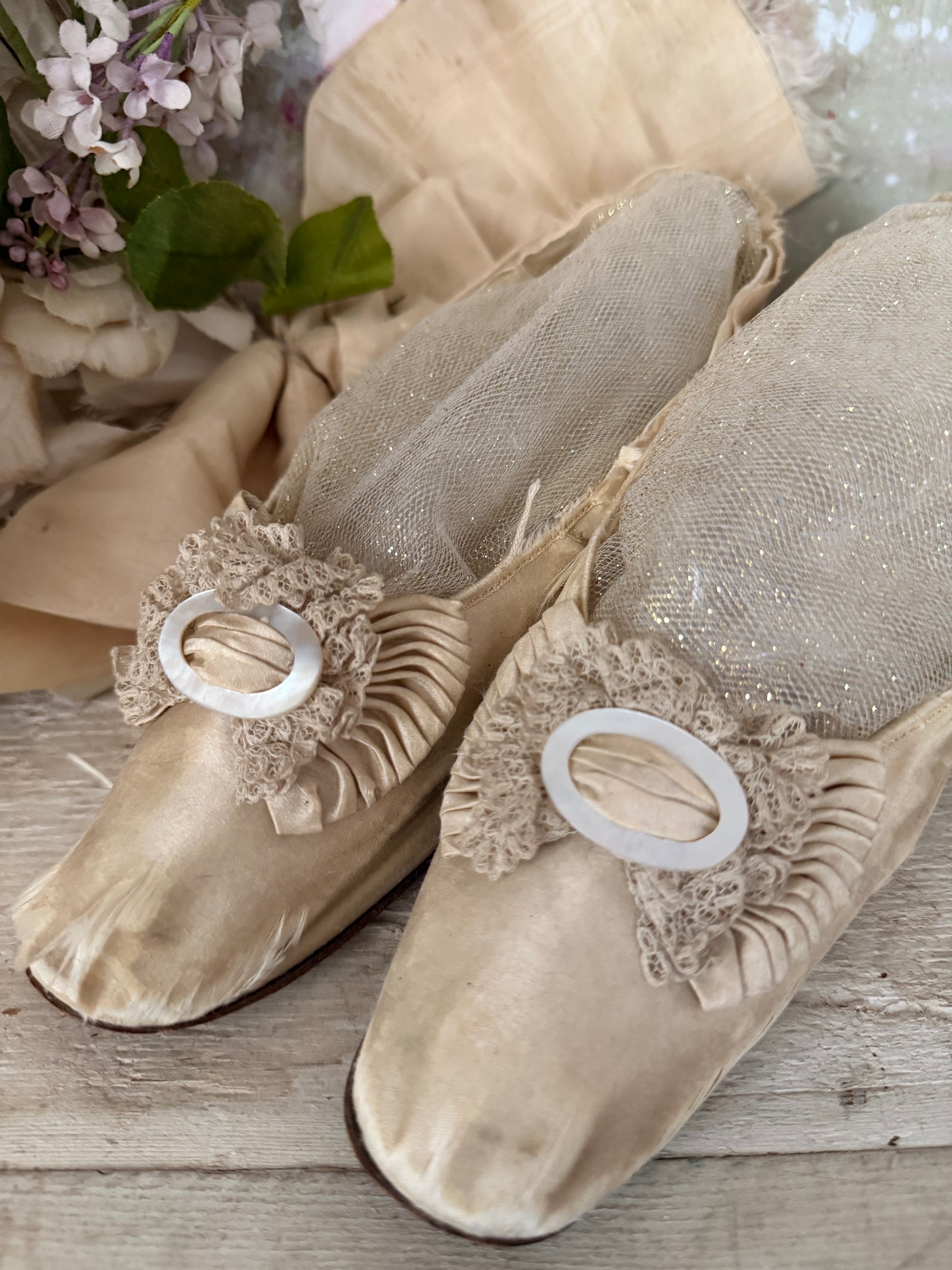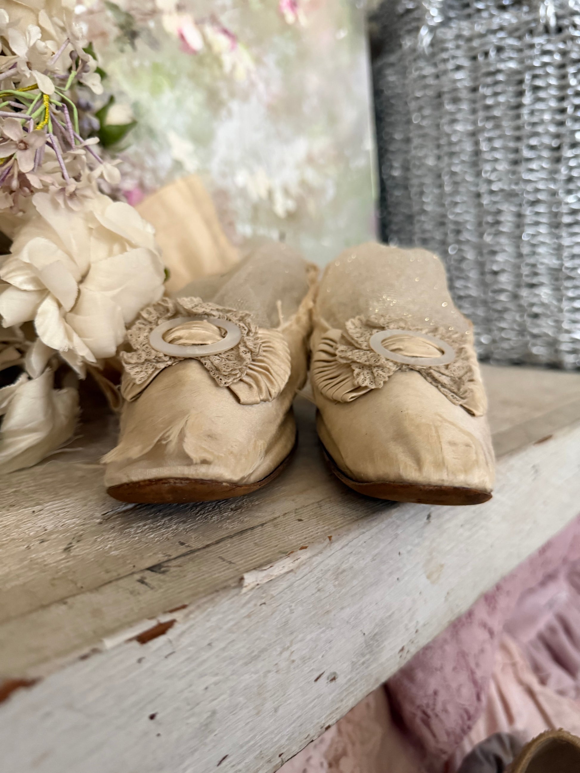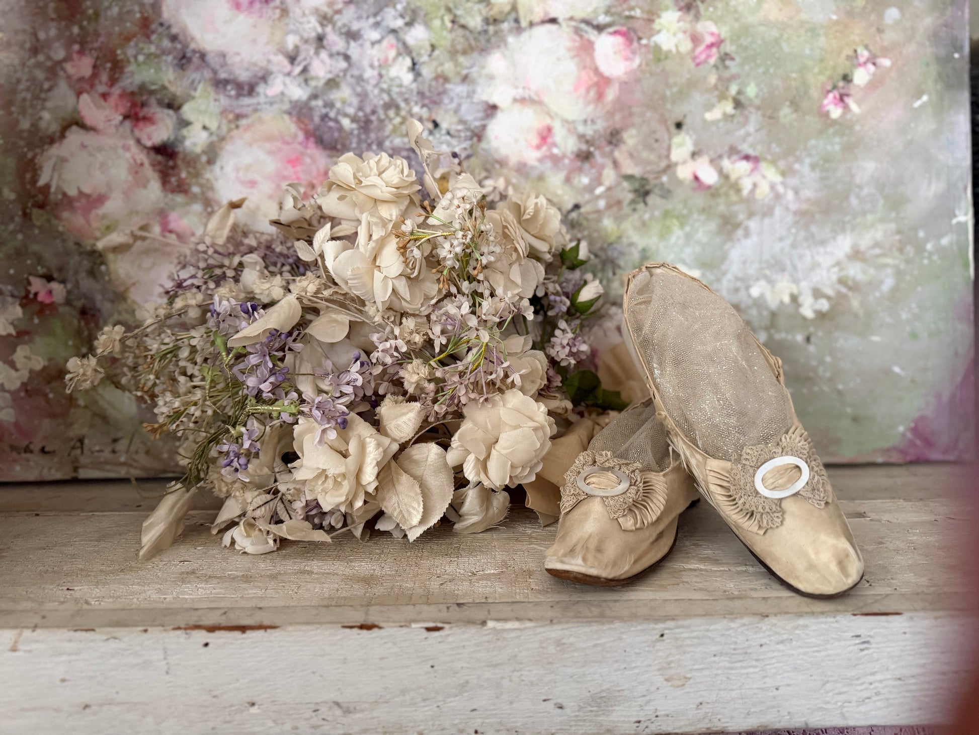 Elegant, timeworn dancing or wedding slipper shoes with a small heel