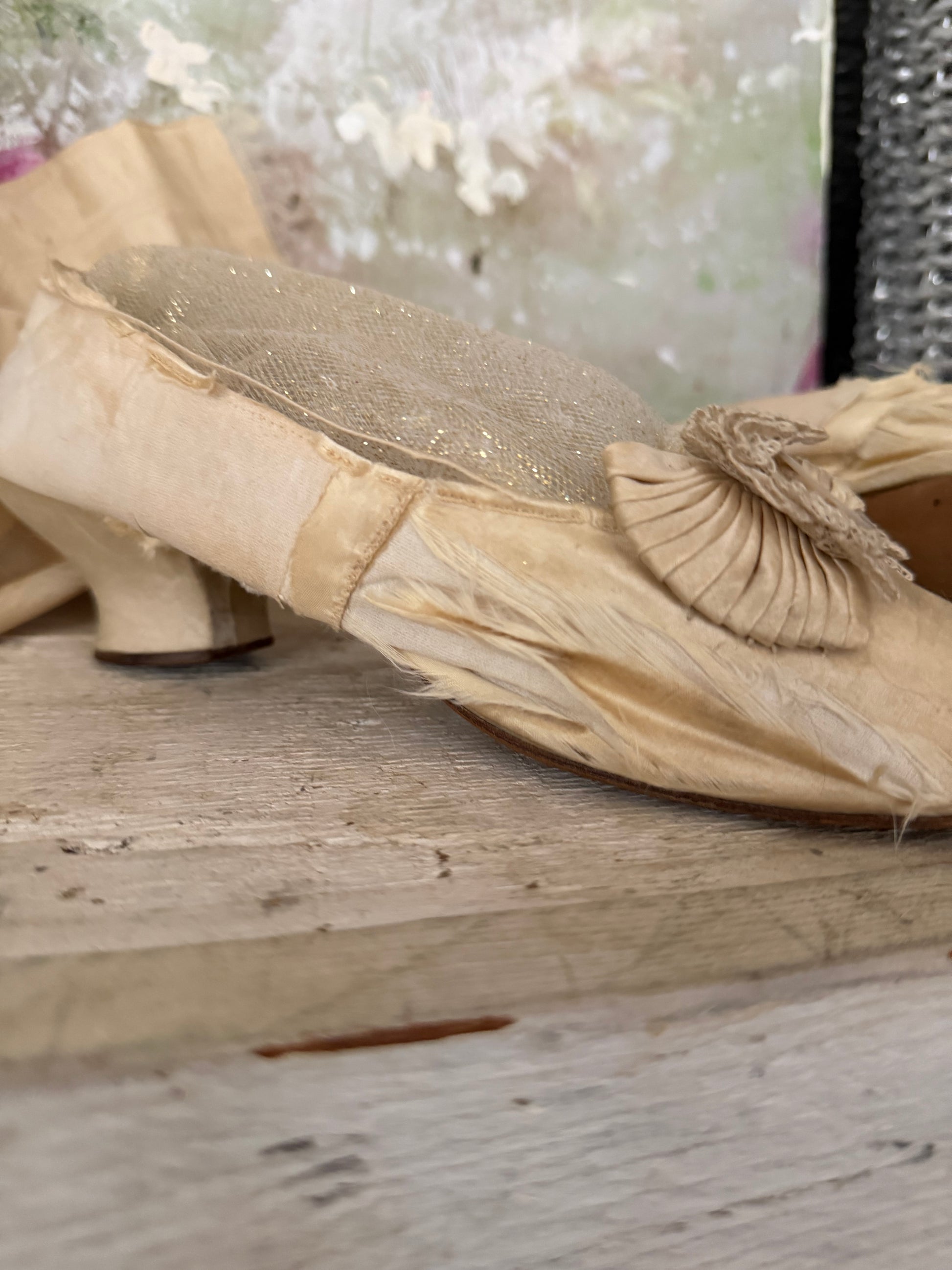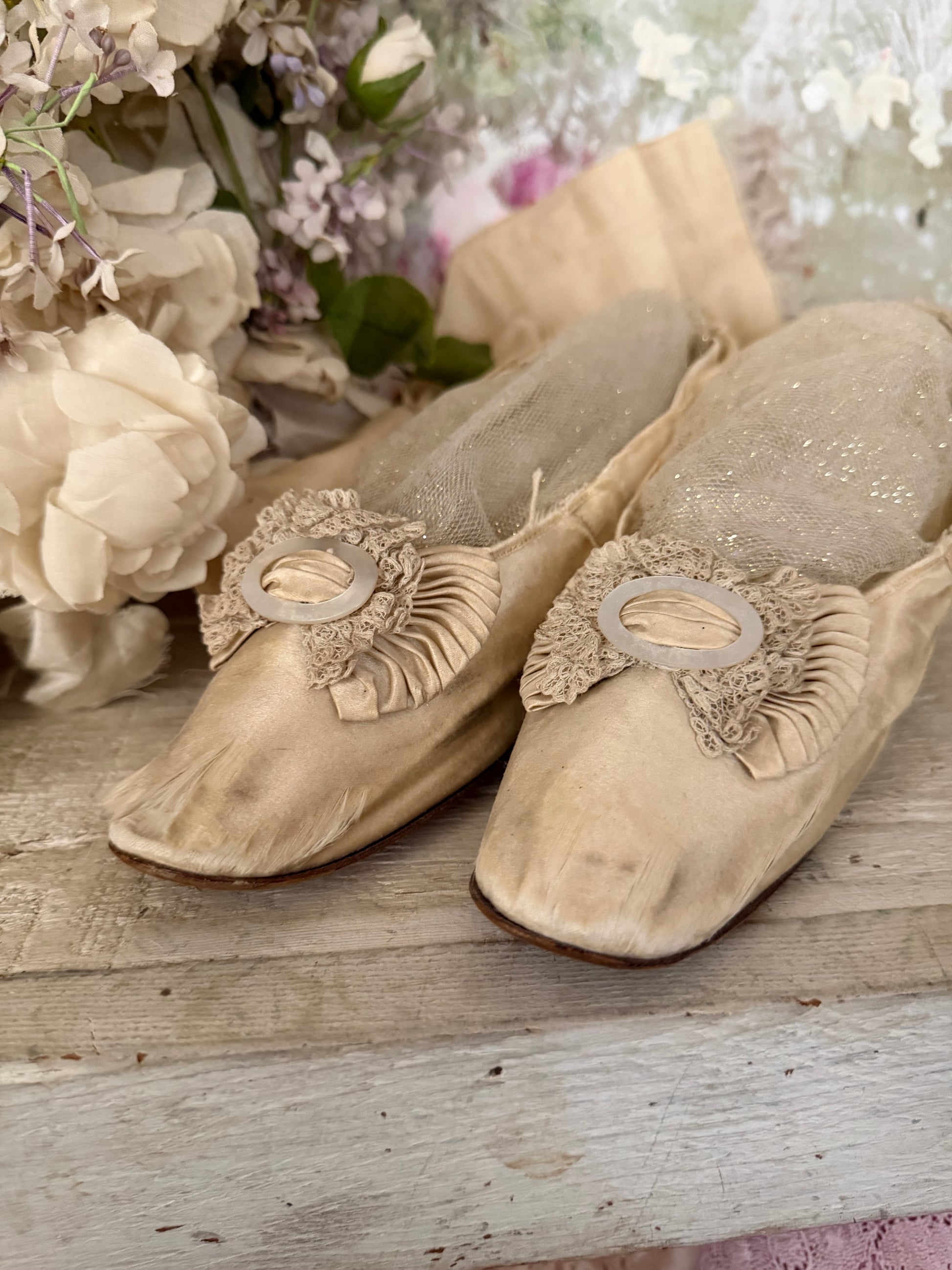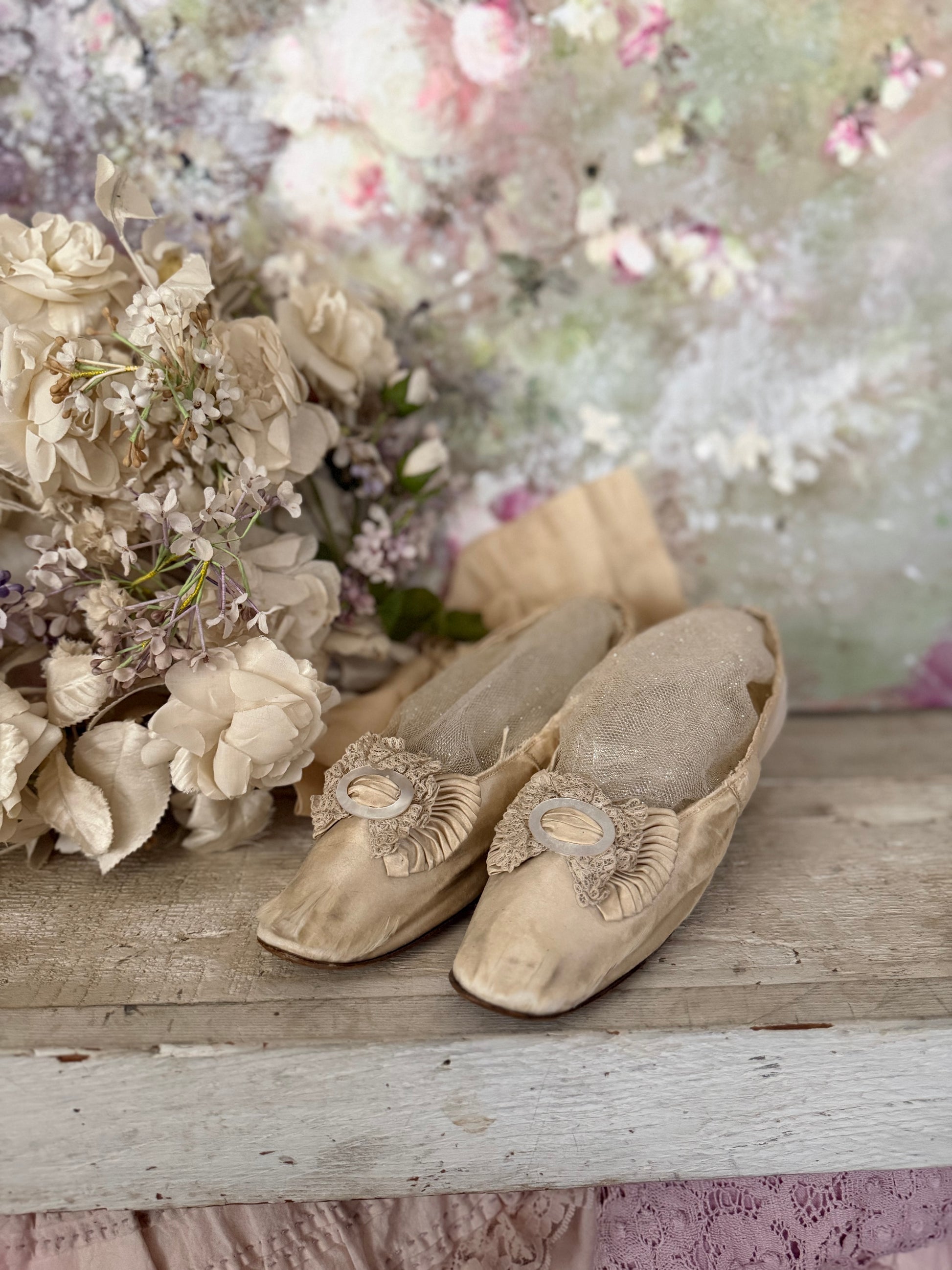 Elegant, timeworn dancing or wedding slipper shoes with a small heel