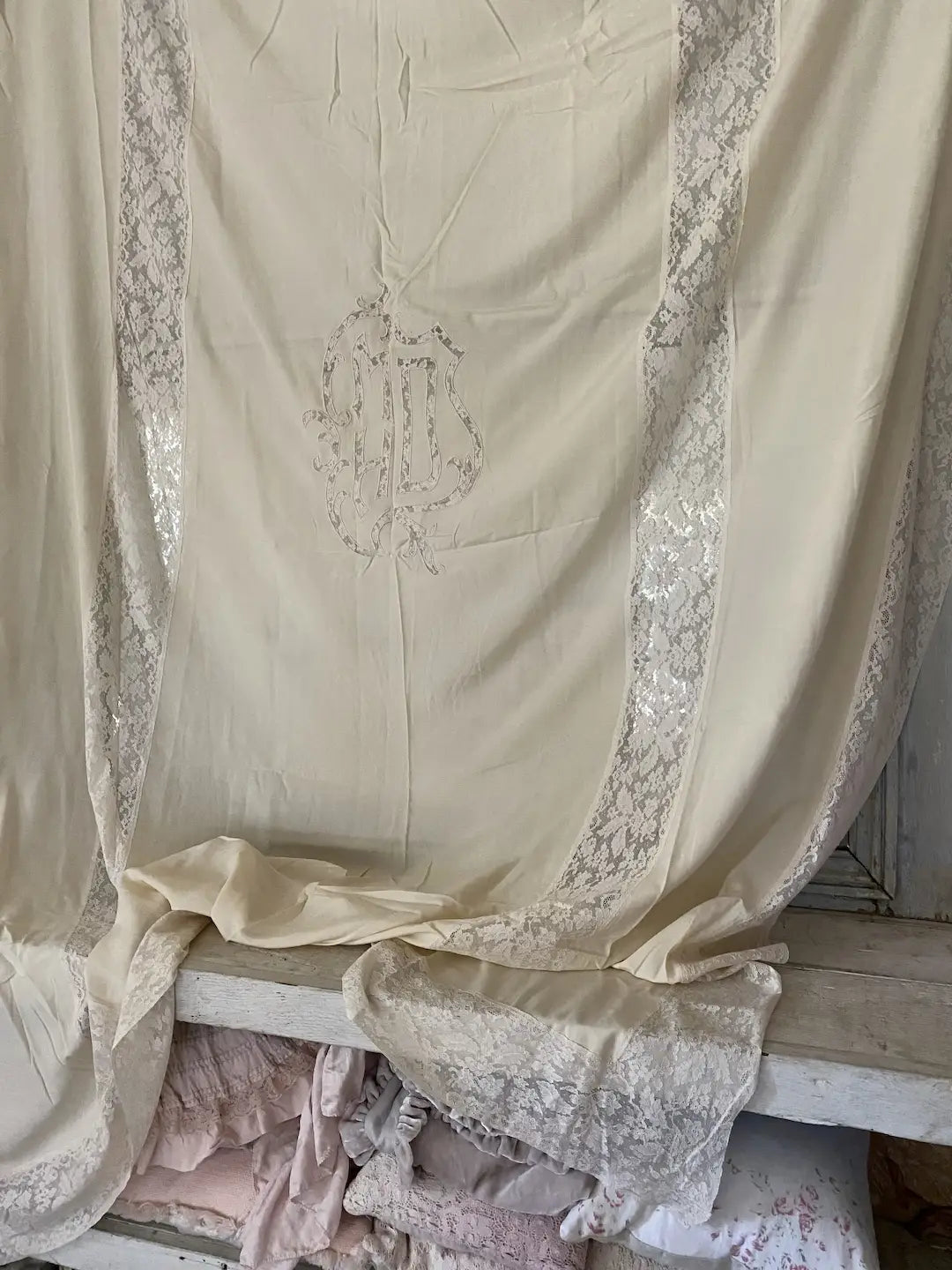 Vintage c1940 Bed Sheet Coverlet Silk Blend Lace Insert Monogram