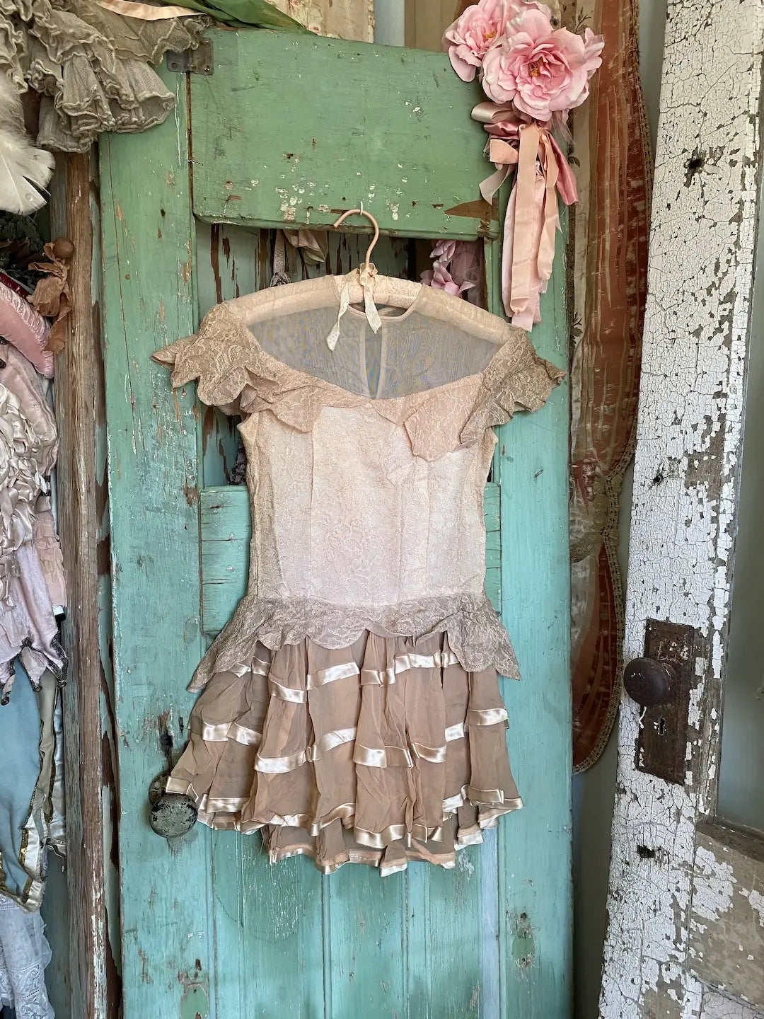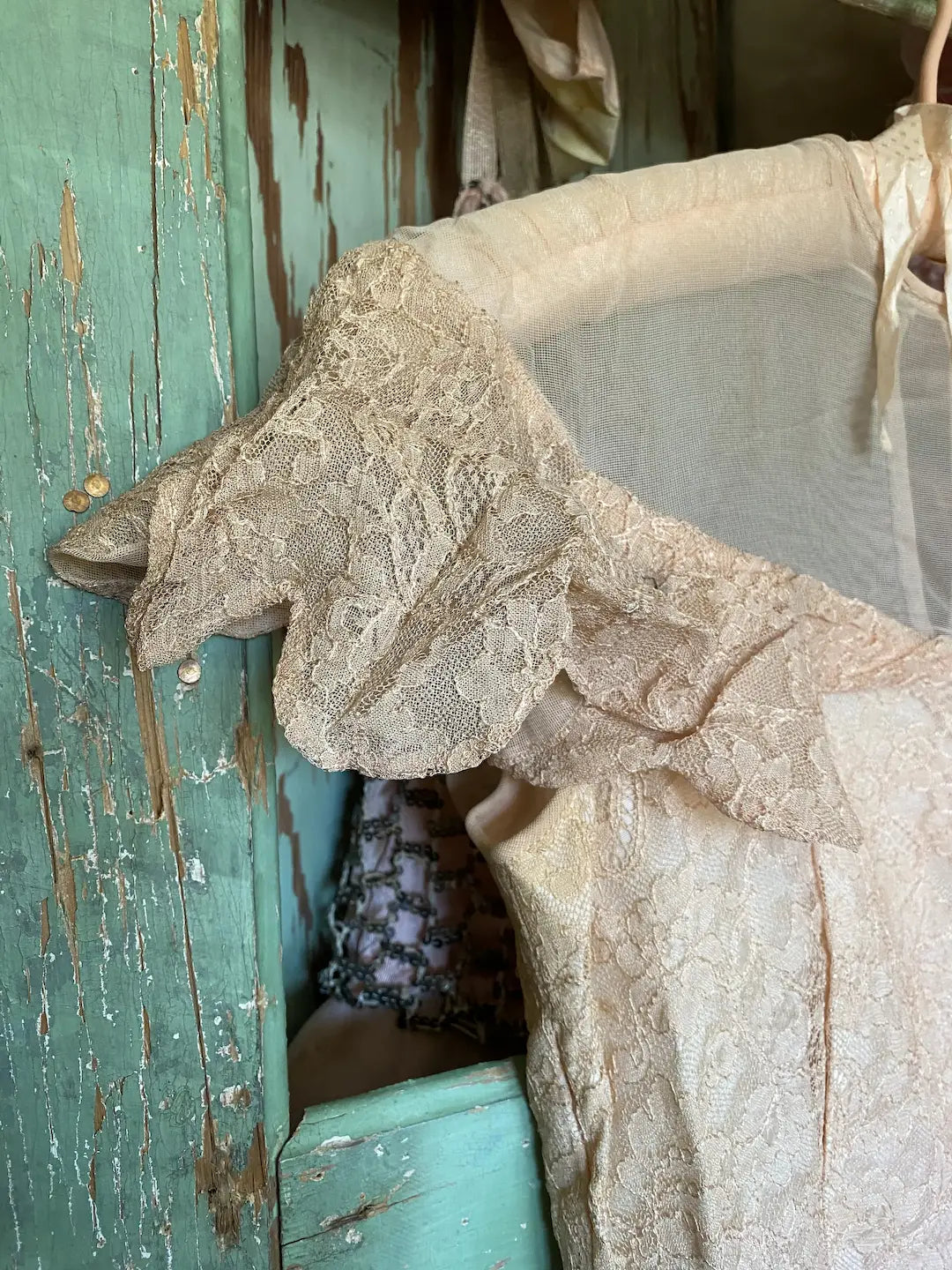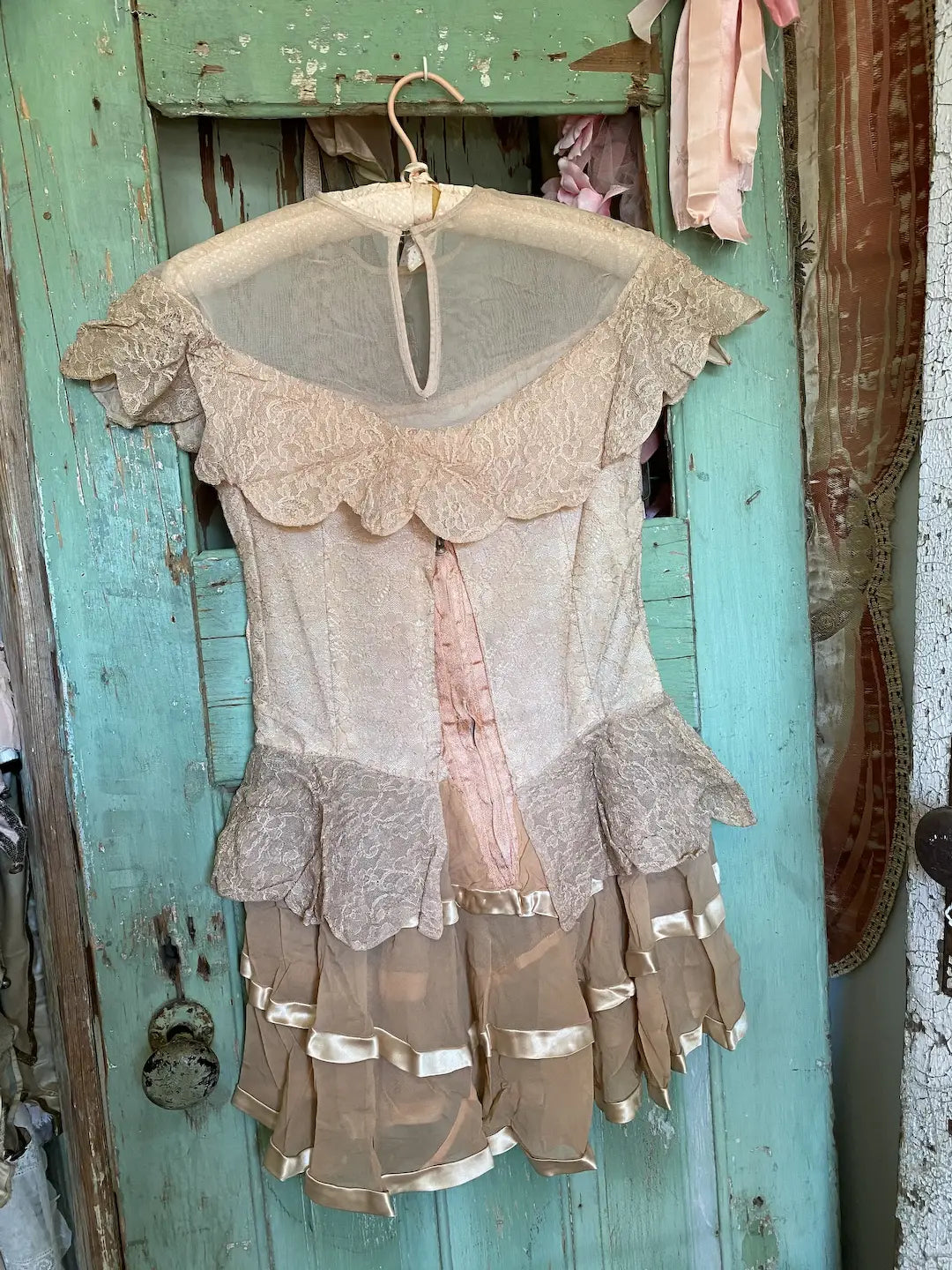 Vintage Dance Costume Dress Peach Silk Scalloped Collar Lace Nordic Chic