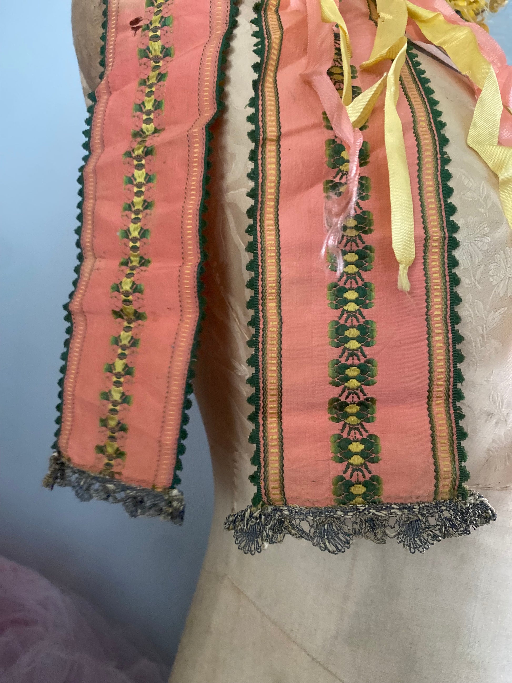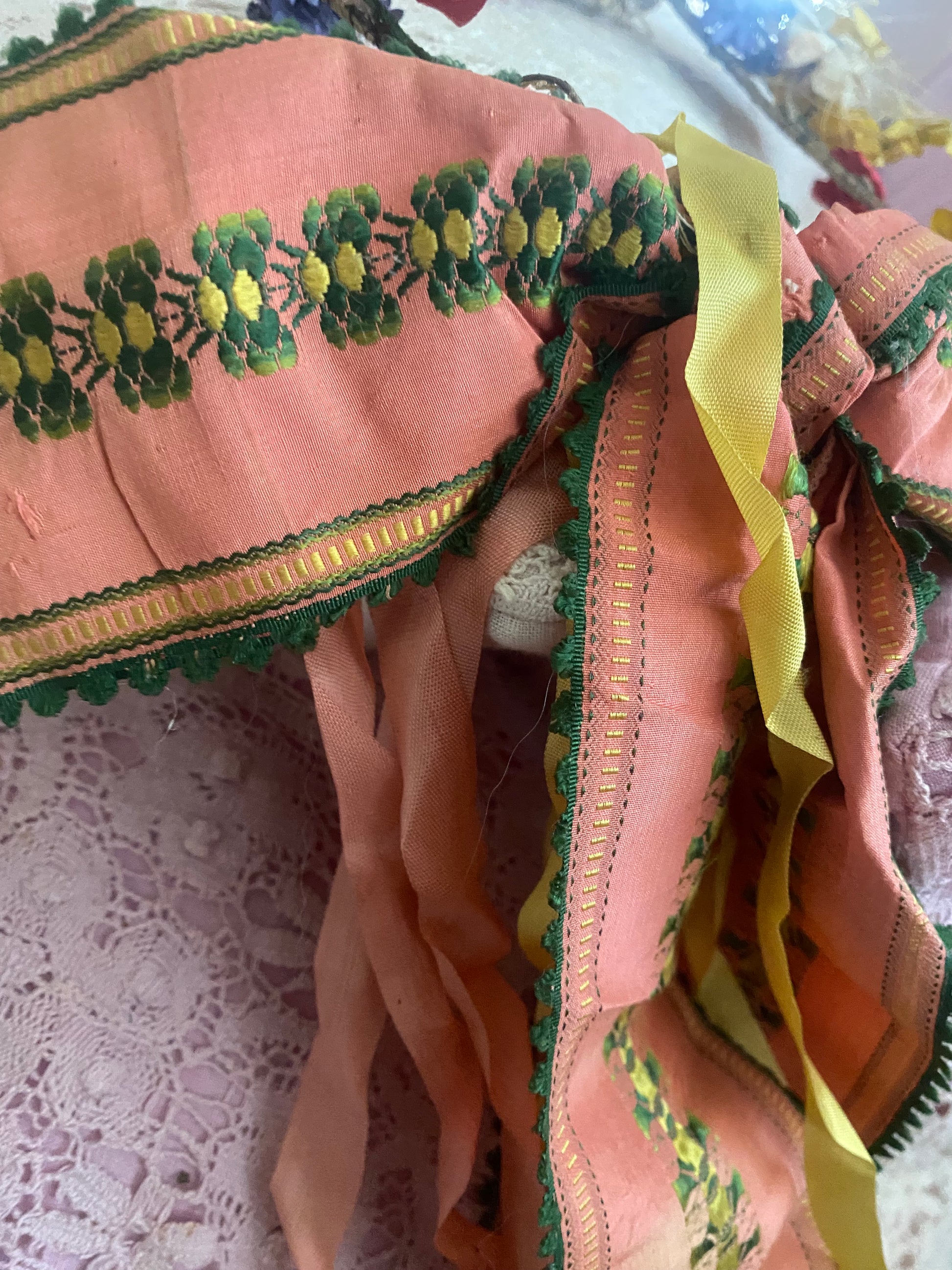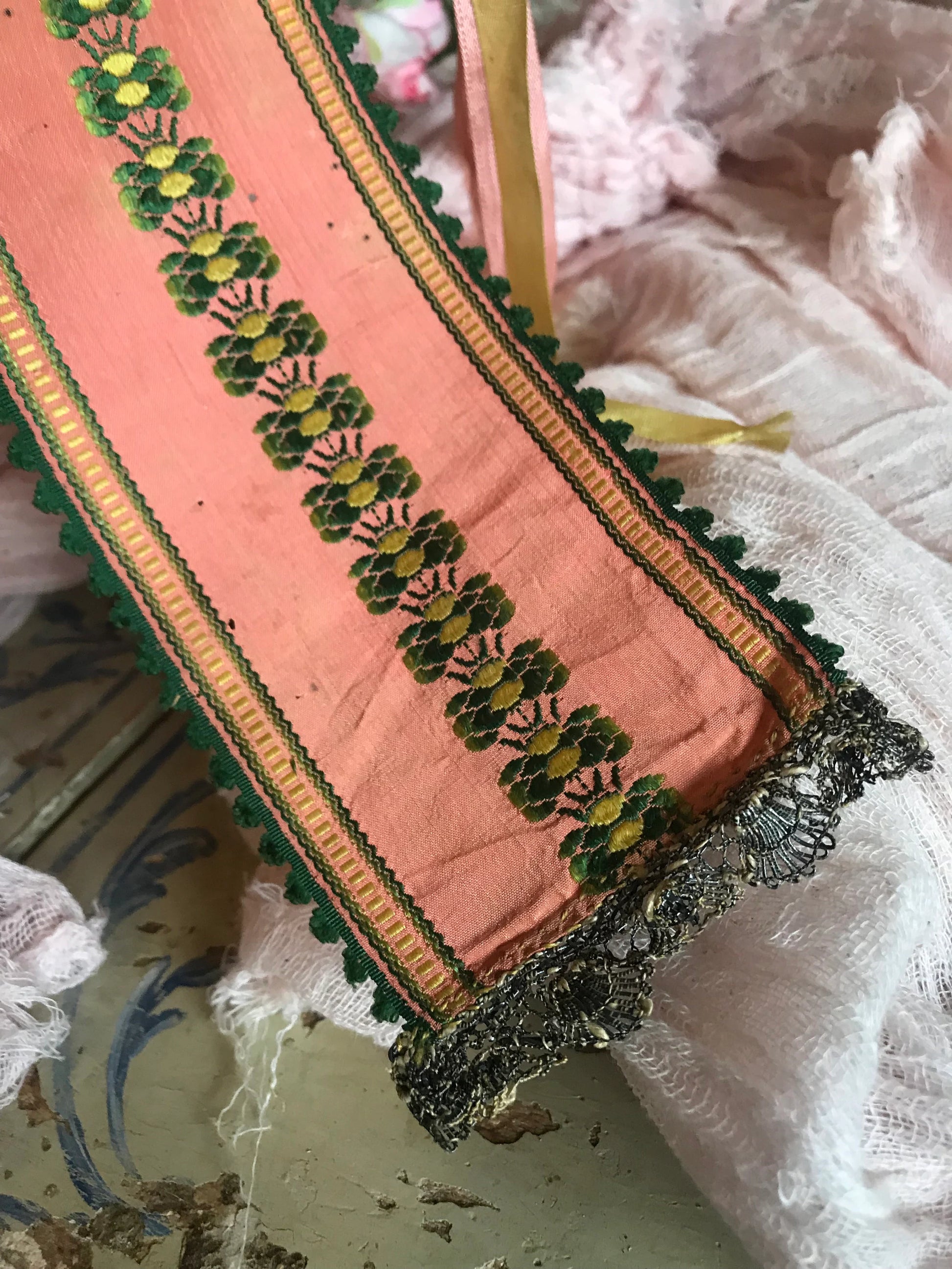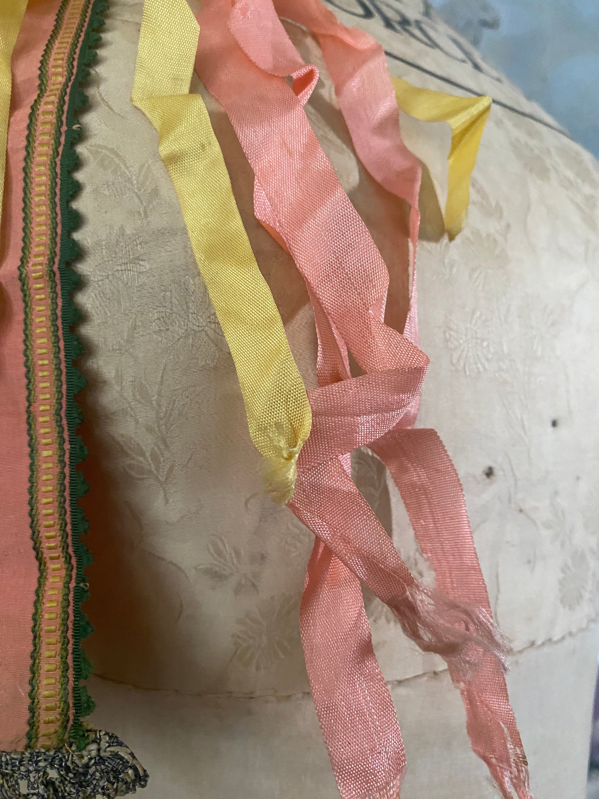 ADORNED WITH PINK SILK EMBROIDERED RIBBON AND YELLOW AND PINK RAYON RIBBON