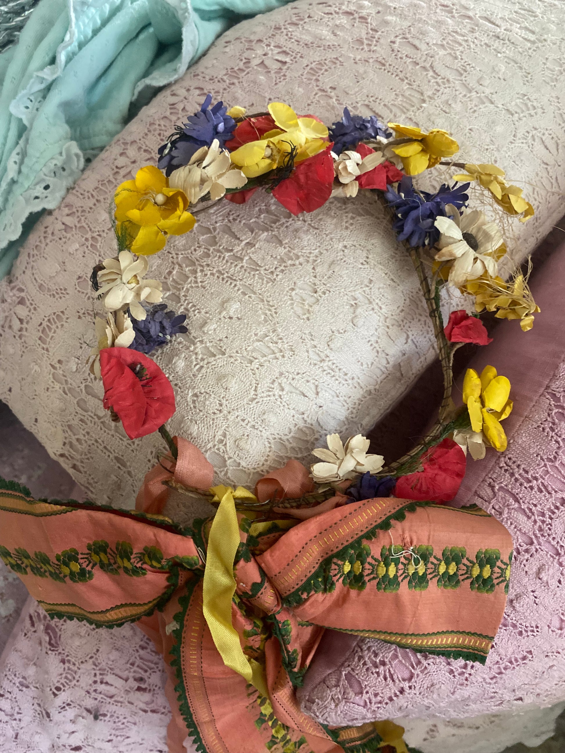 Antique Vintage Czech Hat Millinery Flowers Crown Embroidered Silk Ribbon Bow Shabby Nordic chic
