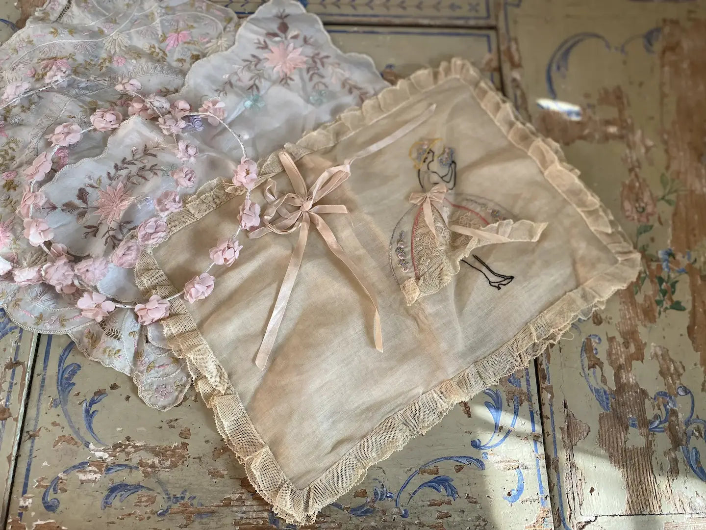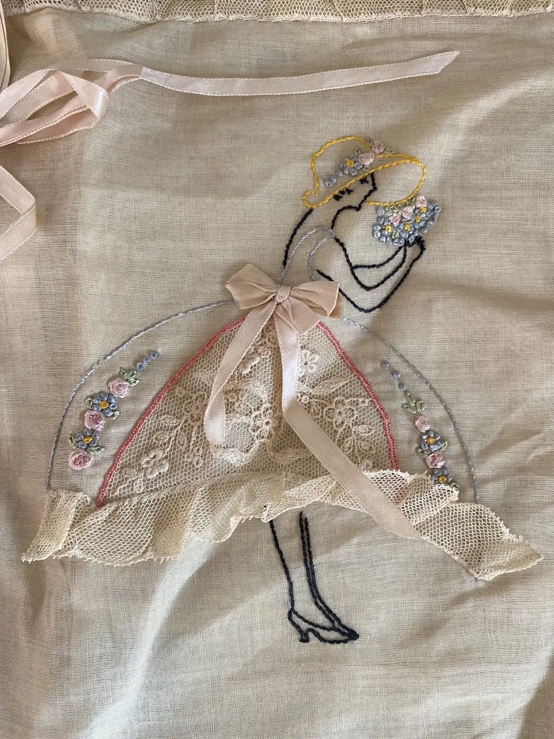 Sweet Vintage Boudoir Pillow Pillowcase Ruffled Lace Ribbonwork Bow Embroidered Woman Skirt Bonnet