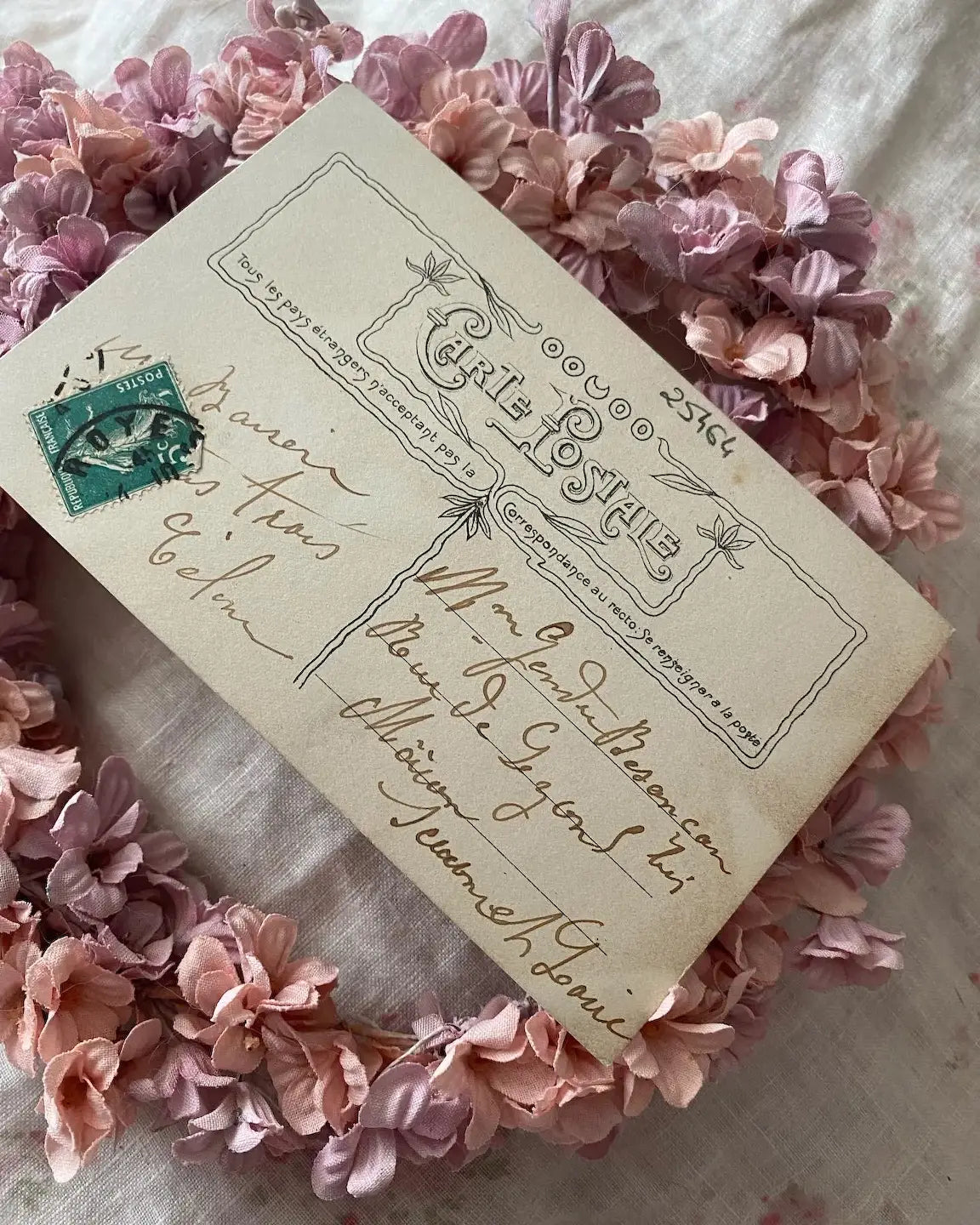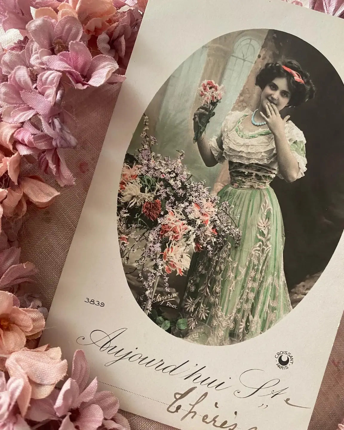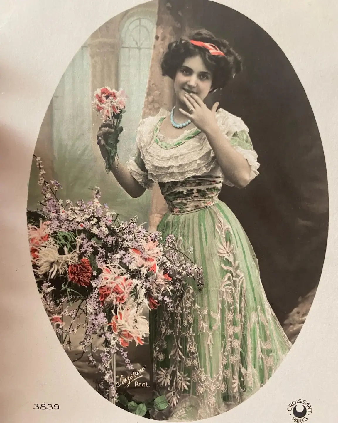 Antique French Postcard Woman Green Lace Dress Bouquet Pink Flowers