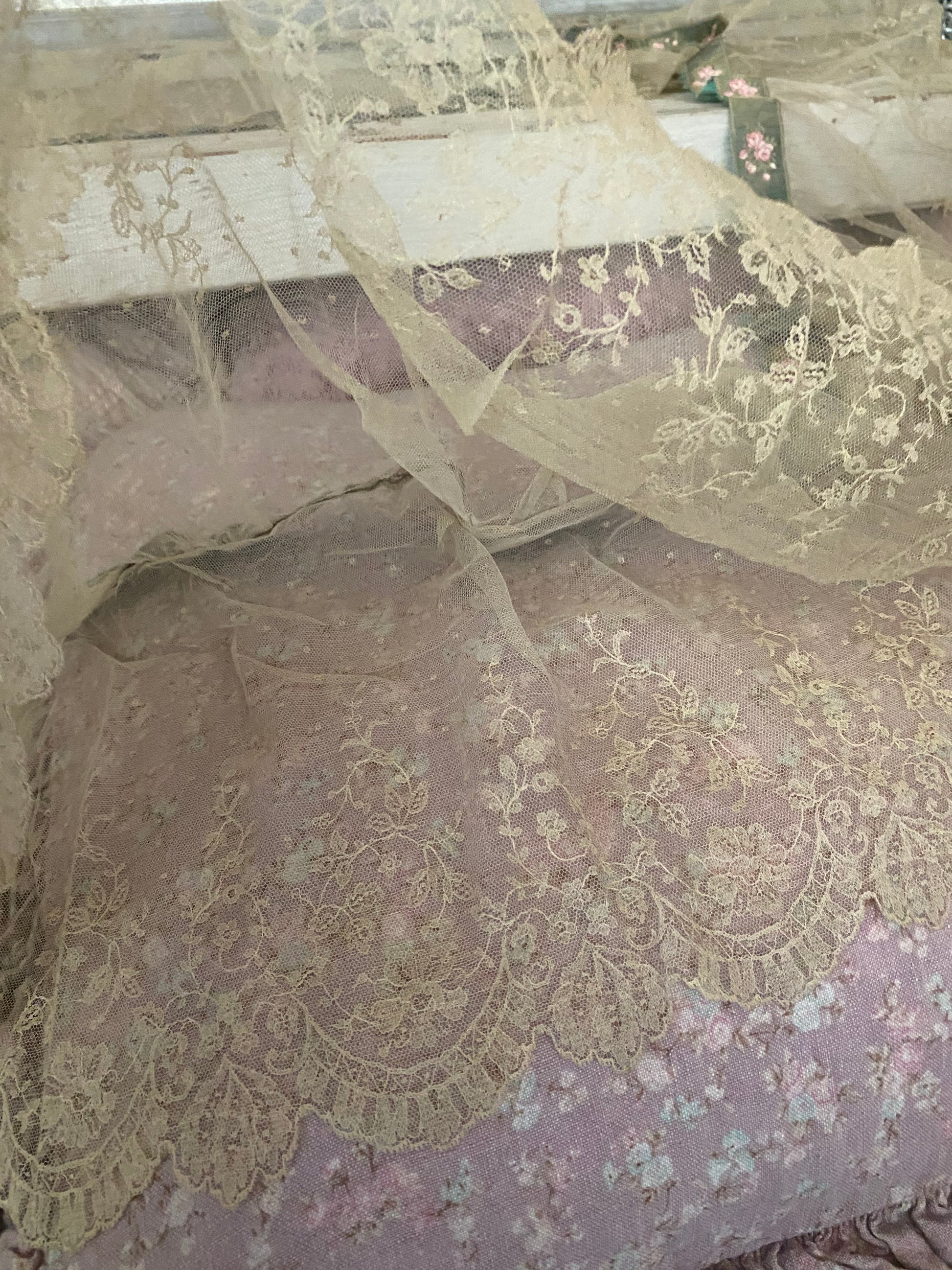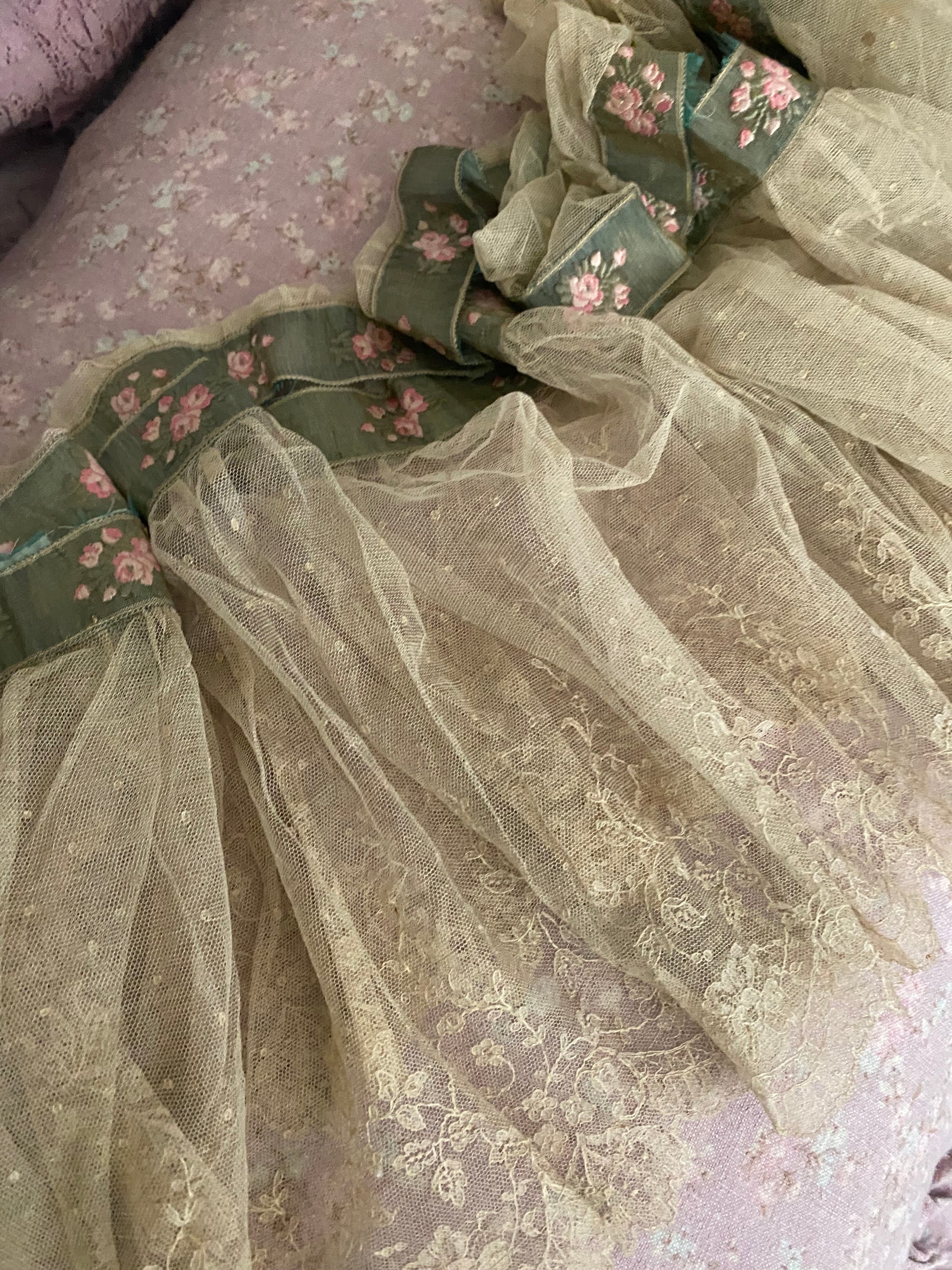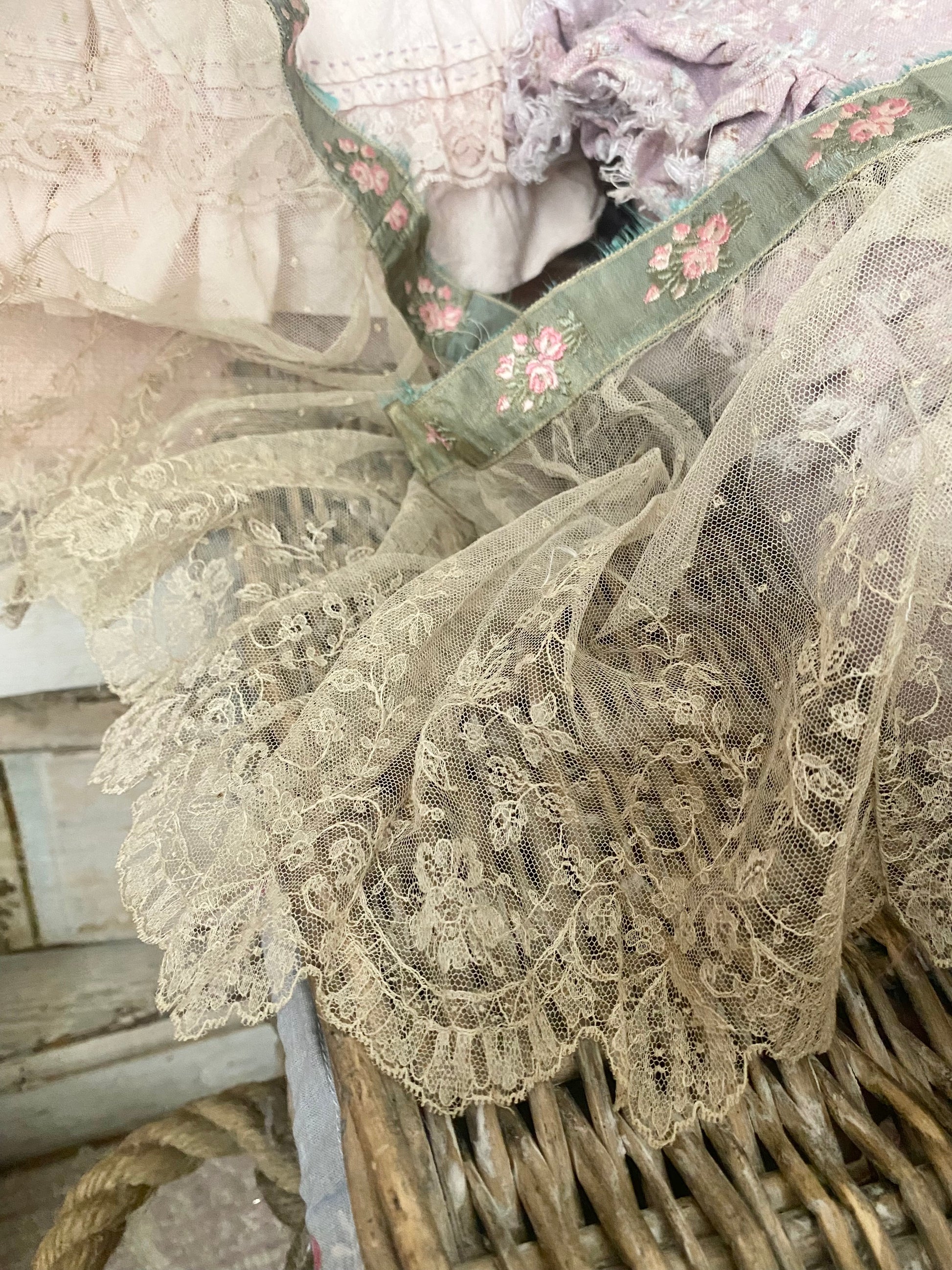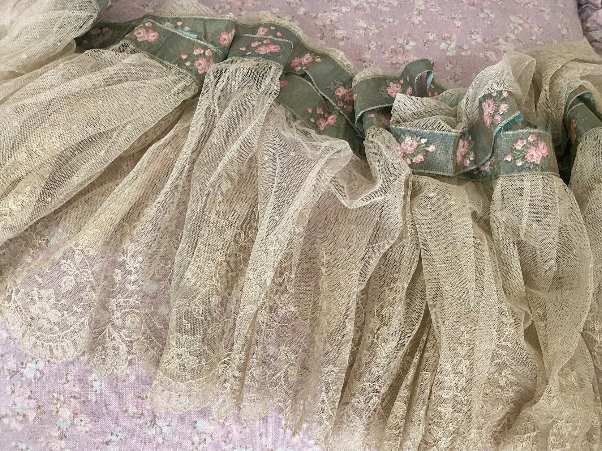 RARE Antique French Chantilly Lace Pink Rose Ribbon Flounce