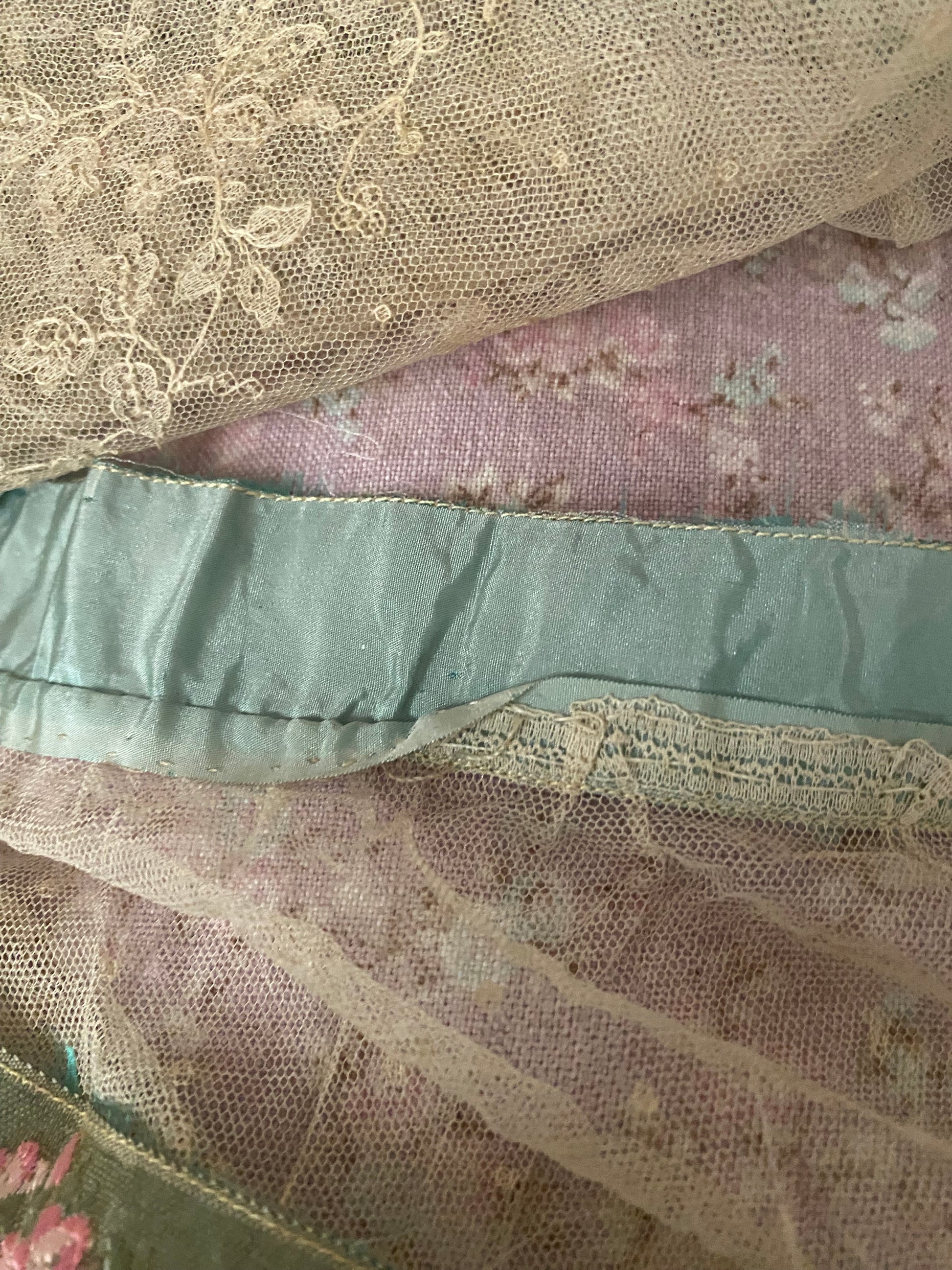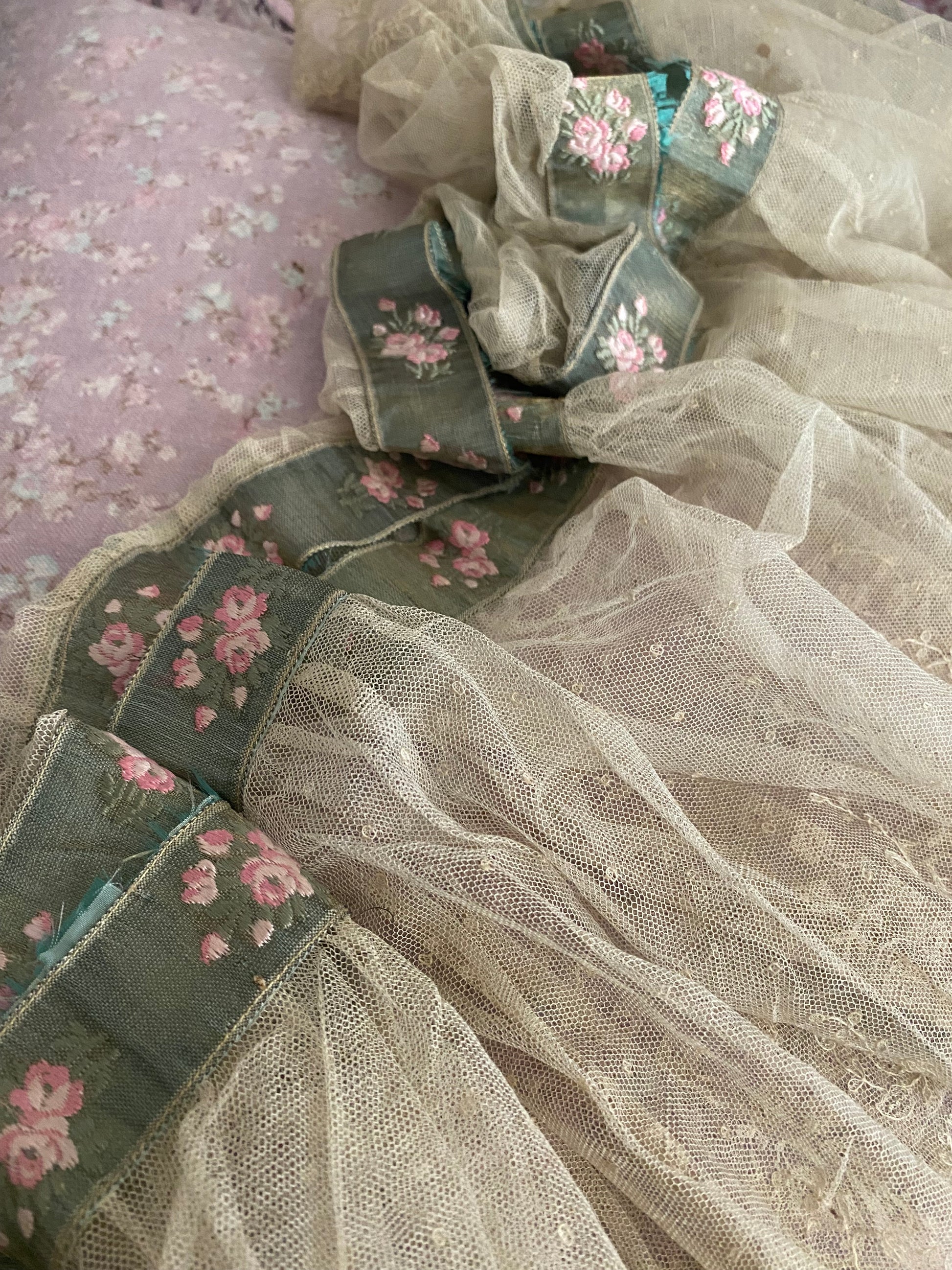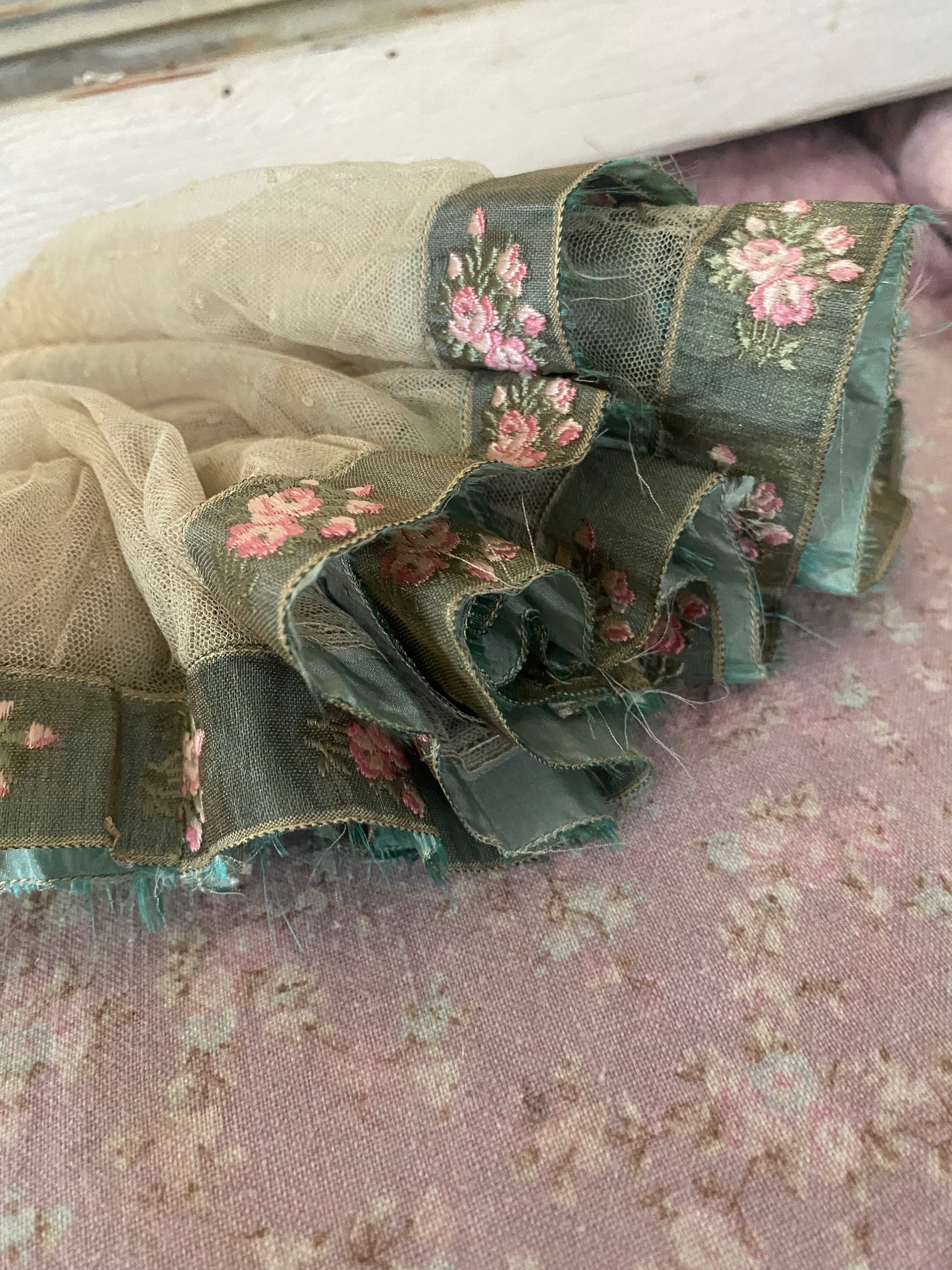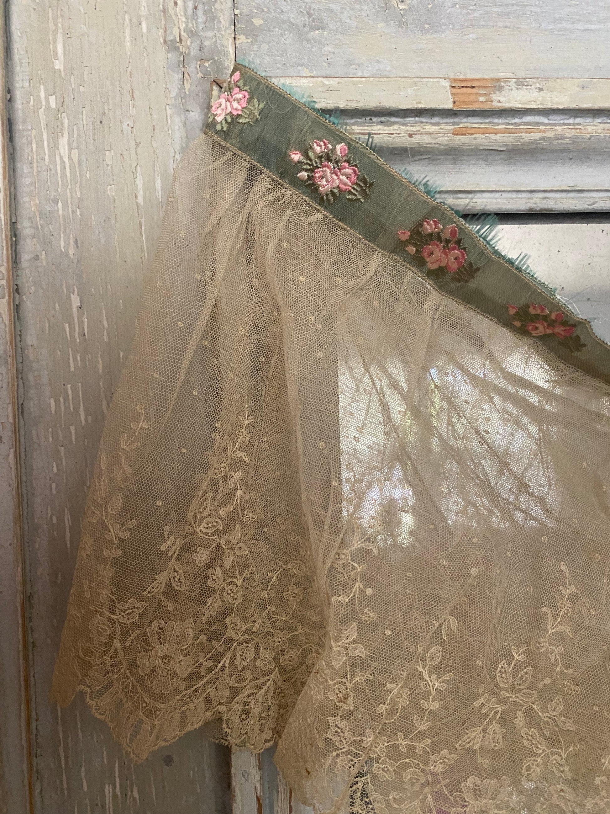 RARE Antique French Chantilly Lace Pink Rose Ribbon Flounce