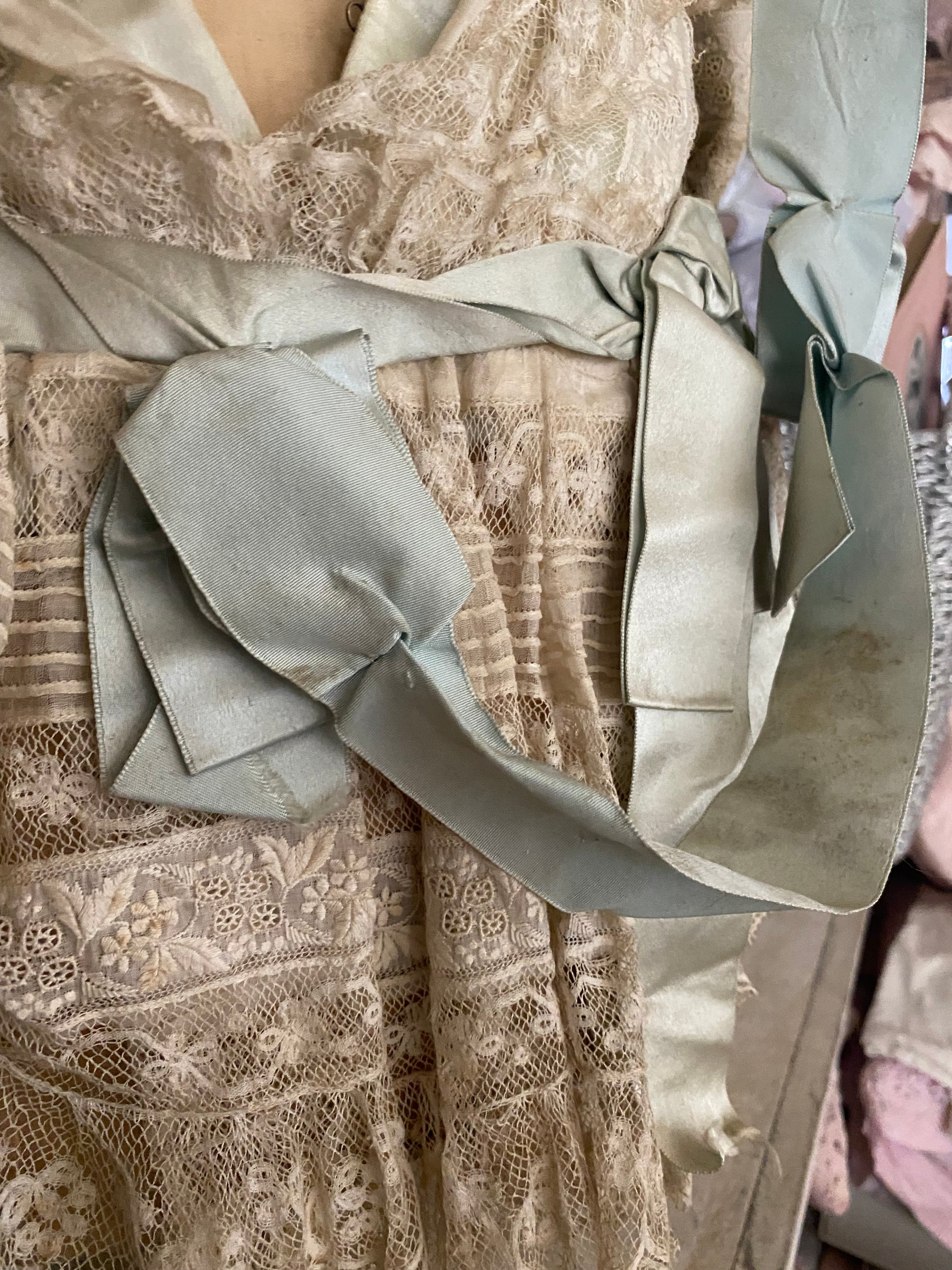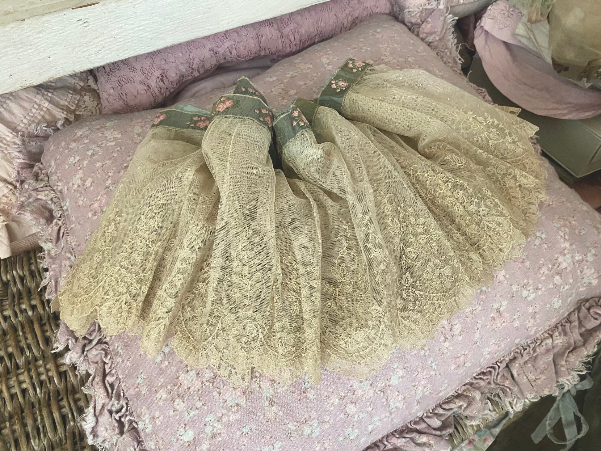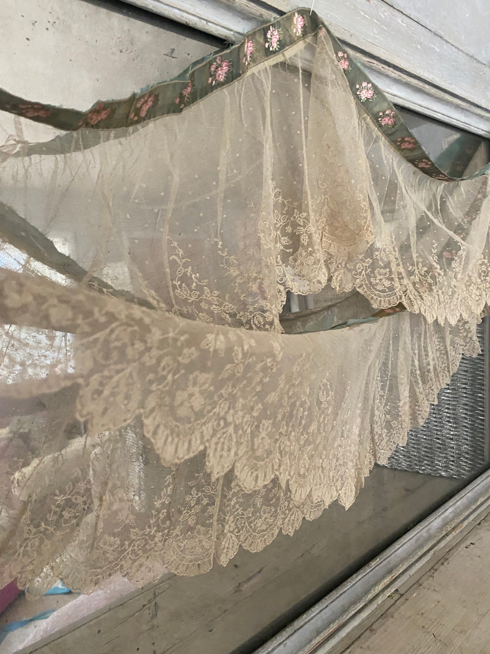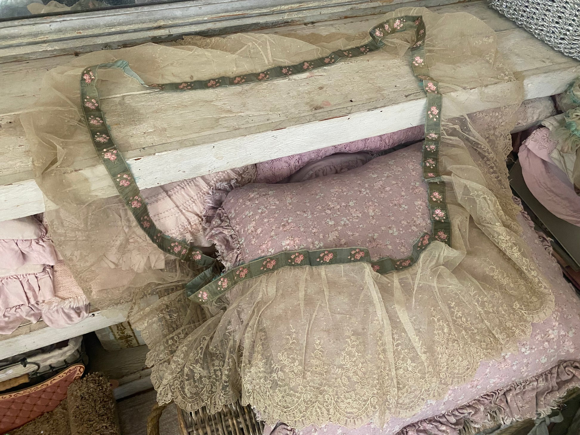 RARE Antique French Chantilly Lace Pink Rose Ribbon Flounce