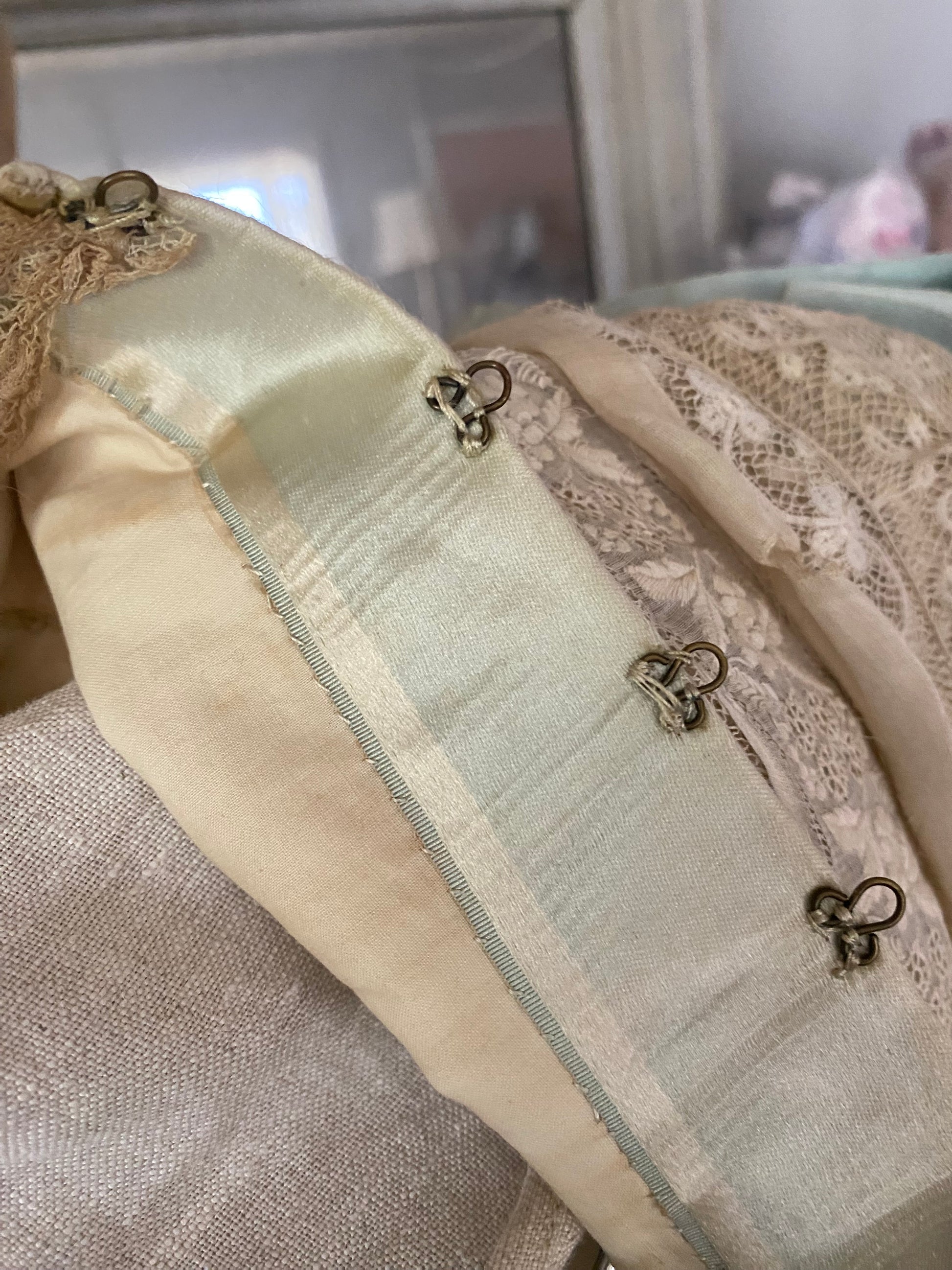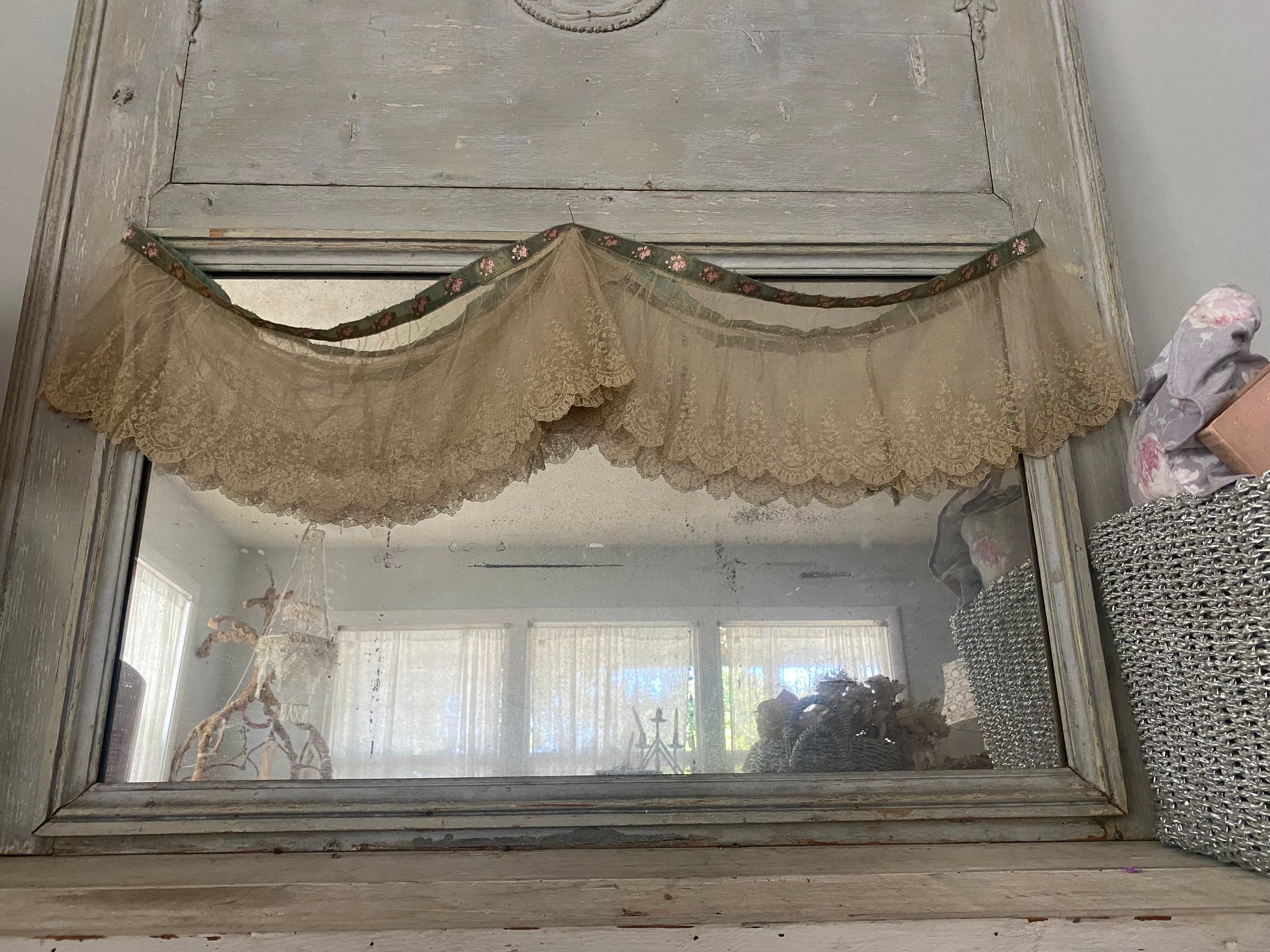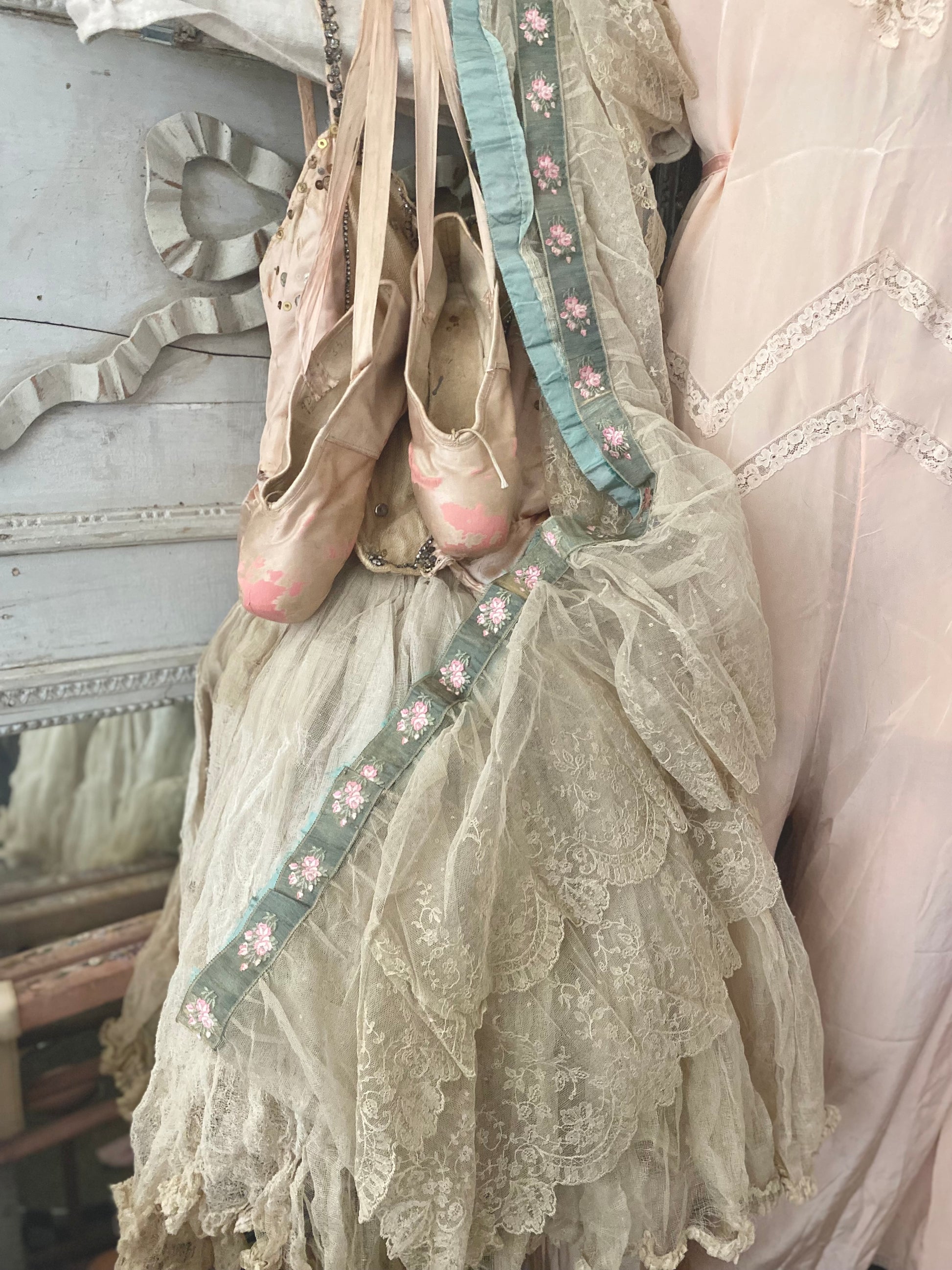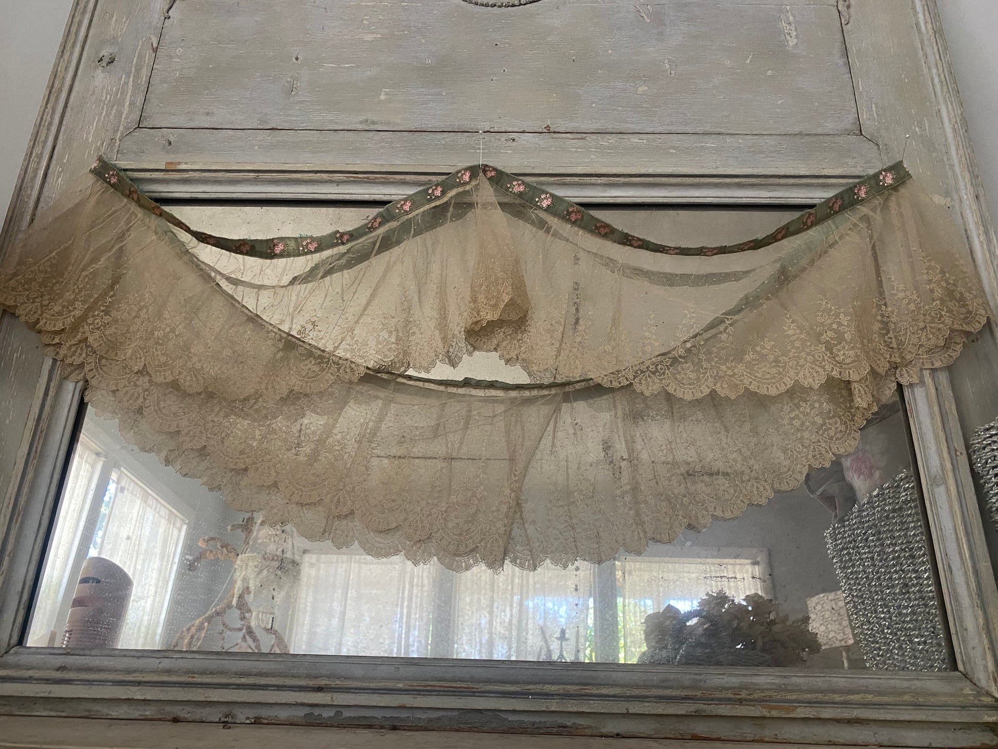 RARE Antique French Chantilly Lace Pink Rose Ribbon Flounce