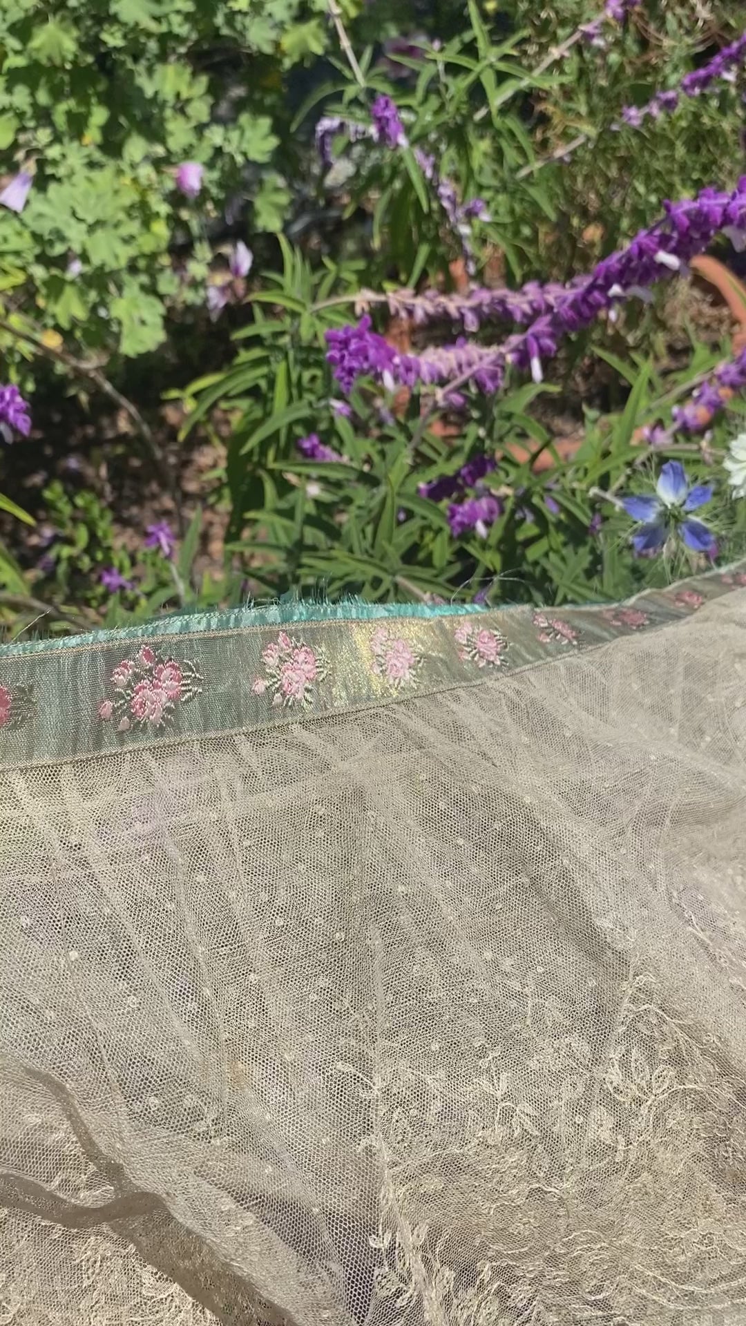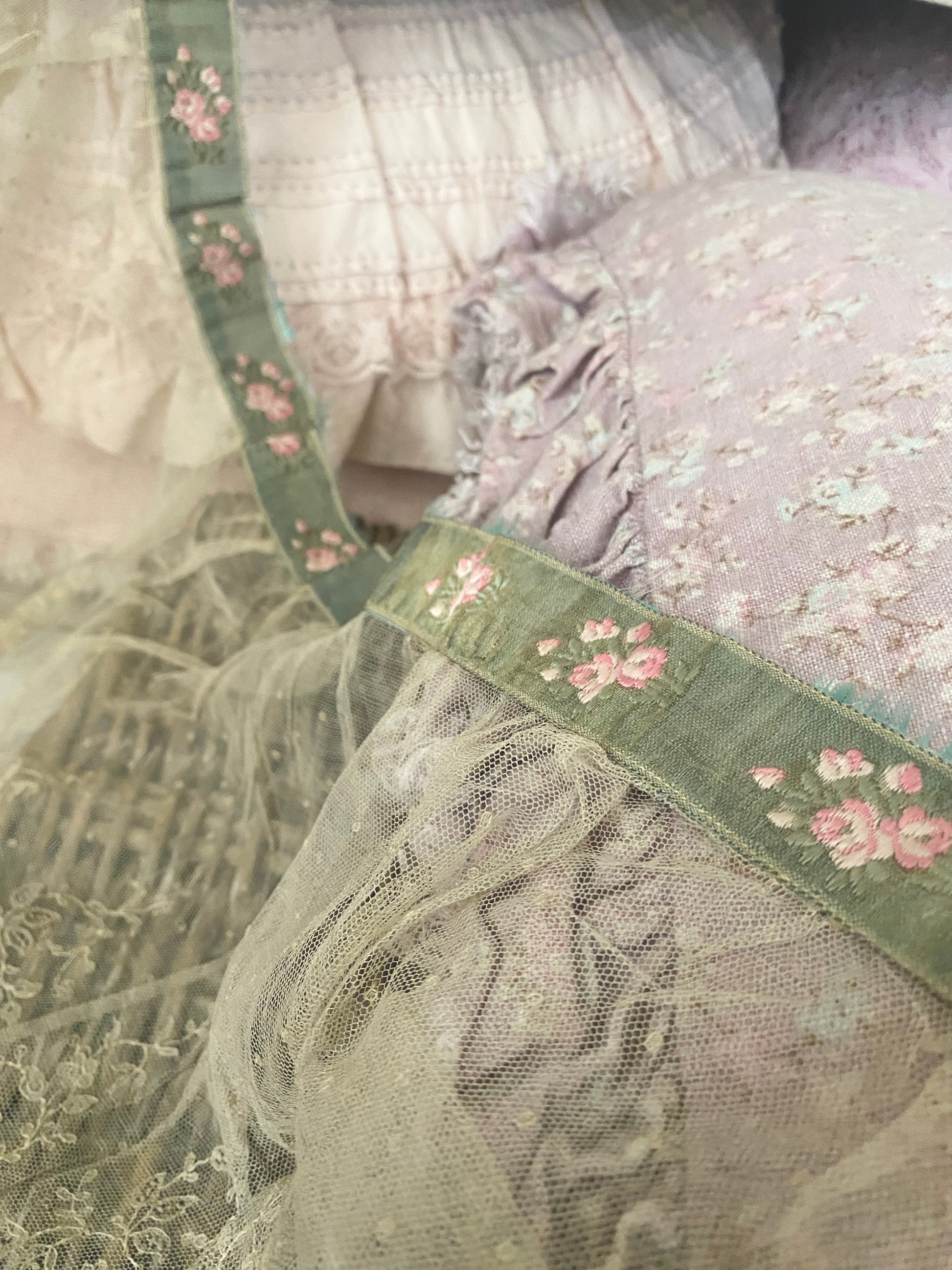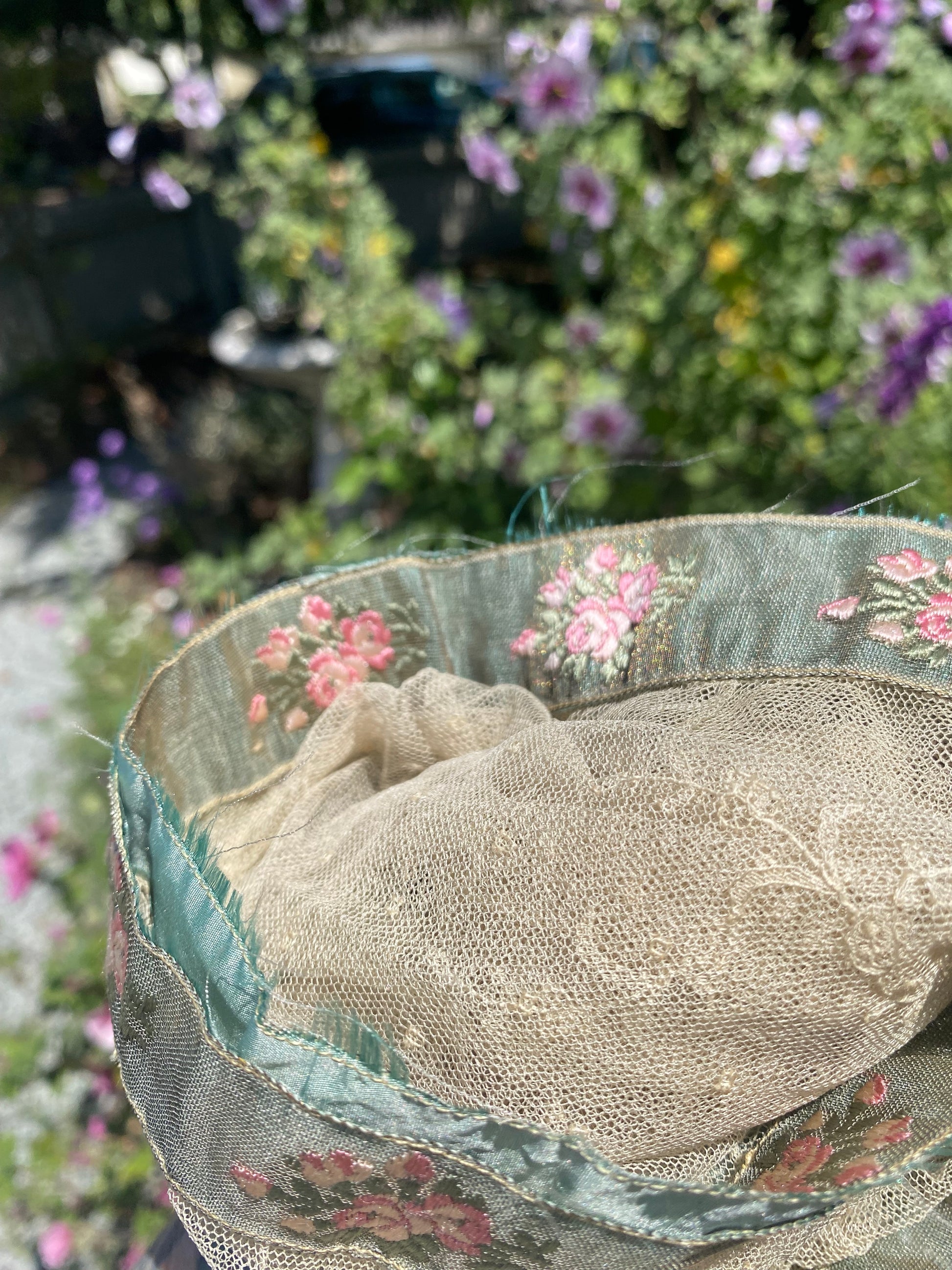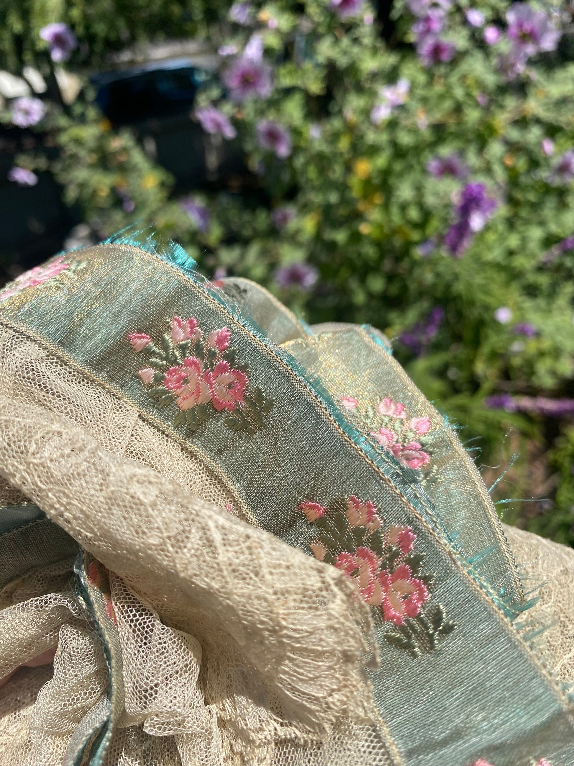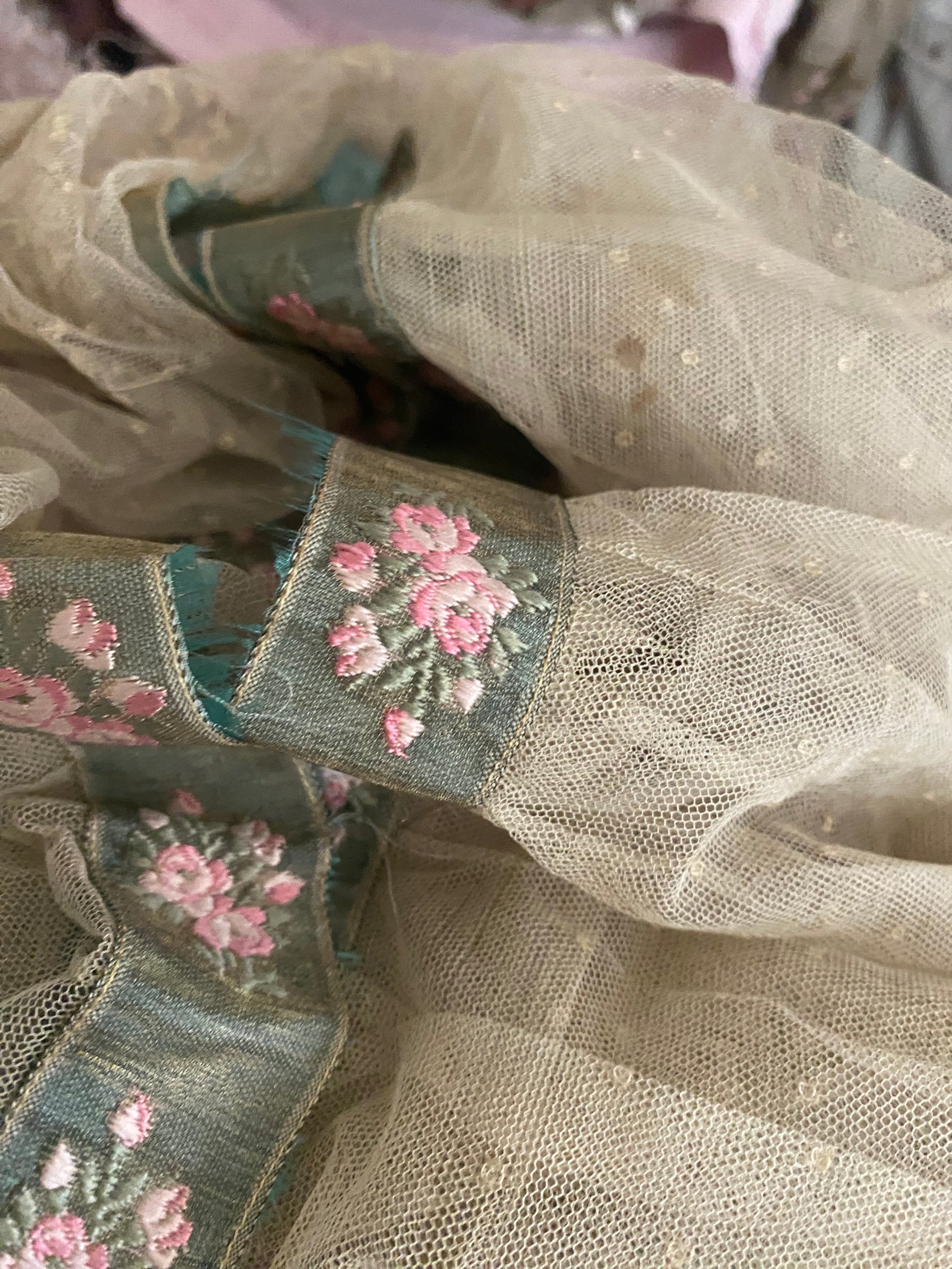 INCREDIBLE silvery gold metallic trim that shimmers in the light, embroidered with pink roses