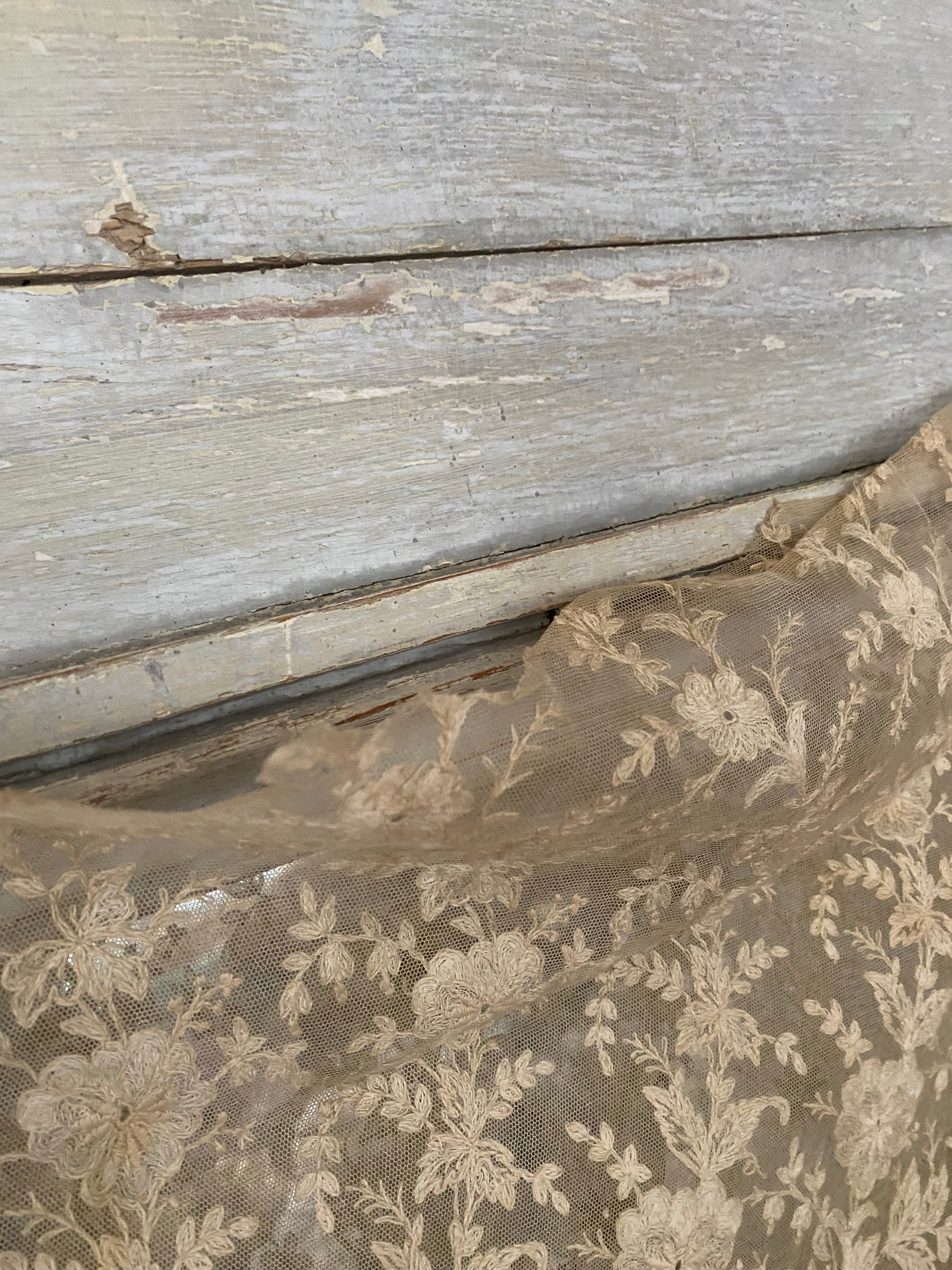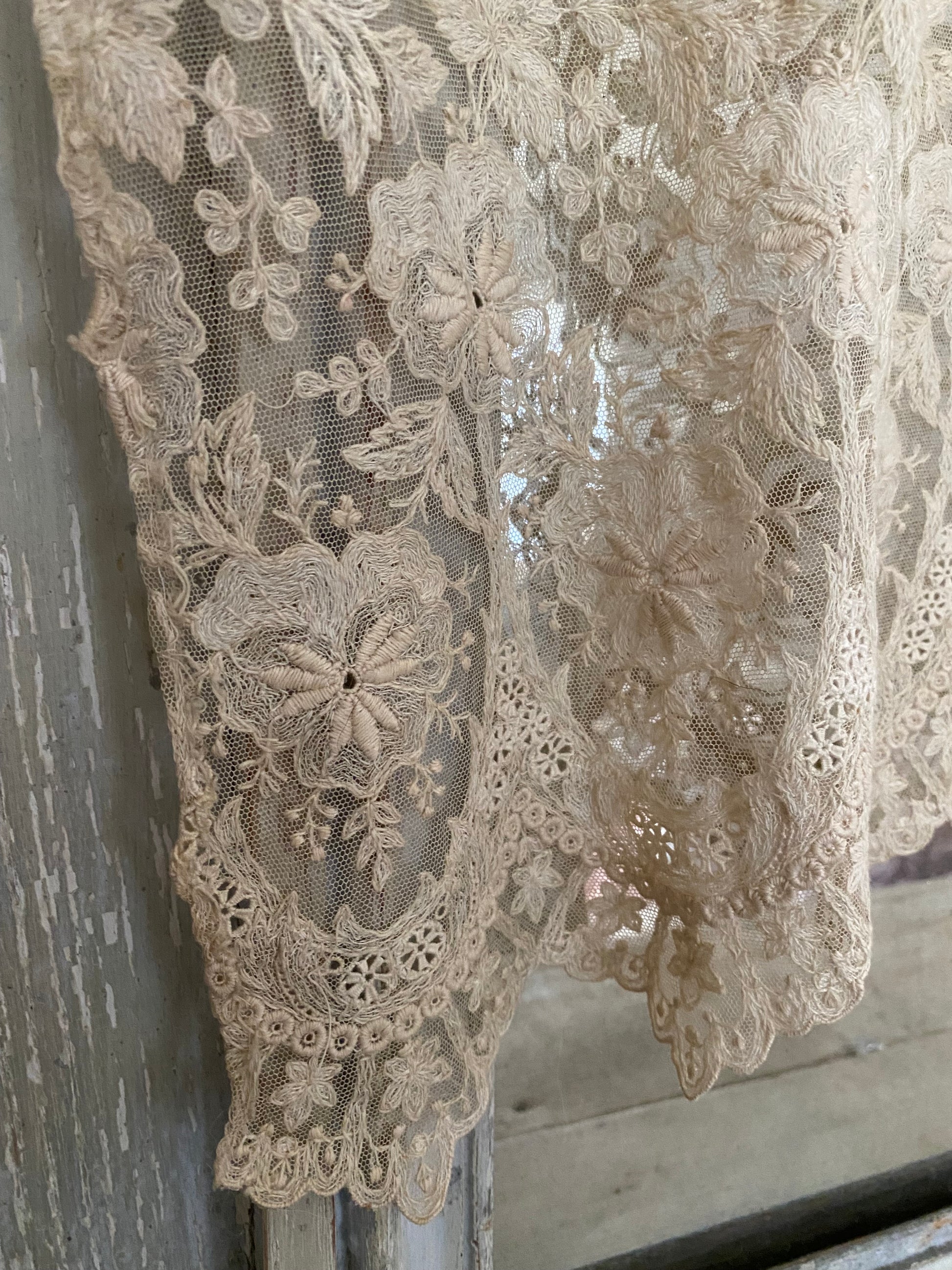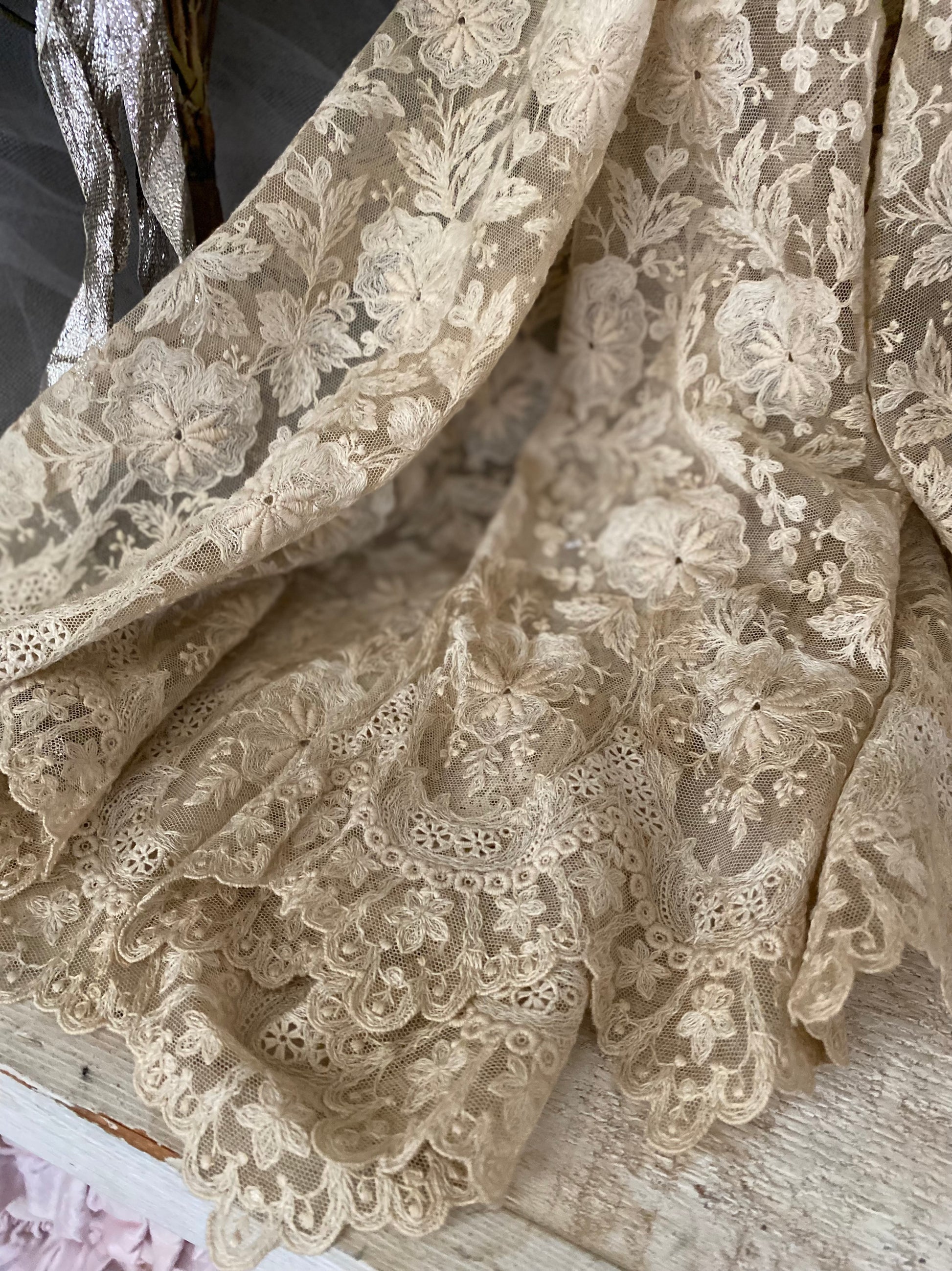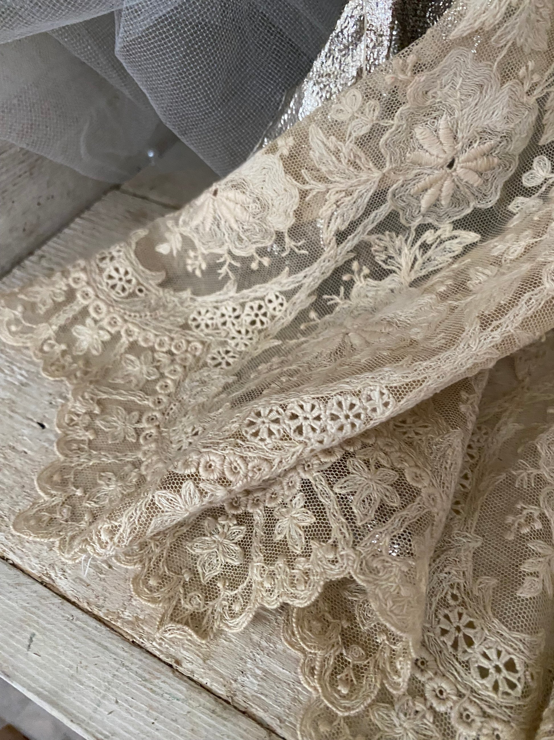 Lovely length of net lace Featuring several different types of lace technique with a floral design and a double scalloped hem