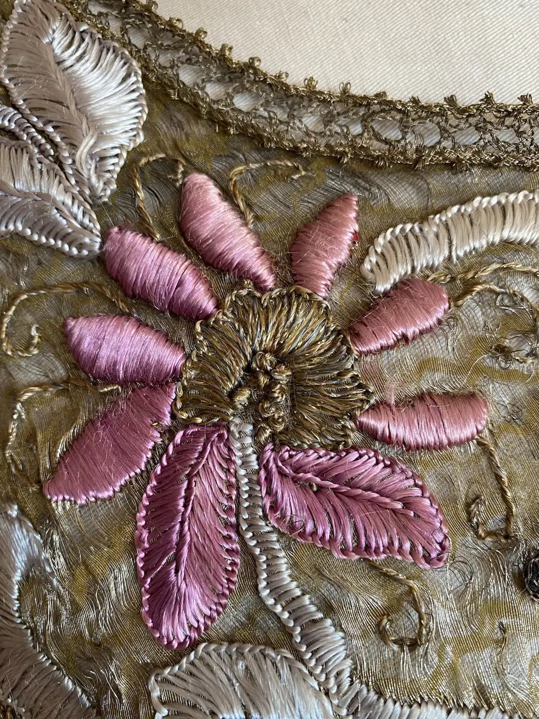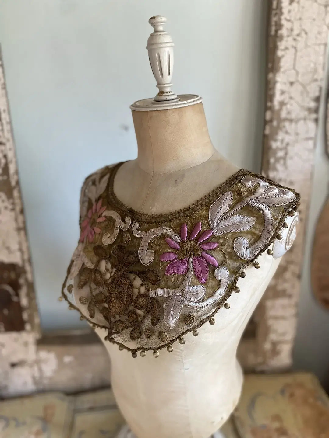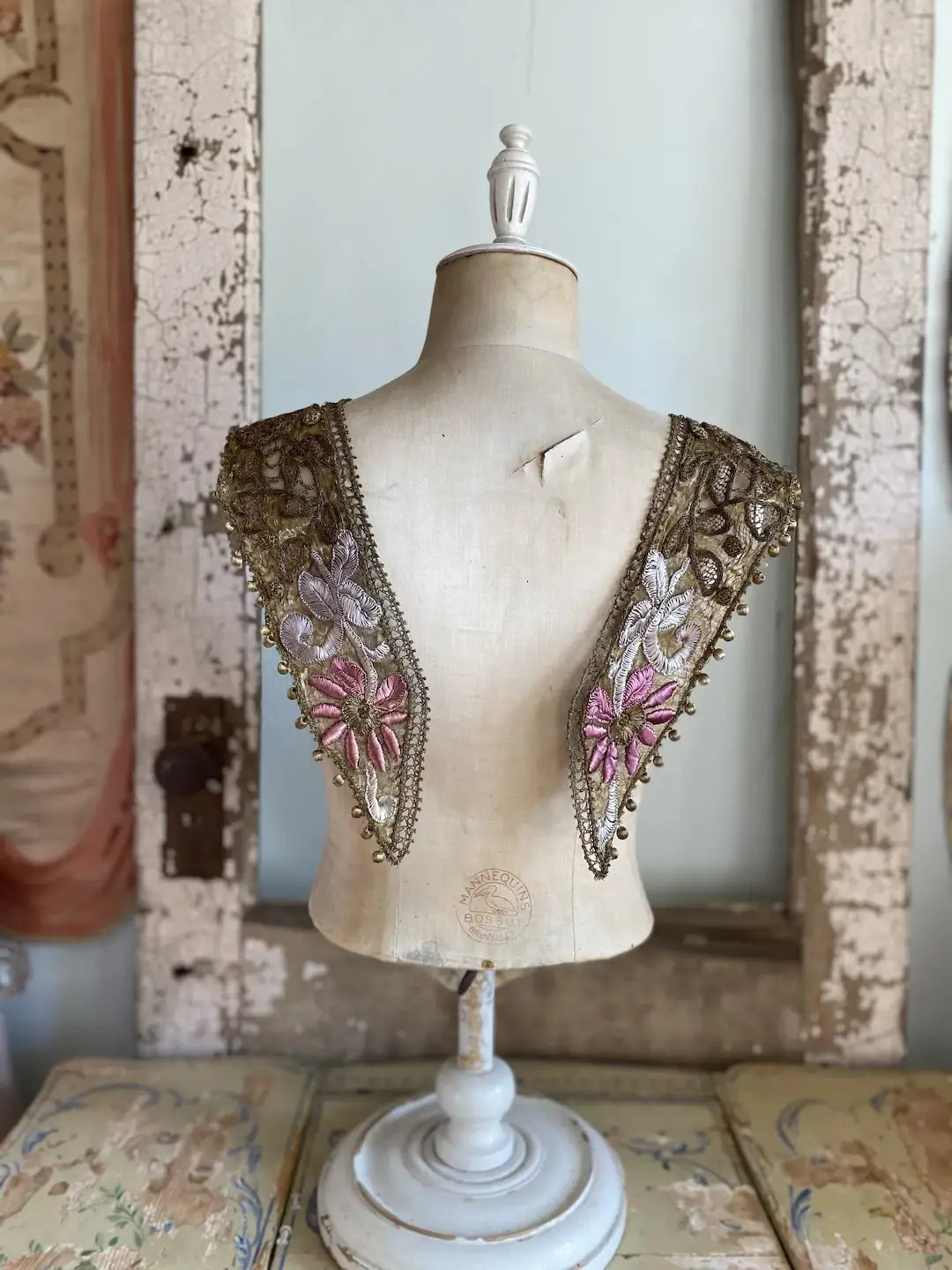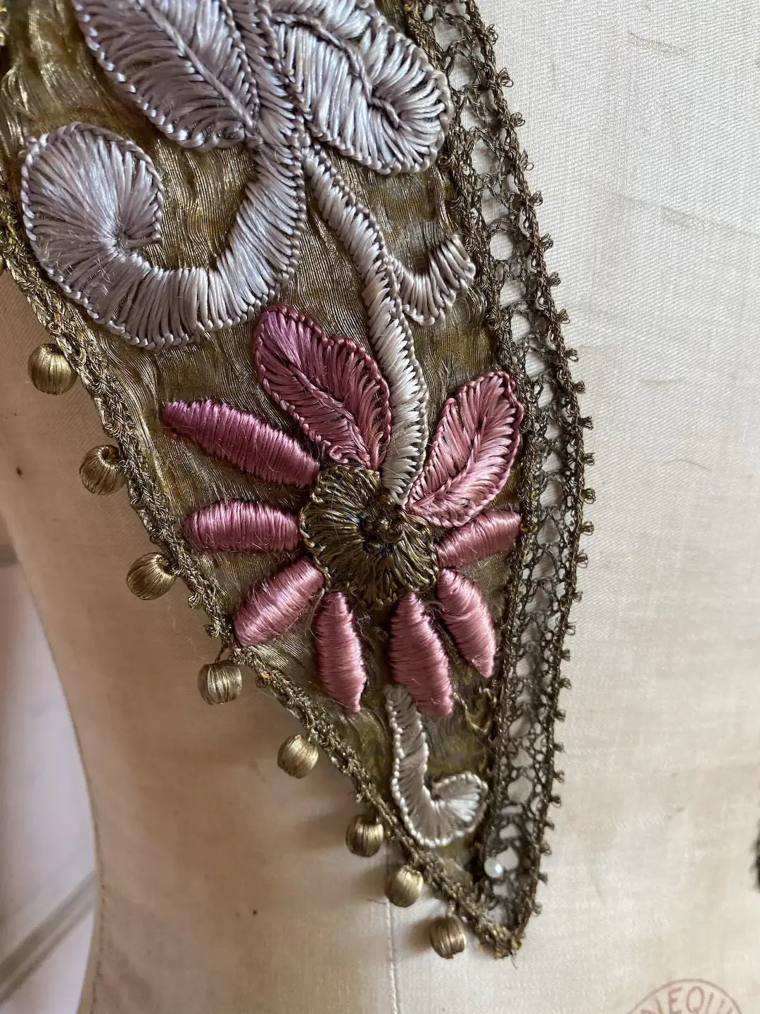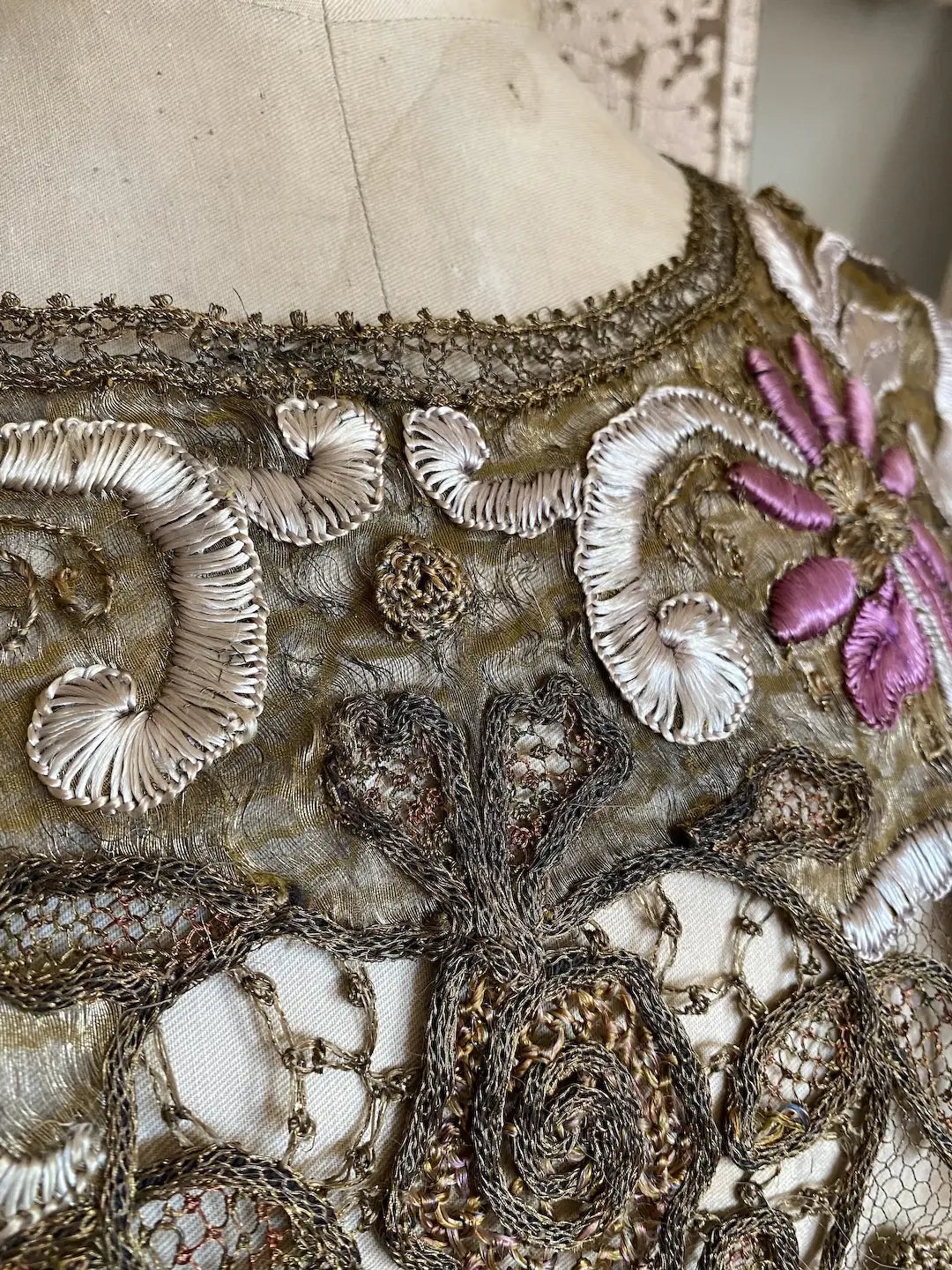 Antique Museum Piece 1920s Collar Gold Lame Lace Silk Embroidered Pink