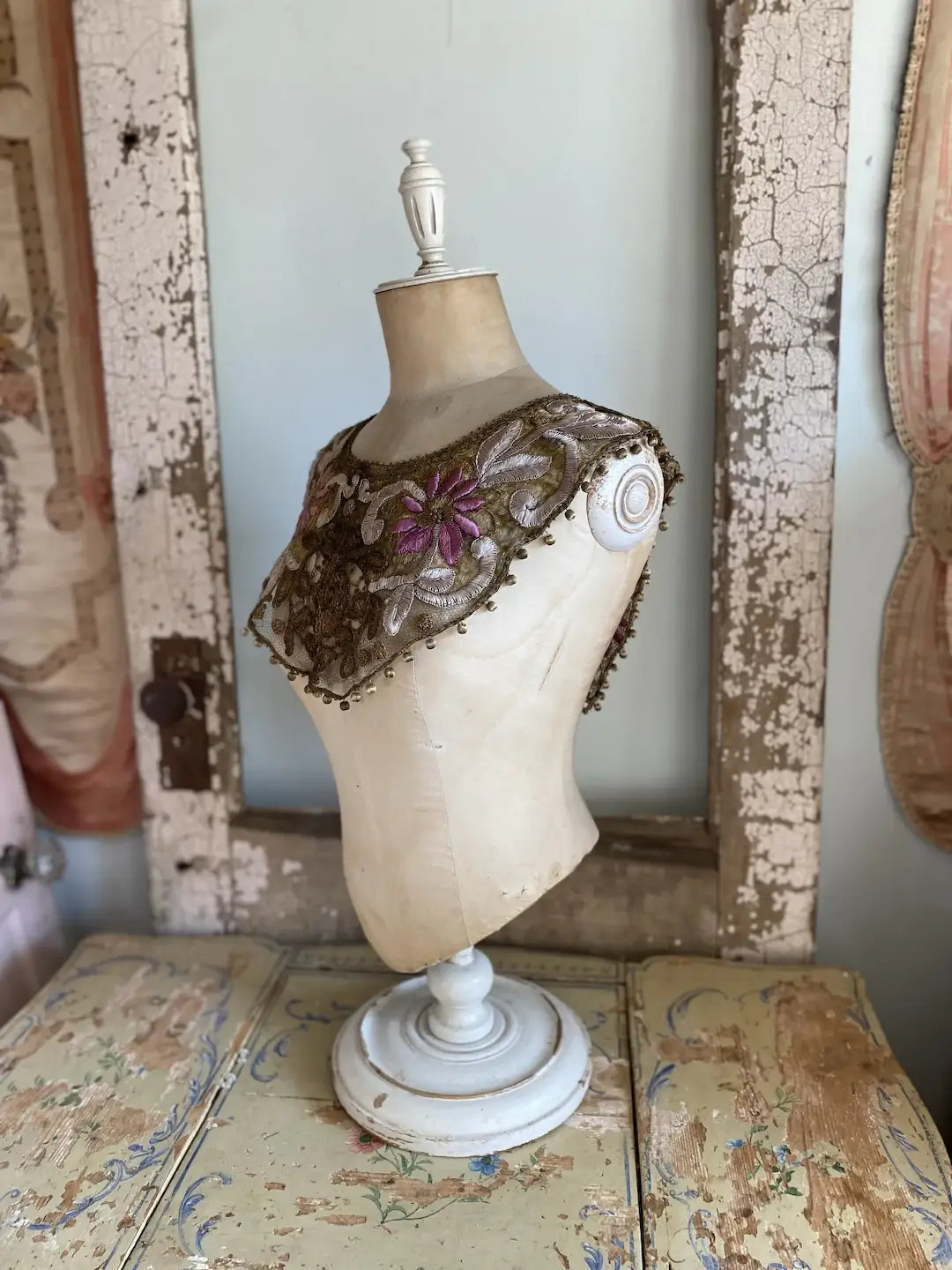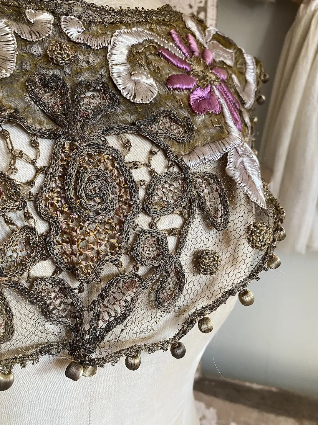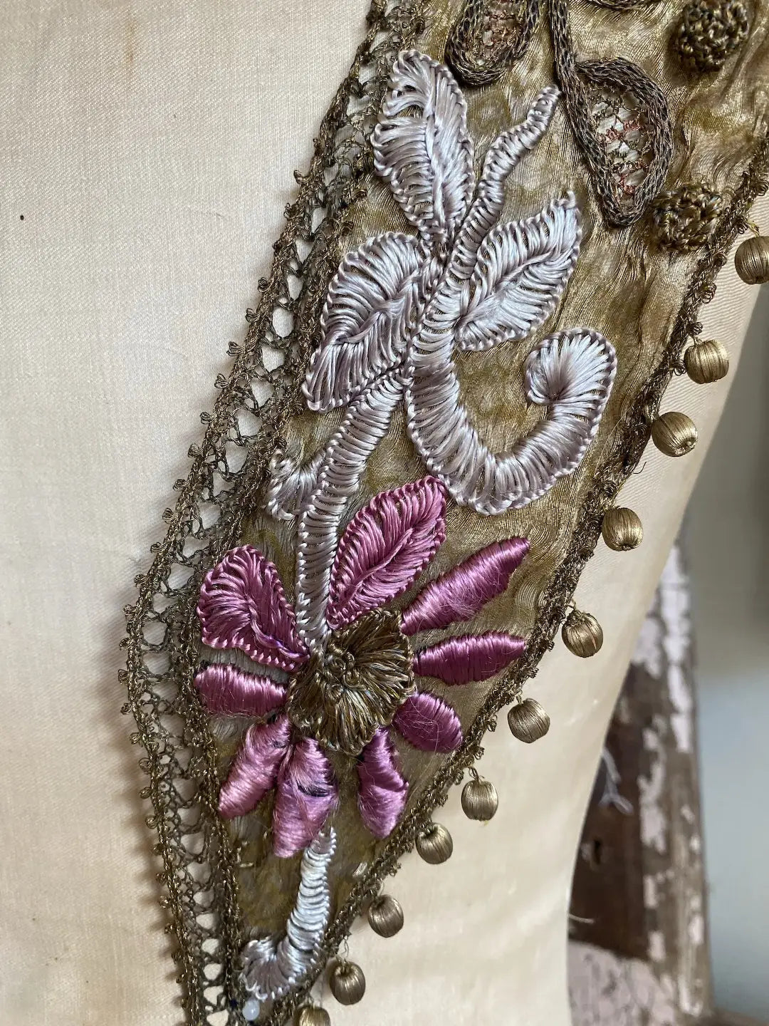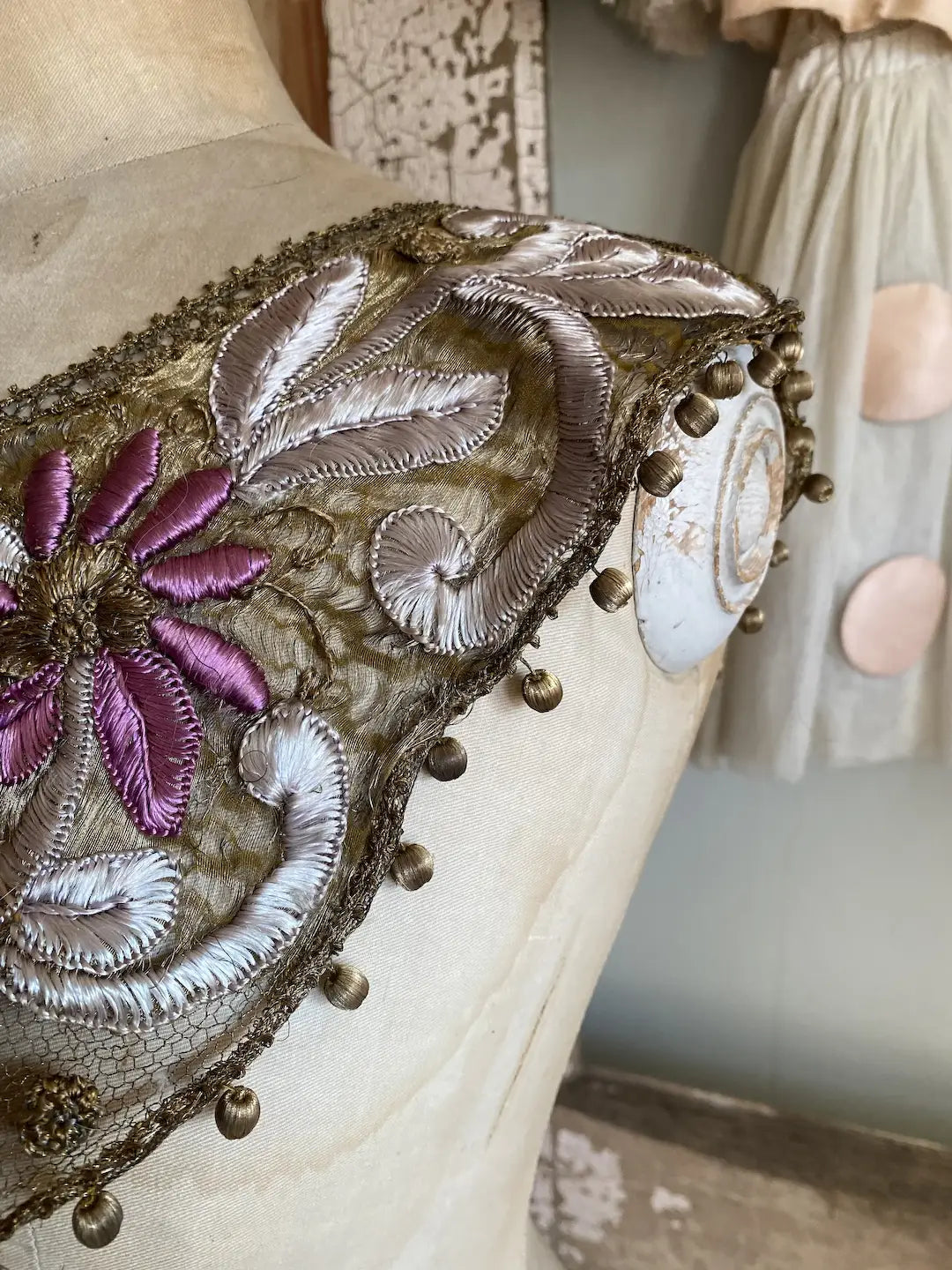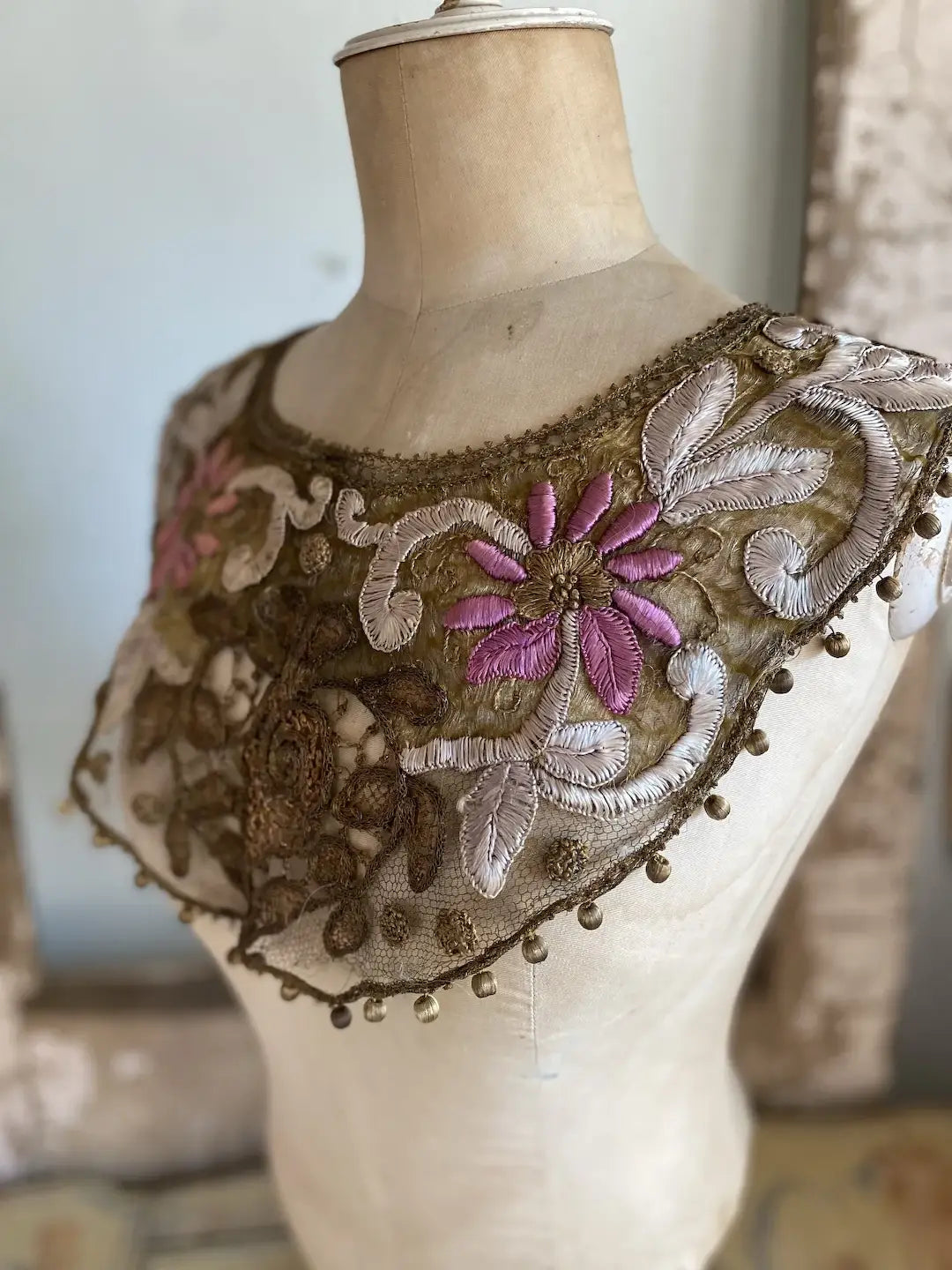 Antique Museum Piece 1920s Flapper Era Collar Dickey Gold Lame Lace Silk Embroidered Mauve Pink Purple Floral Bobble Tassels
