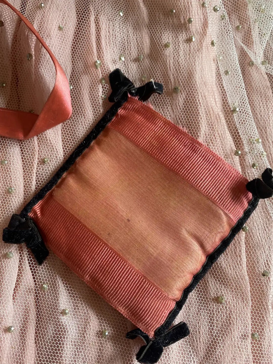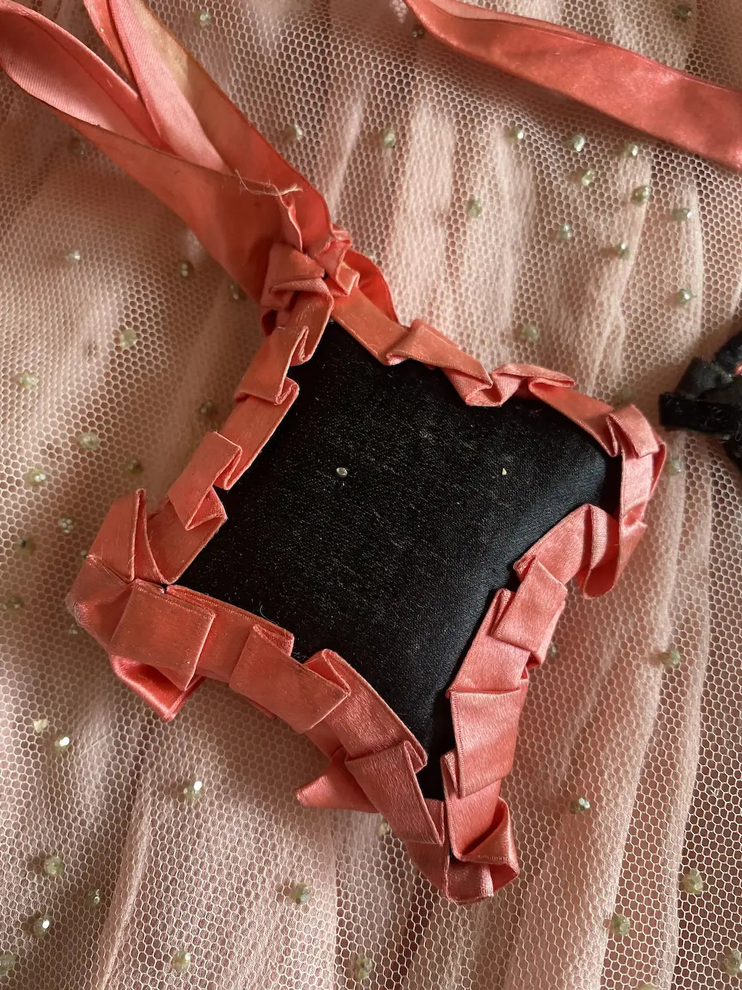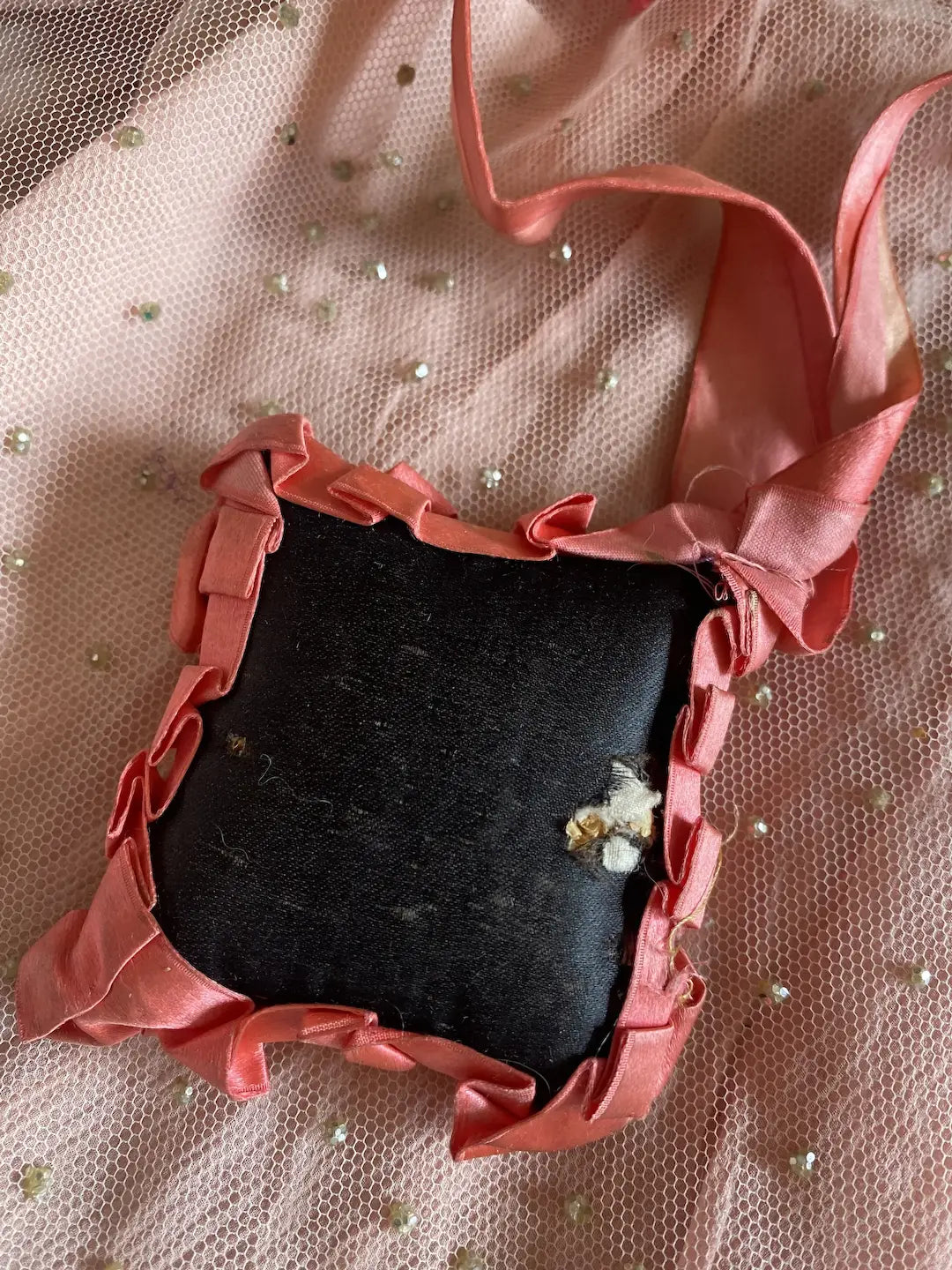 Set 2 Antique Pin Cushion Sachets Pink Black Silk Ribbons Bow Faux Pearls