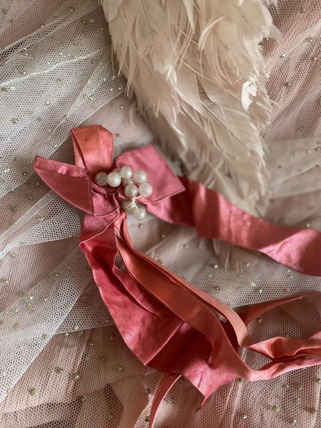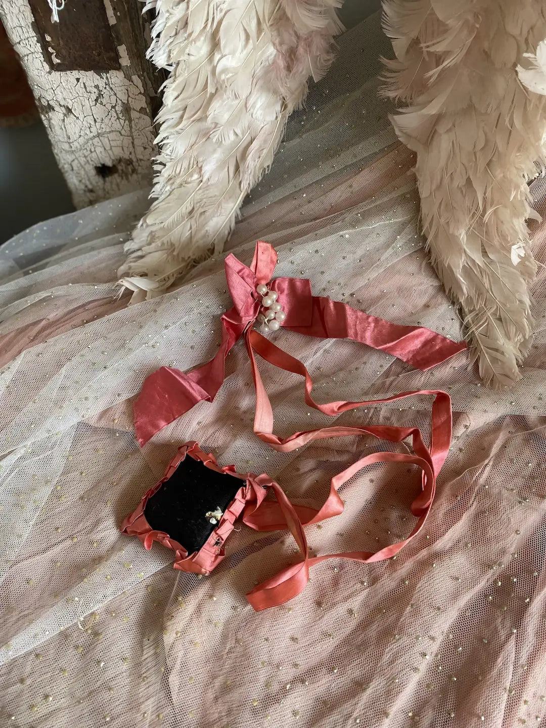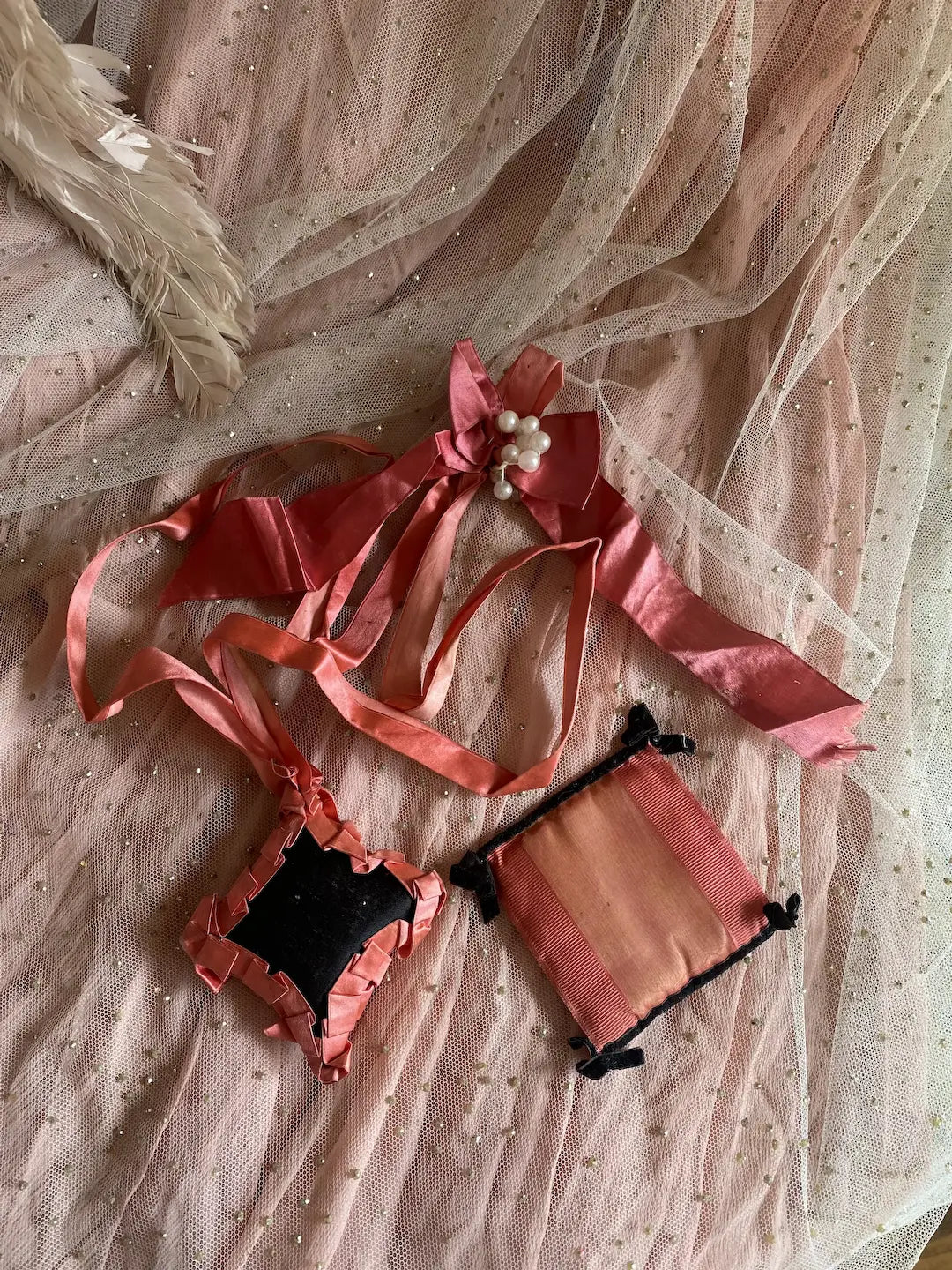 2 Antique Pin Cushion Sachets Pink Silk Ribbons Bow Pearls