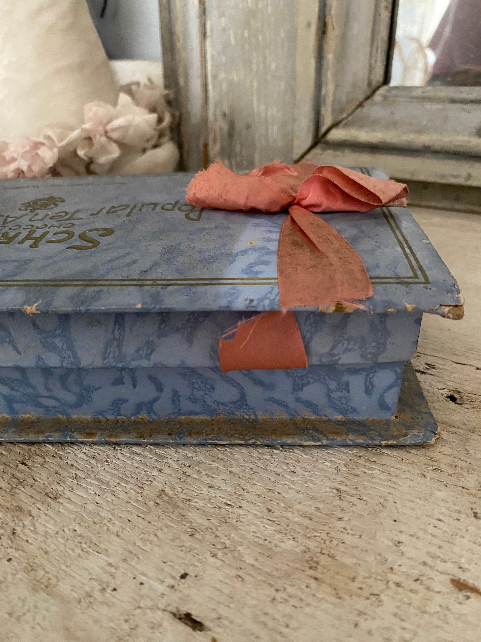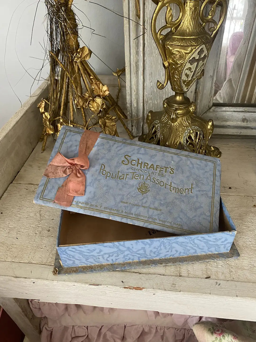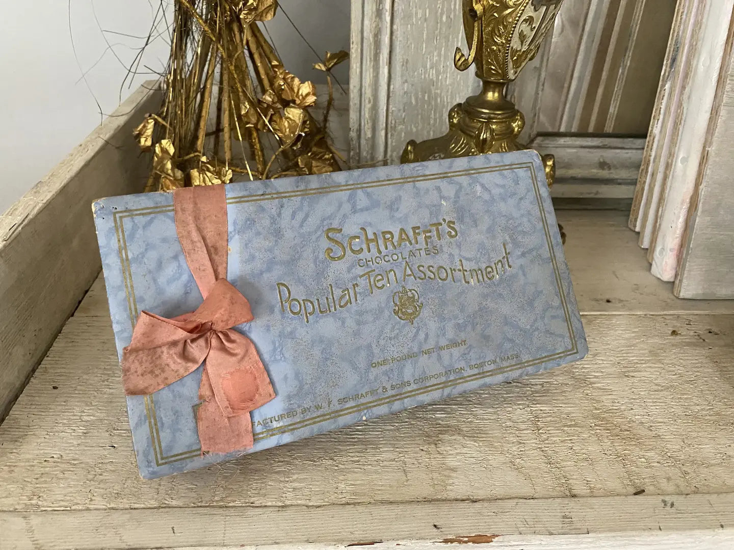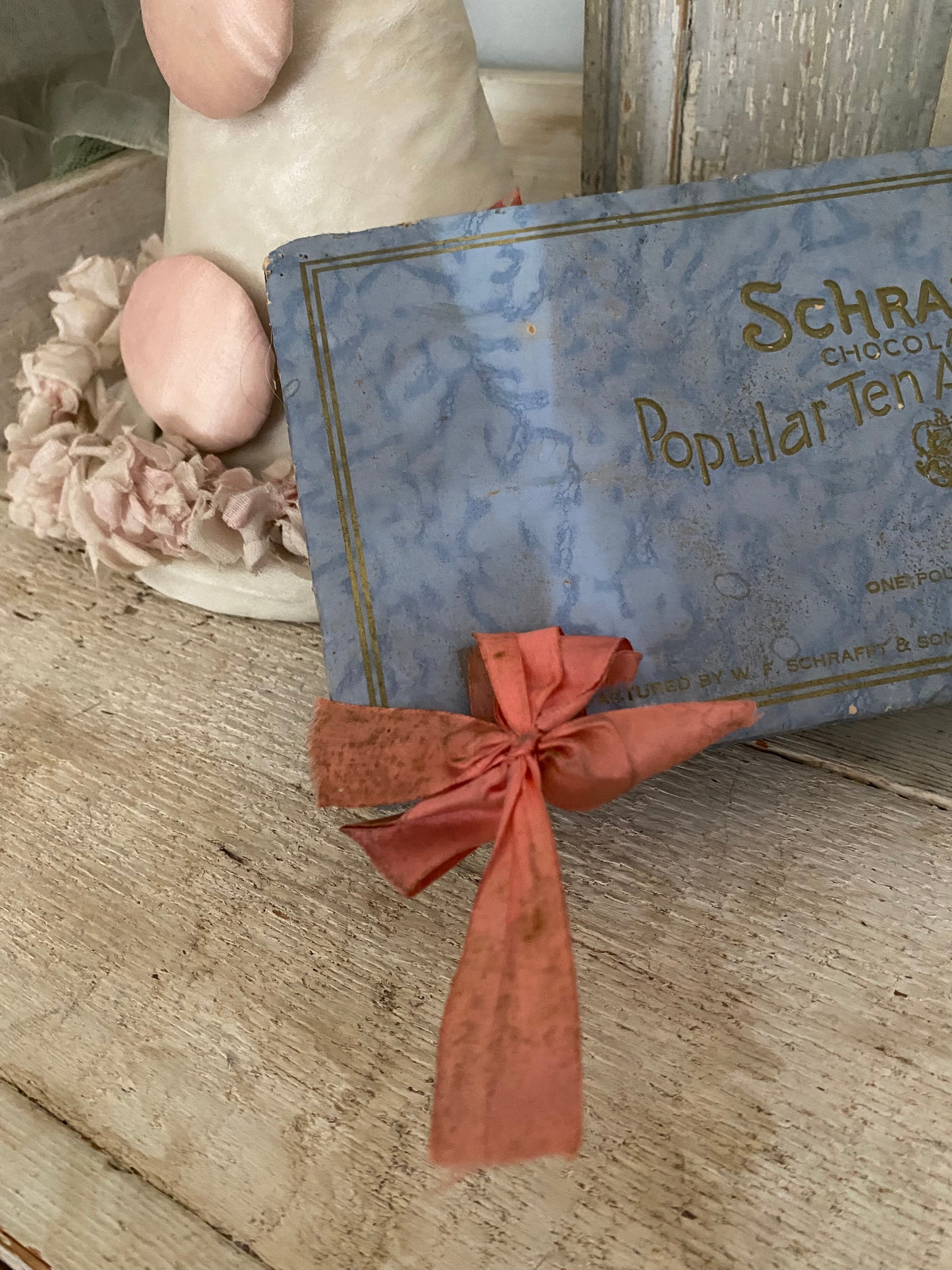 Antique Chocolate Candy Box Schraffts Blue Marble Pink Ribbon Bow Shabby Chic