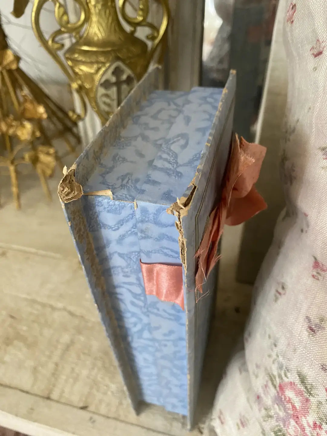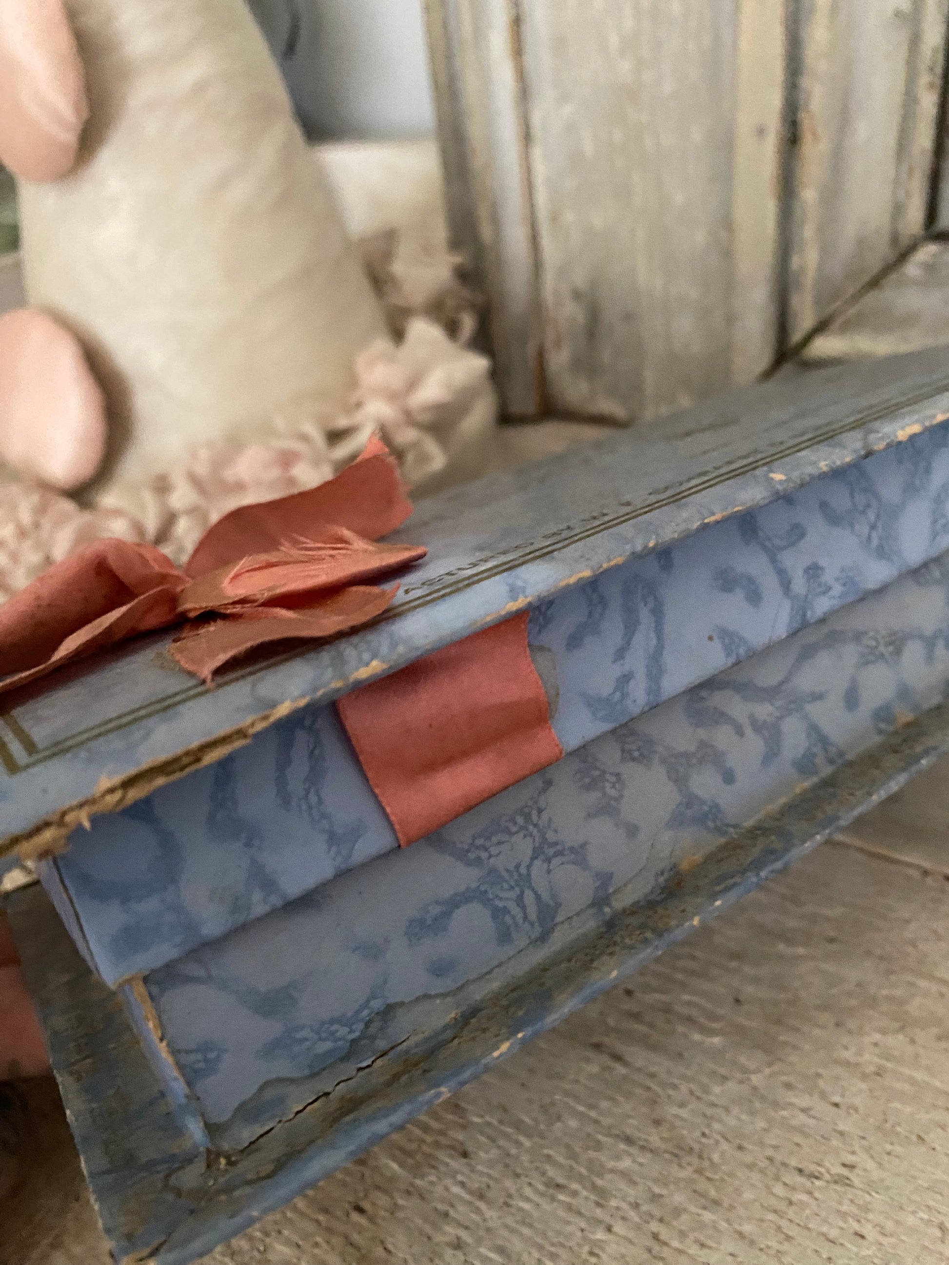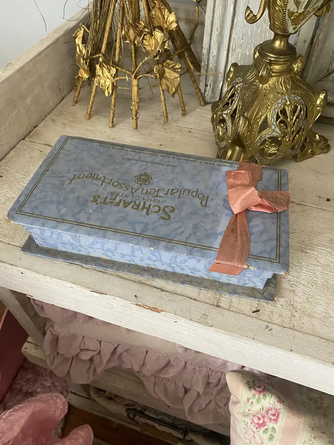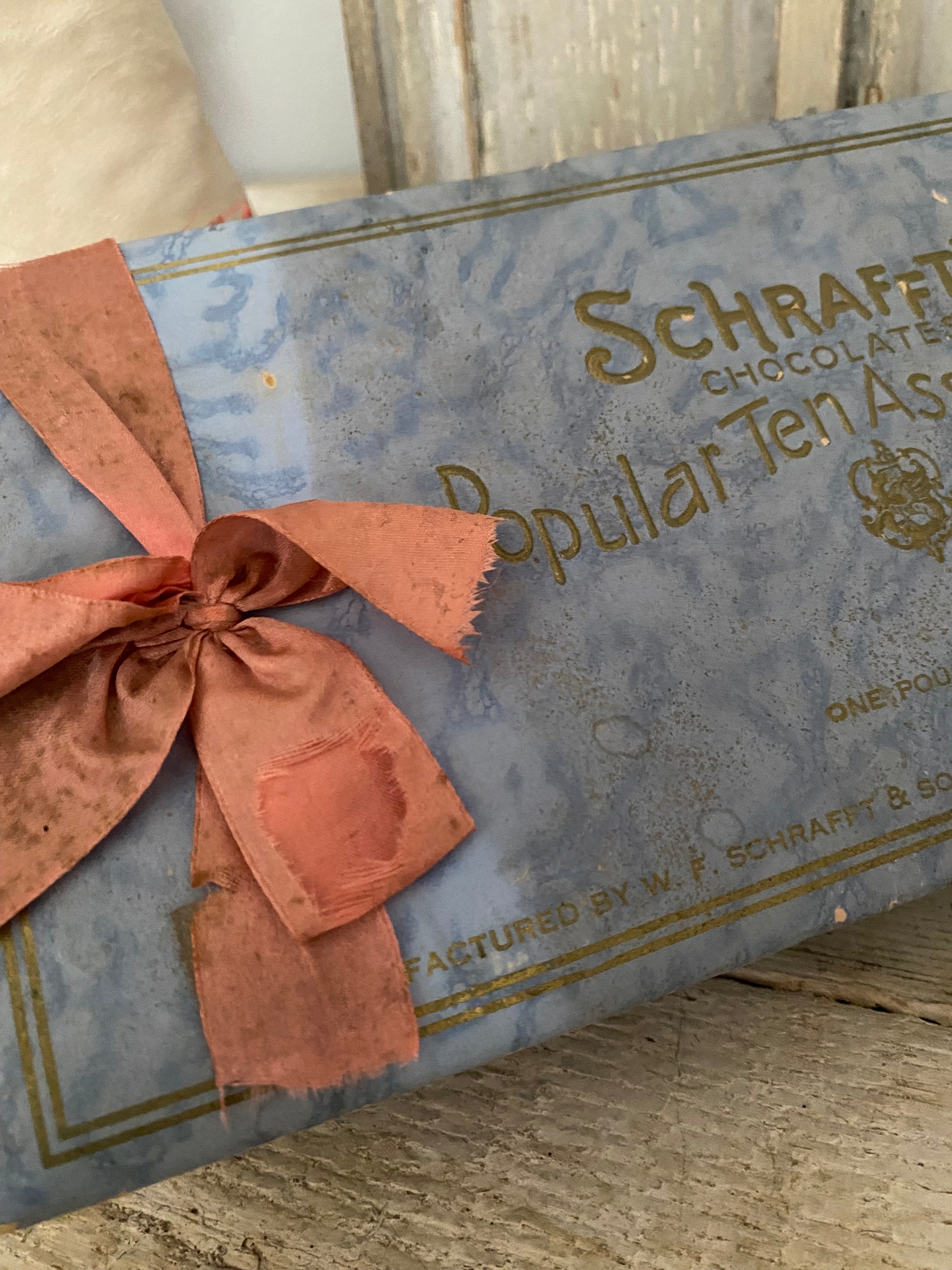 Antique Chocolate Candy Box Schraffts Blue Marble Pink Ribbon Bow Shabby Chic