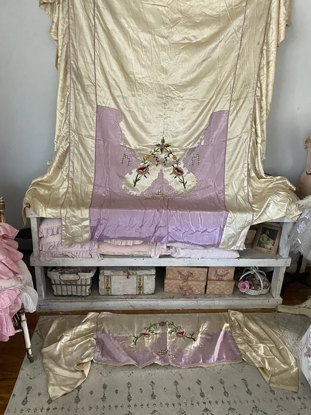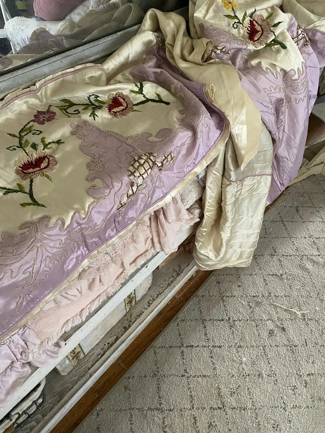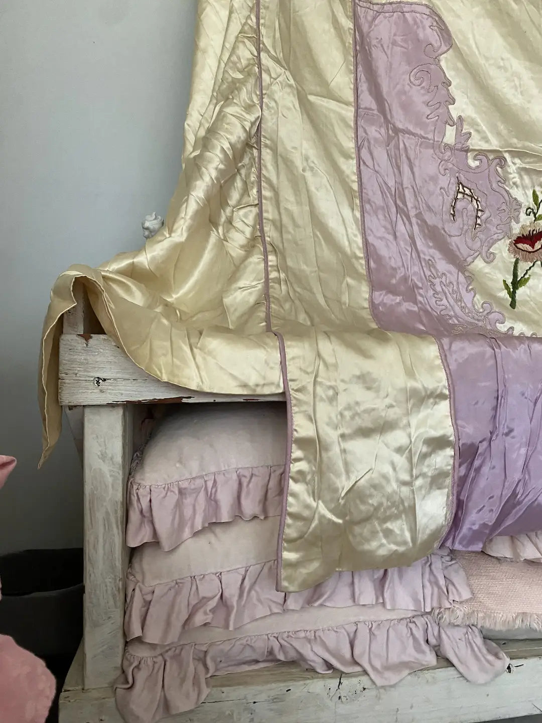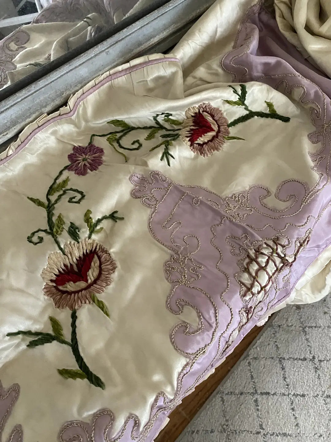Vintage 1930s Satin Boudoir Bedspread Coverlet & Sham Lavender Cream Chenille Art Deco Floral