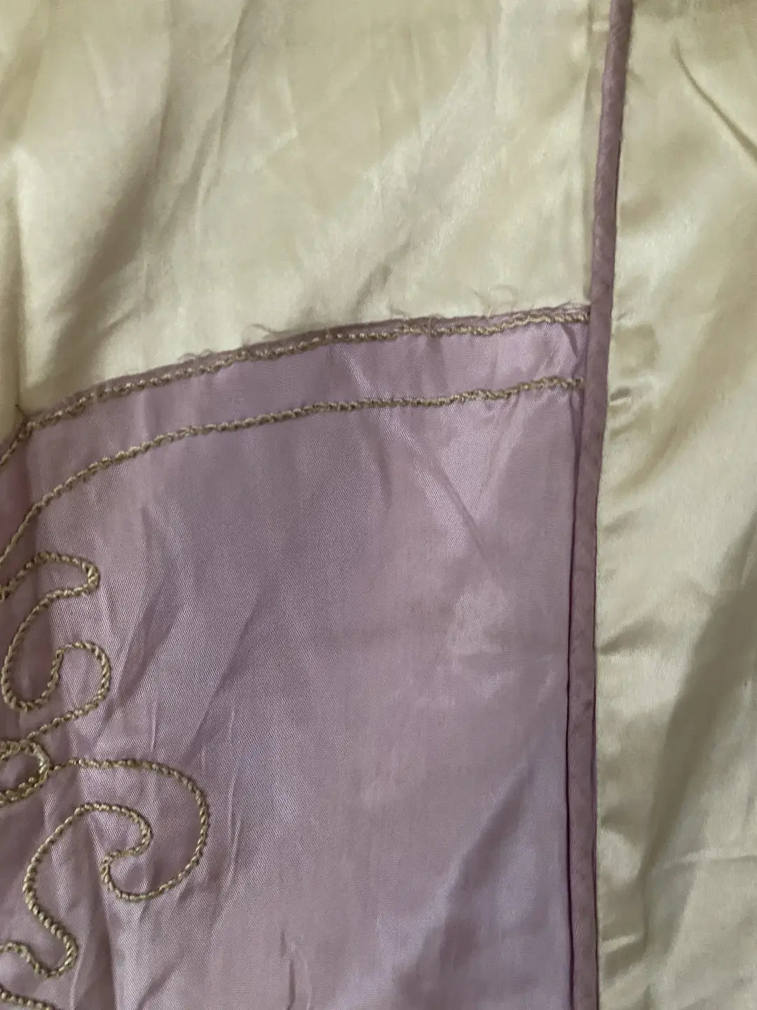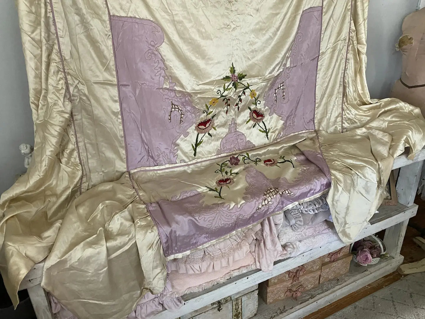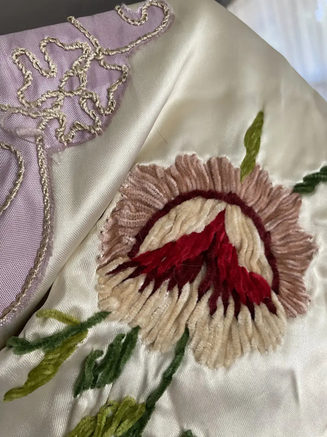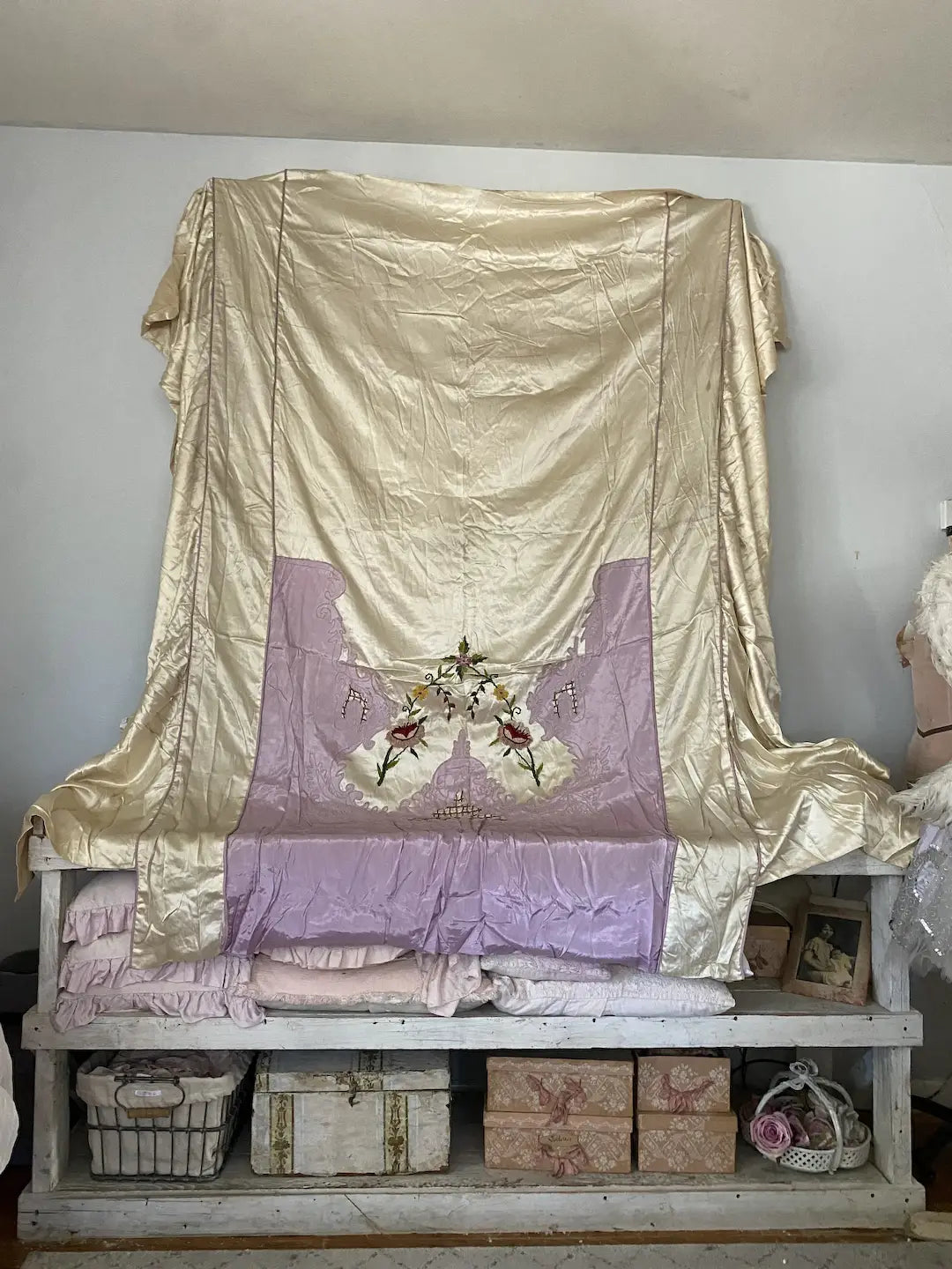 Vintage 1930s Satin Boudoir Bedspread Coverlet & Sham Lavender Cream Chenille Art Deco Floral