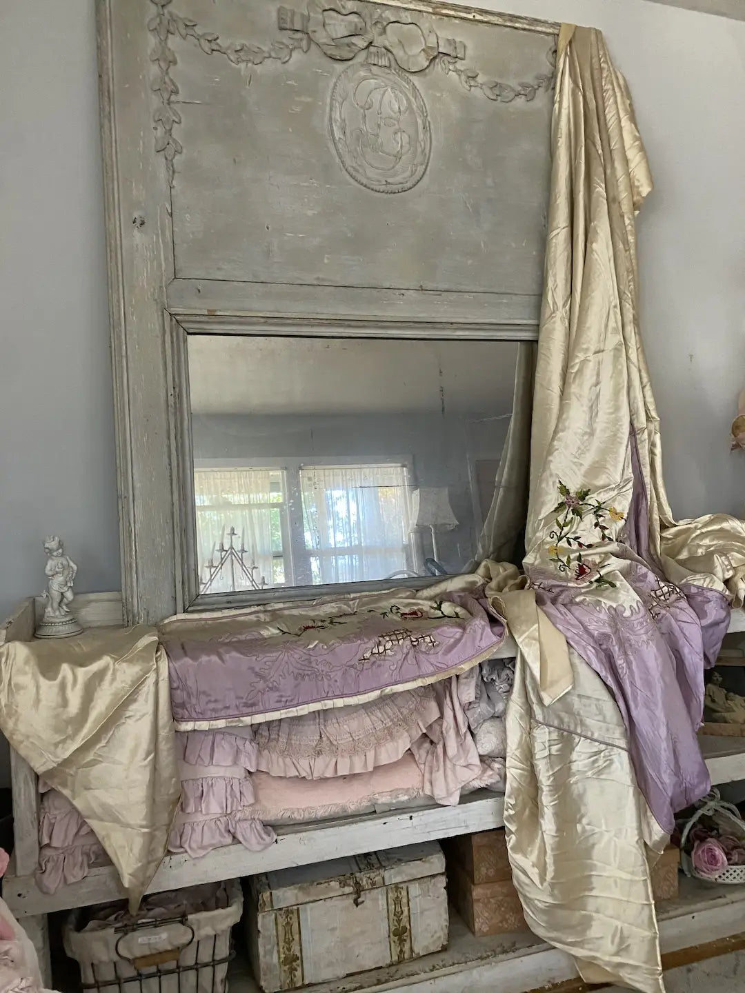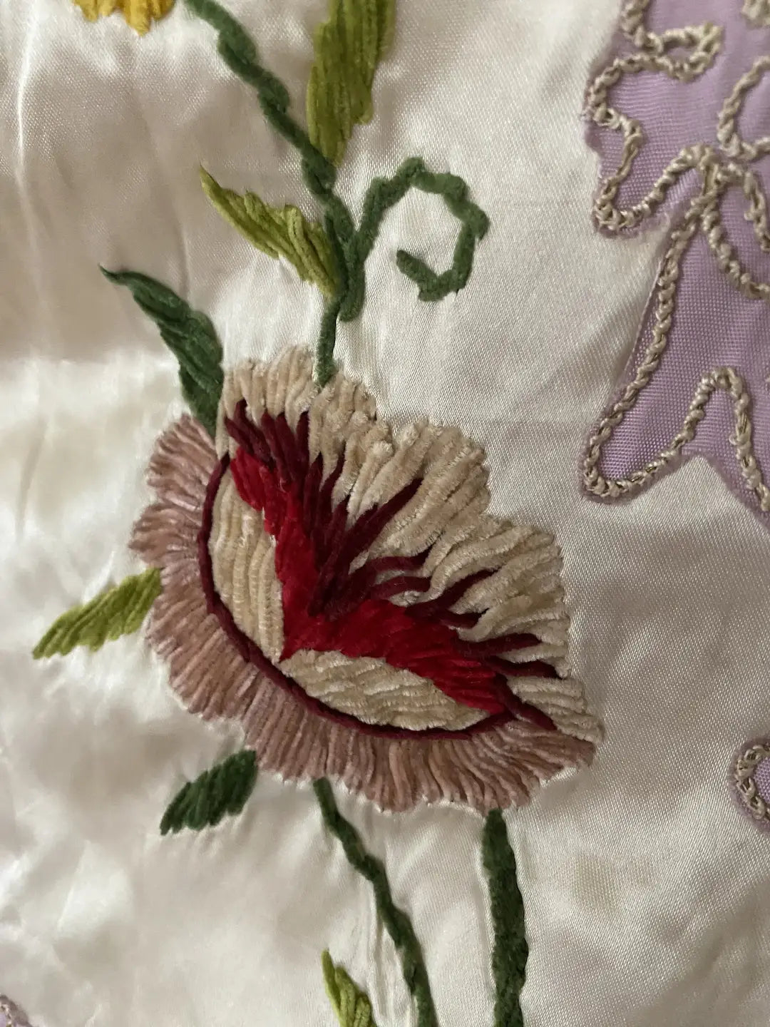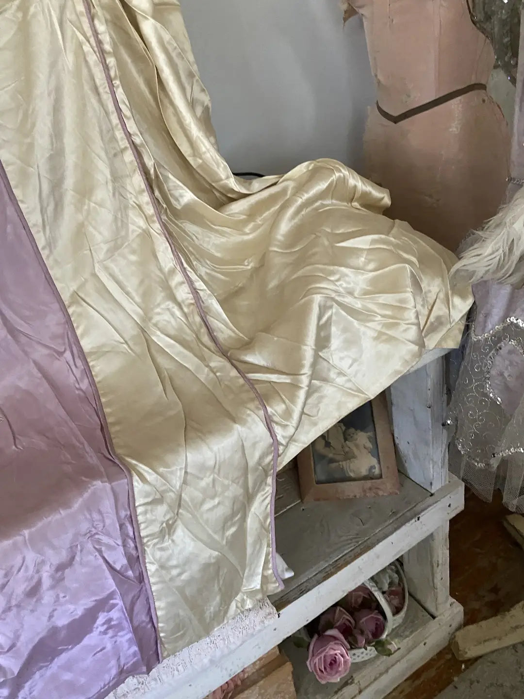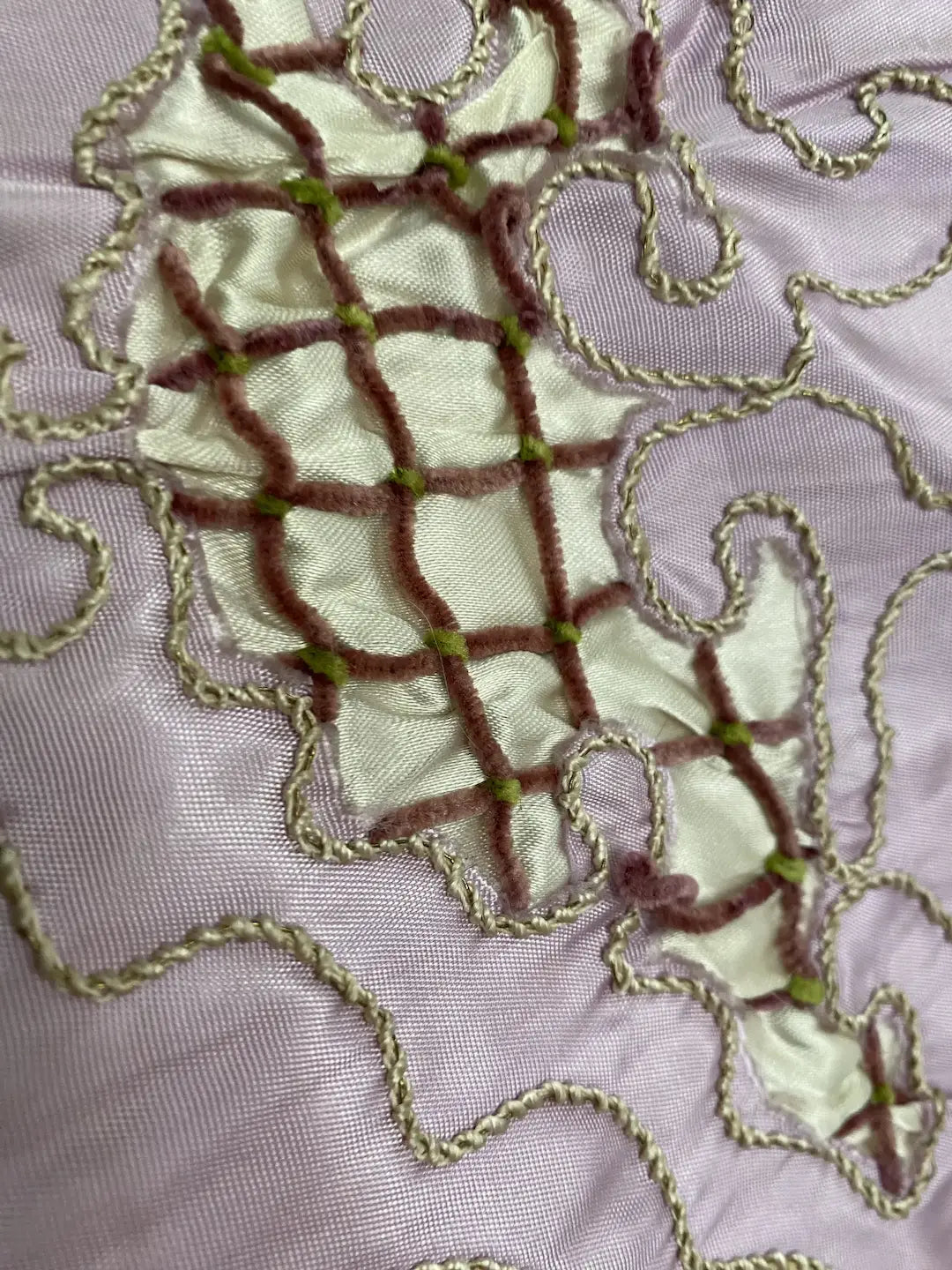 Vintage 1930s Satin Boudoir Bedspread Coverlet & Sham Lavender Cream Chenille Art Deco Floral