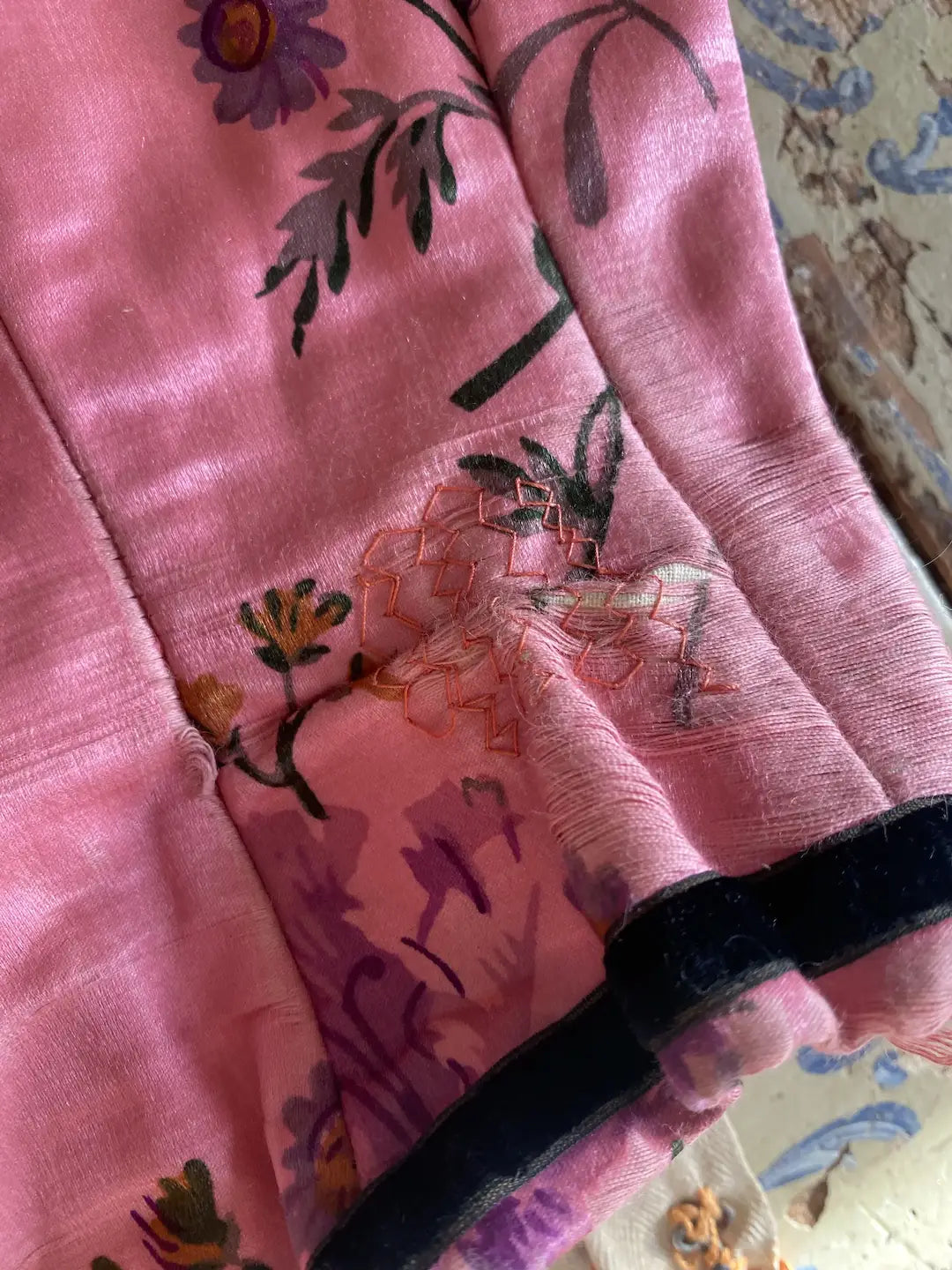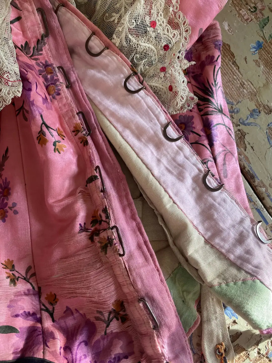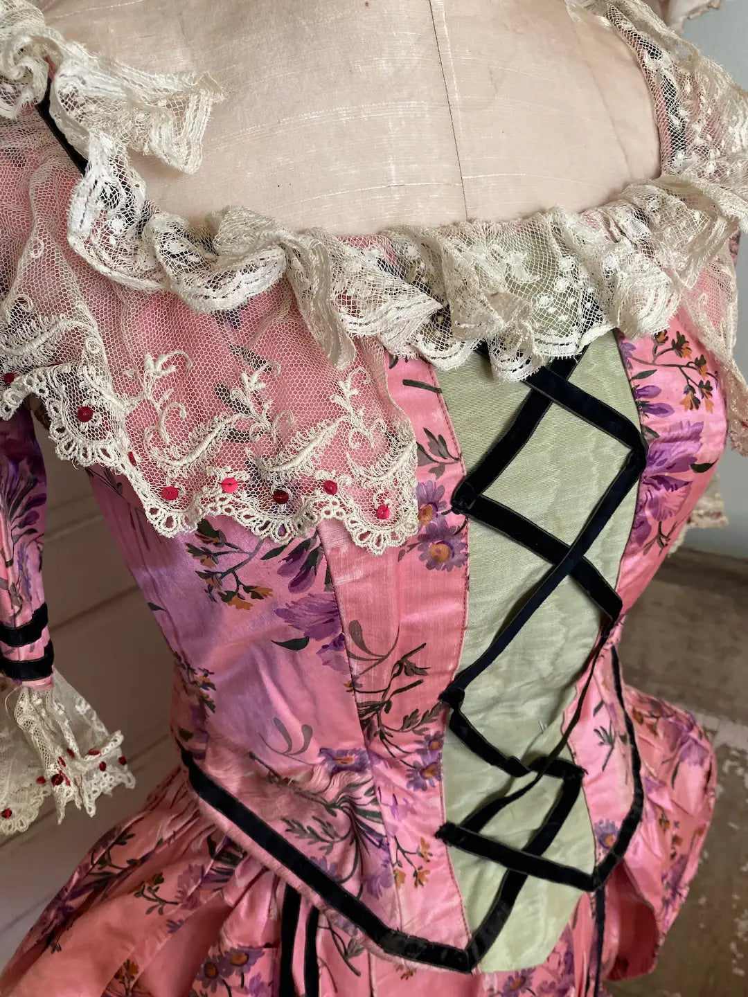 Pink floral silk with green chest panel and black velvet ribbon trim, lace cuffs and collar with red sequin detail, fully bonned, hook and eye closure