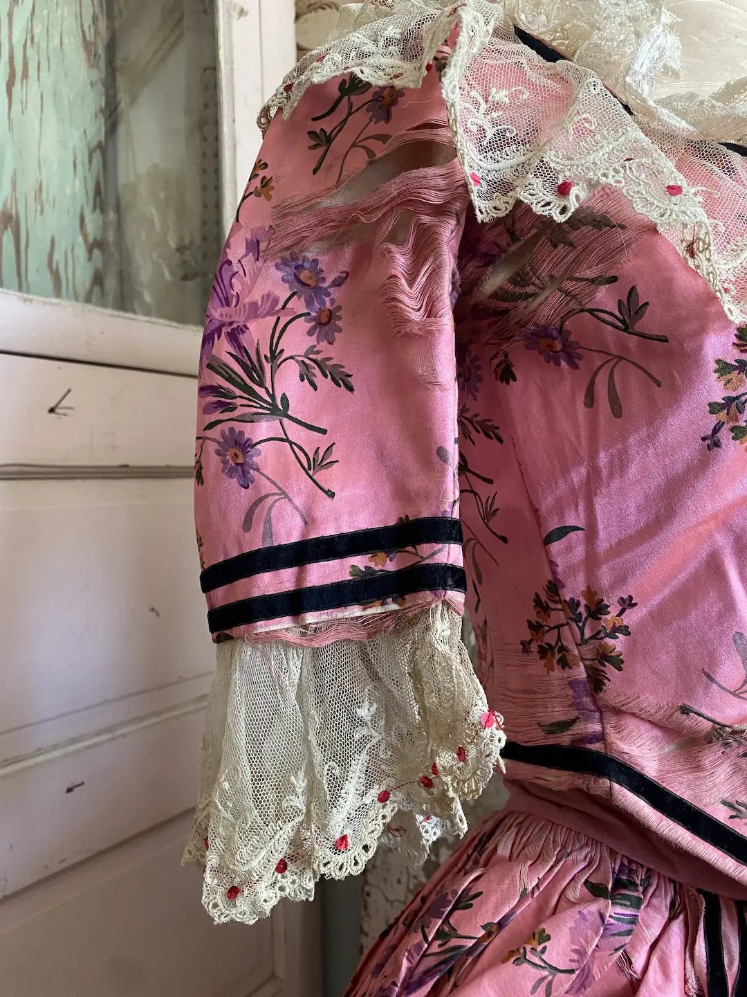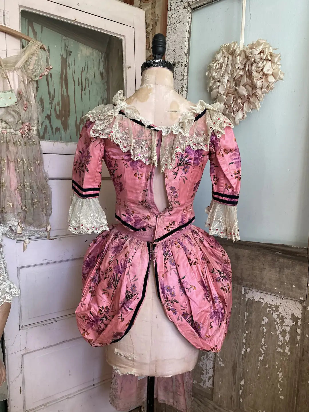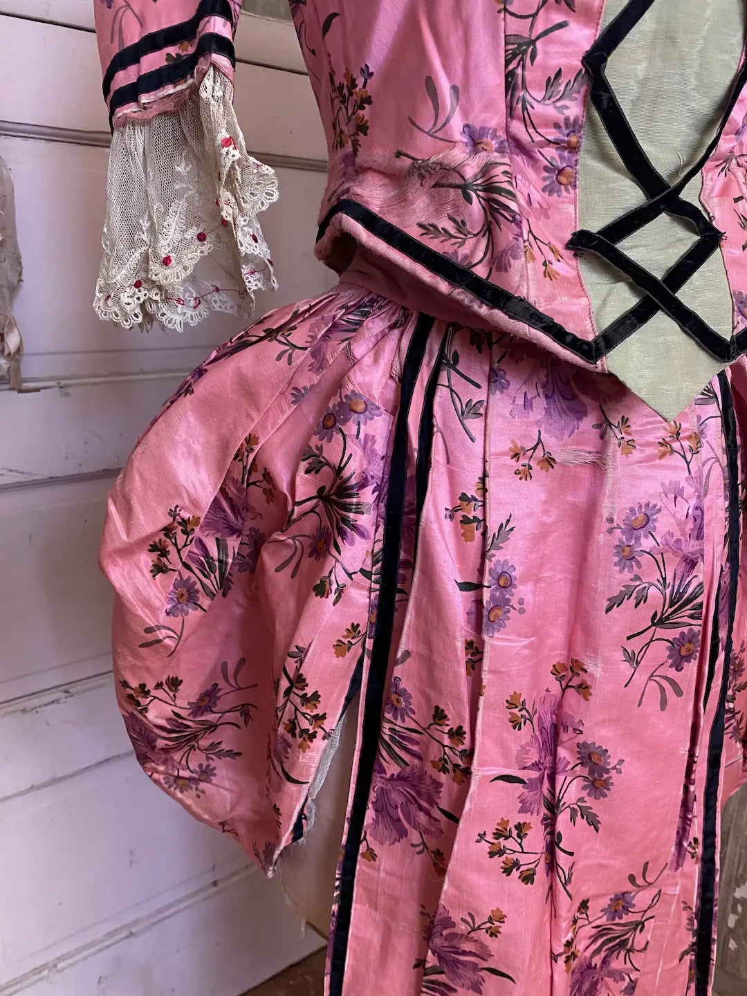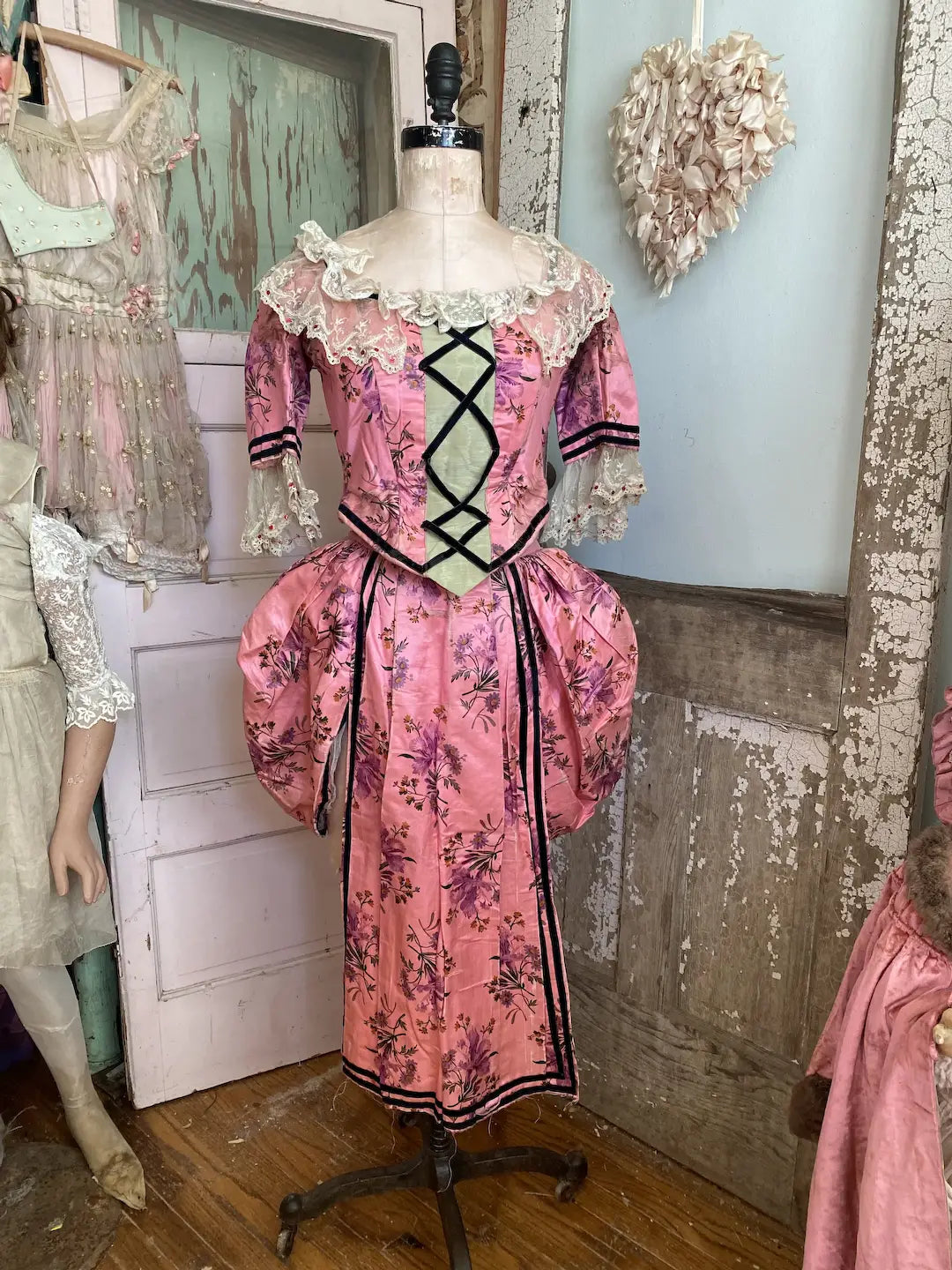 STUNNING Antique French Theater Costume Pink Silk Purple Flowers Bodice Pannier Skirt Lace Trim Marie Antoinette