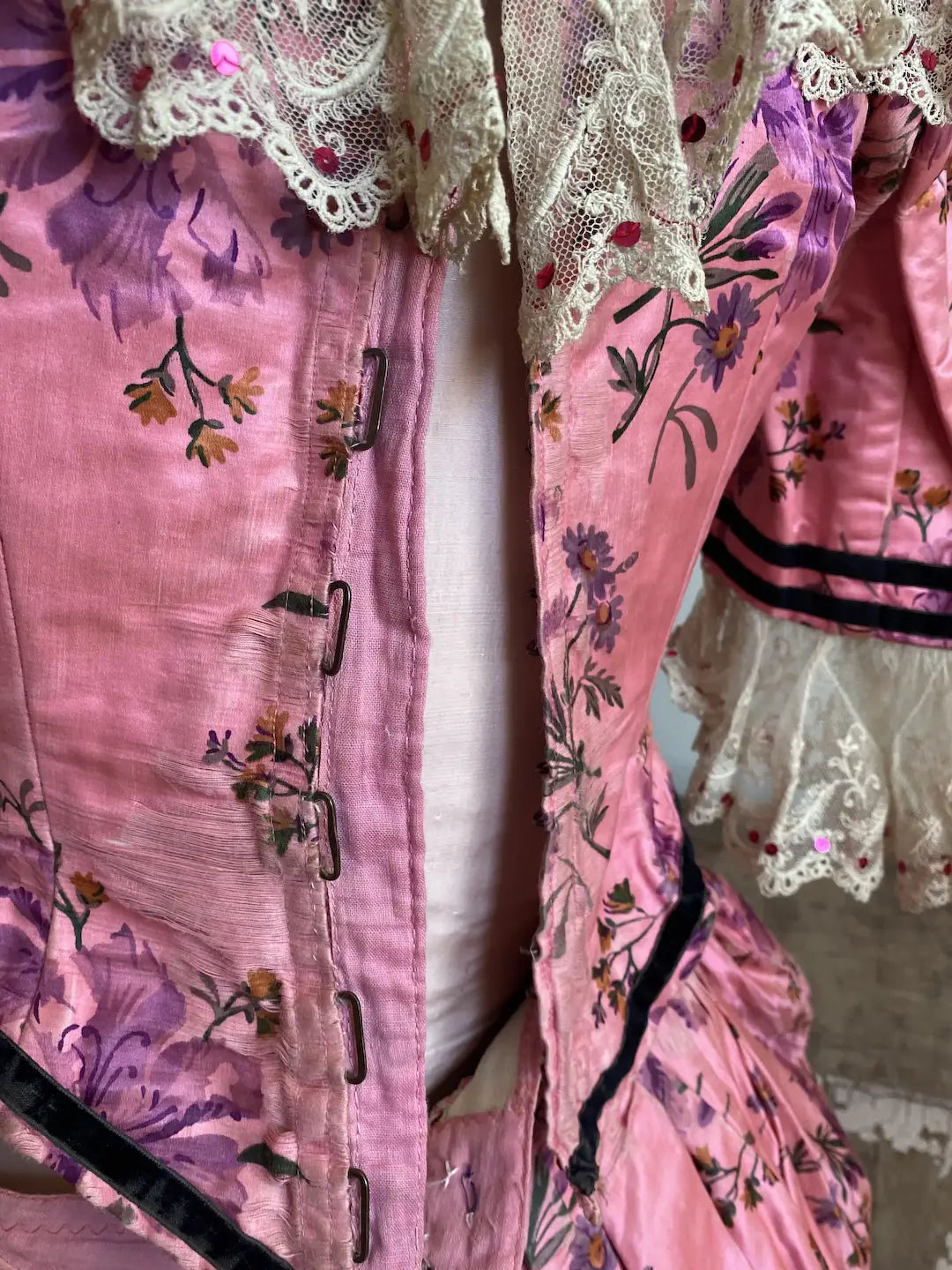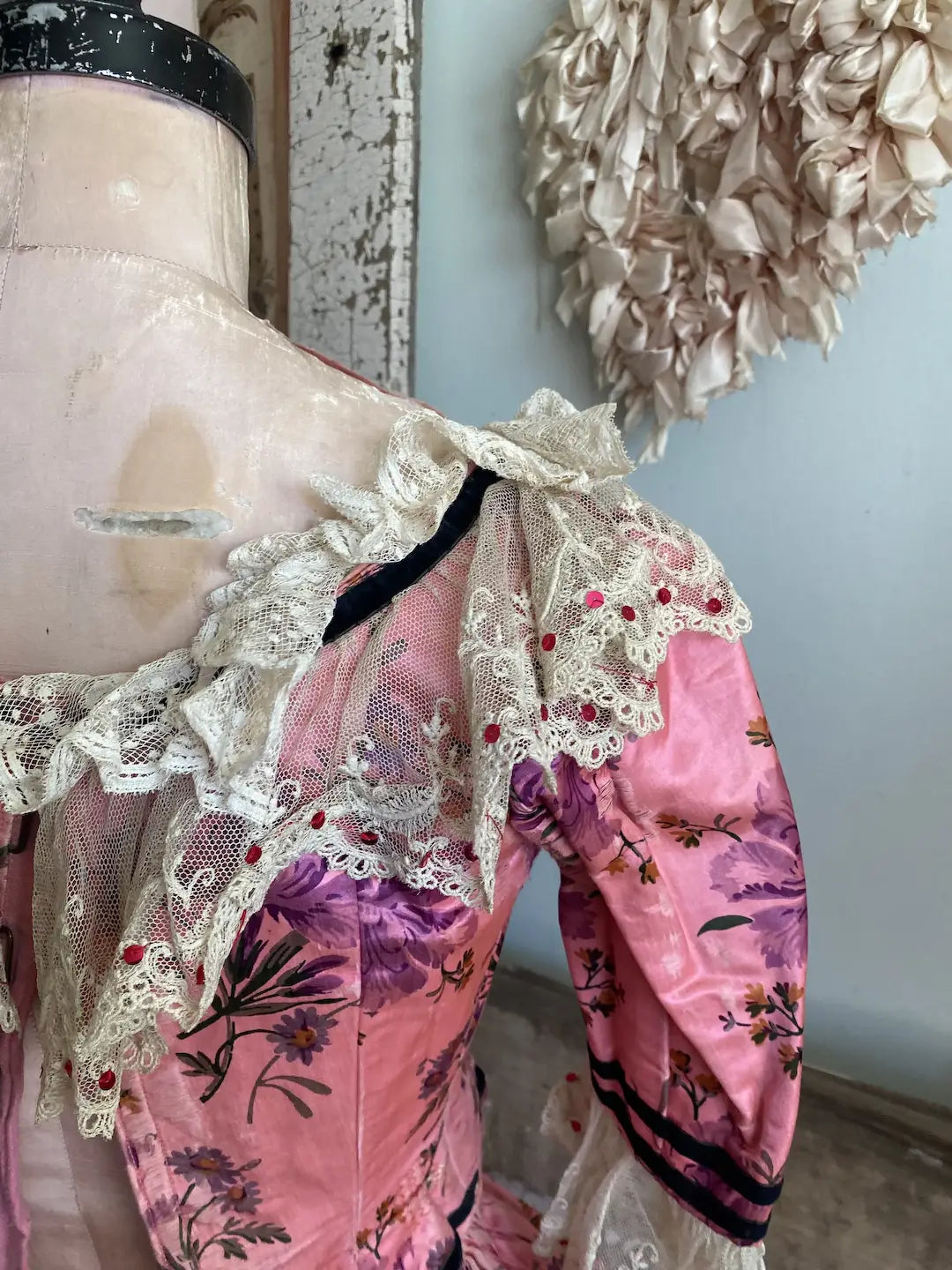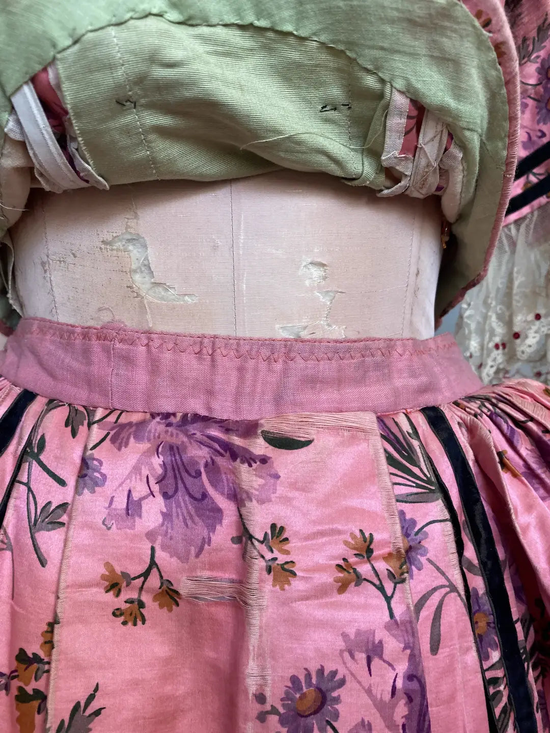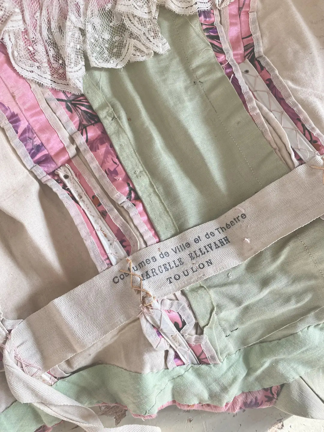 STUNNING Antique French Theater Costume Pink Silk Purple Flowers Bodice Pannier Skirt Lace Trim Marie Antoinette