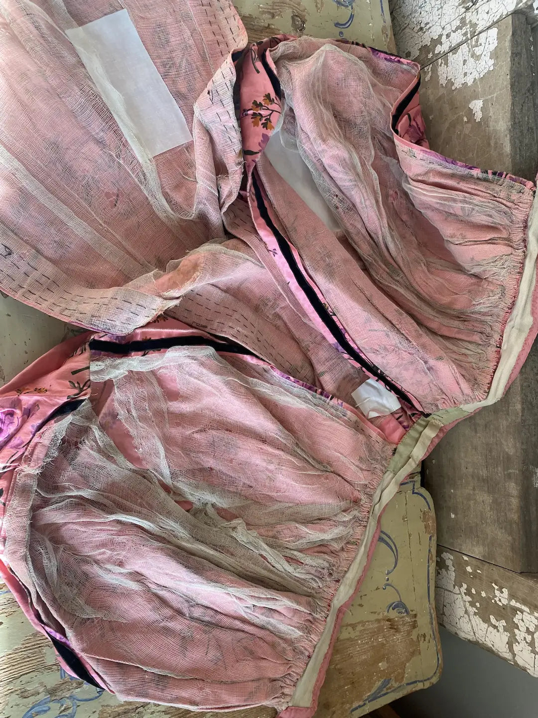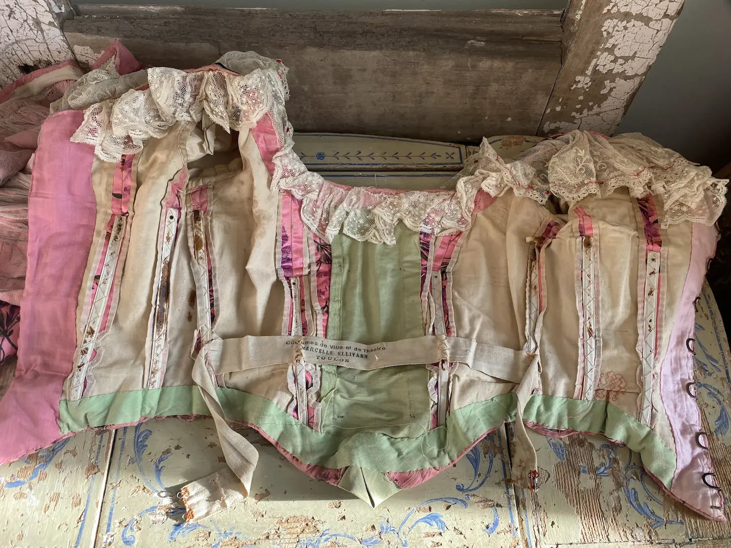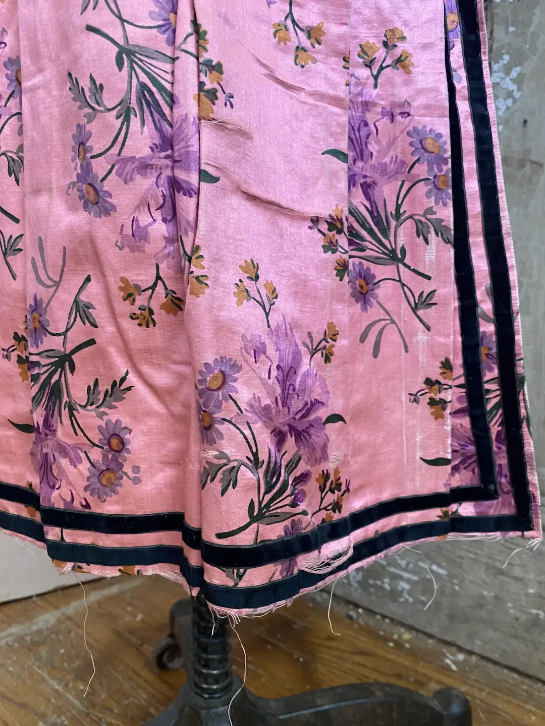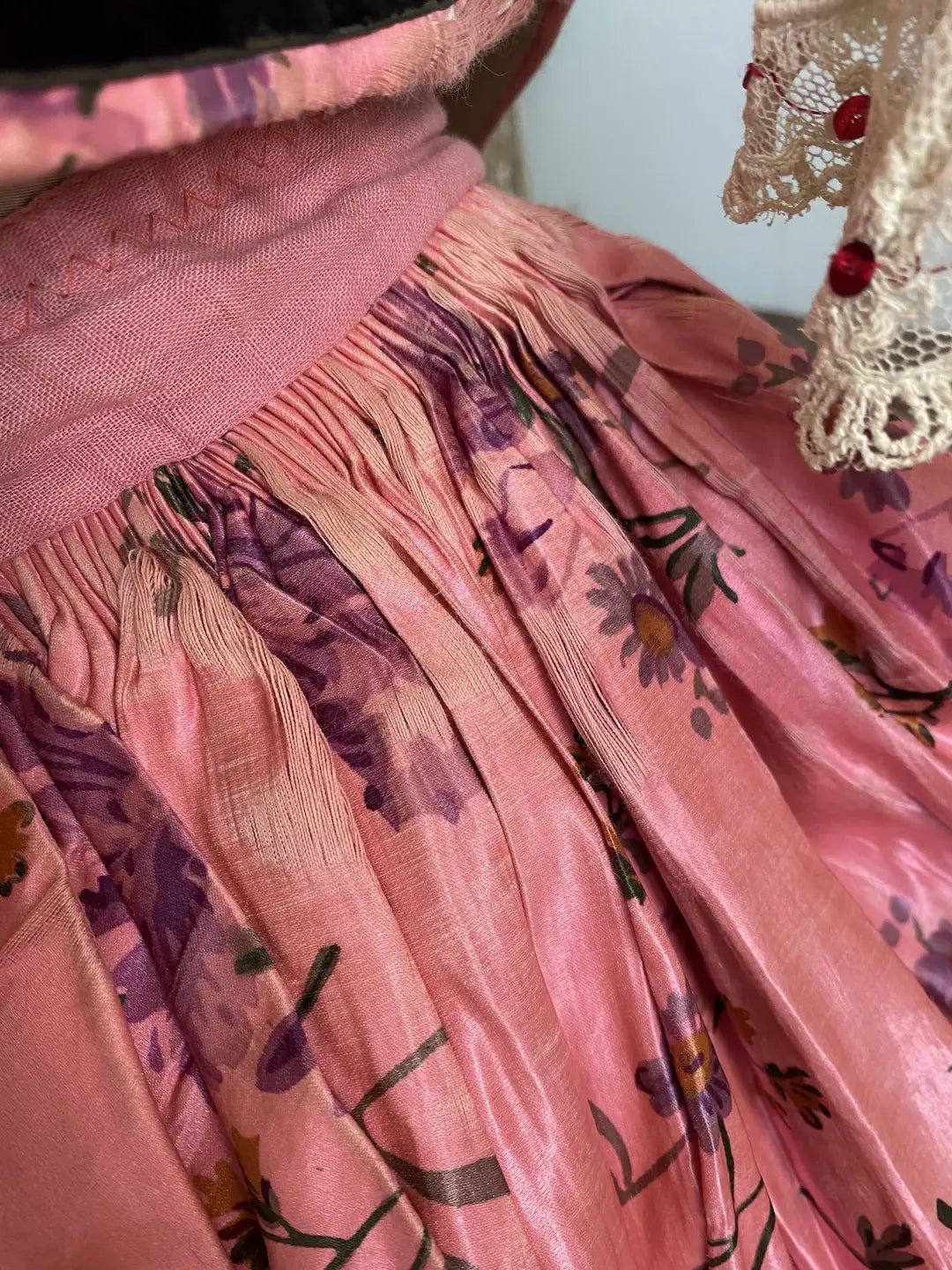 STUNNING Antique French Theater Costume Pink Silk Purple Flowers Bodice Pannier Skirt Lace Trim Marie Antoinette