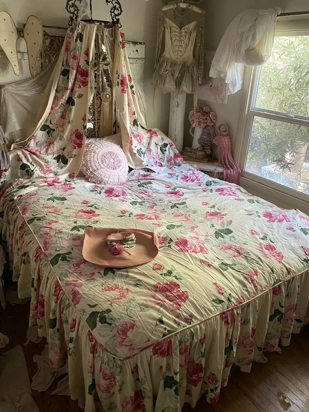 Vintage Bedroom Set Pink Roses Ruffled Coverlet Curtains Bed Canopy Drapes