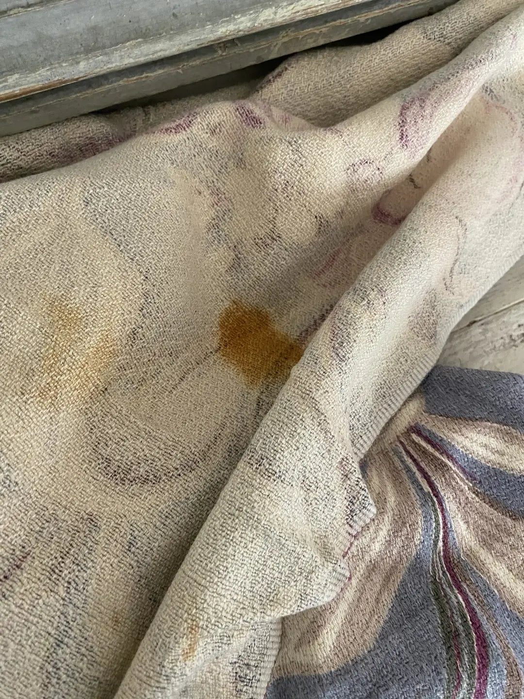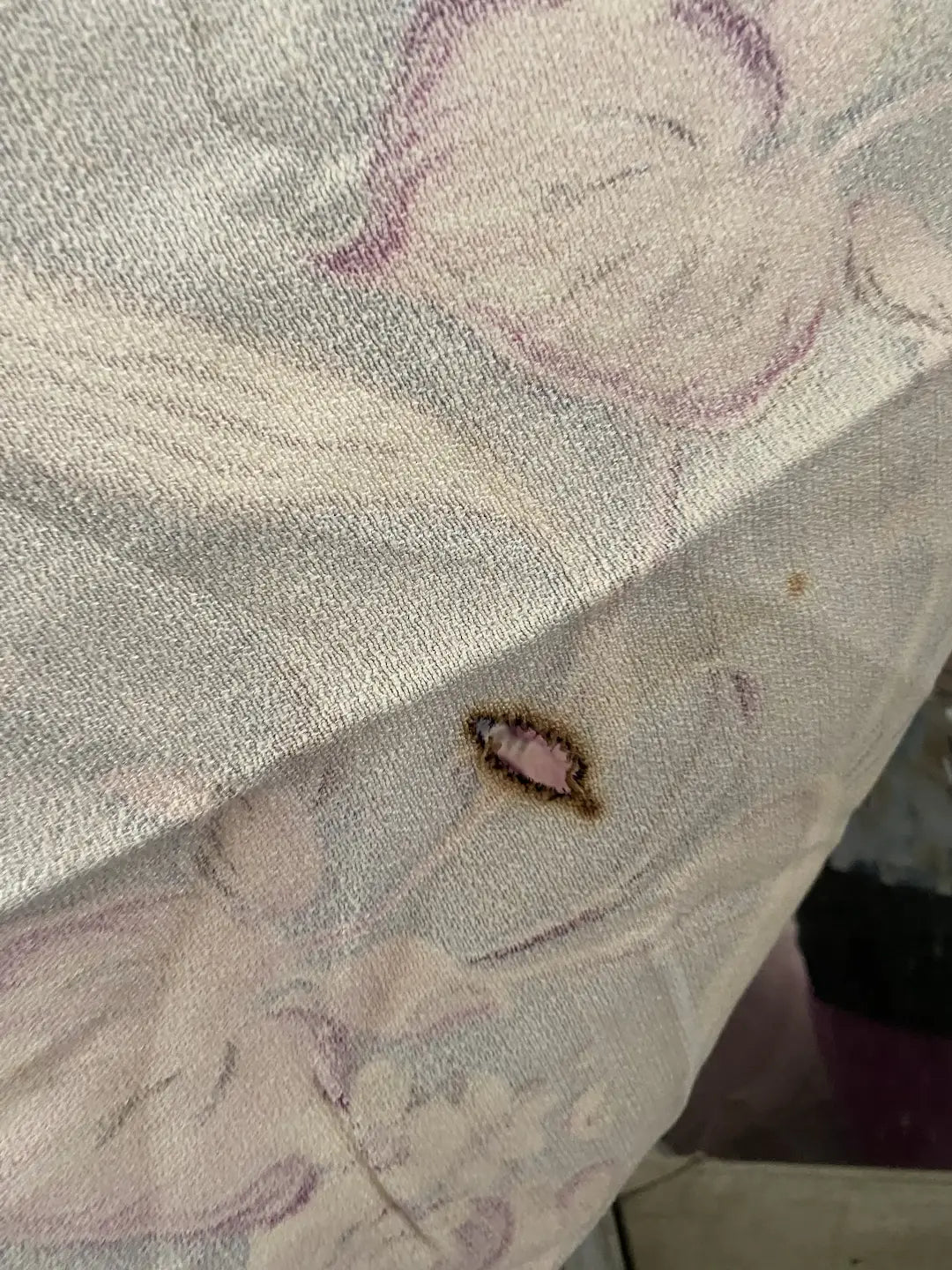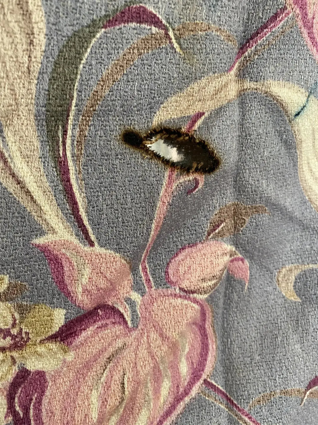 Lovely panel, tons of fabric to work with, does have a rod pocket at top, some staining and one burned hole as shown and a couple other small holes
