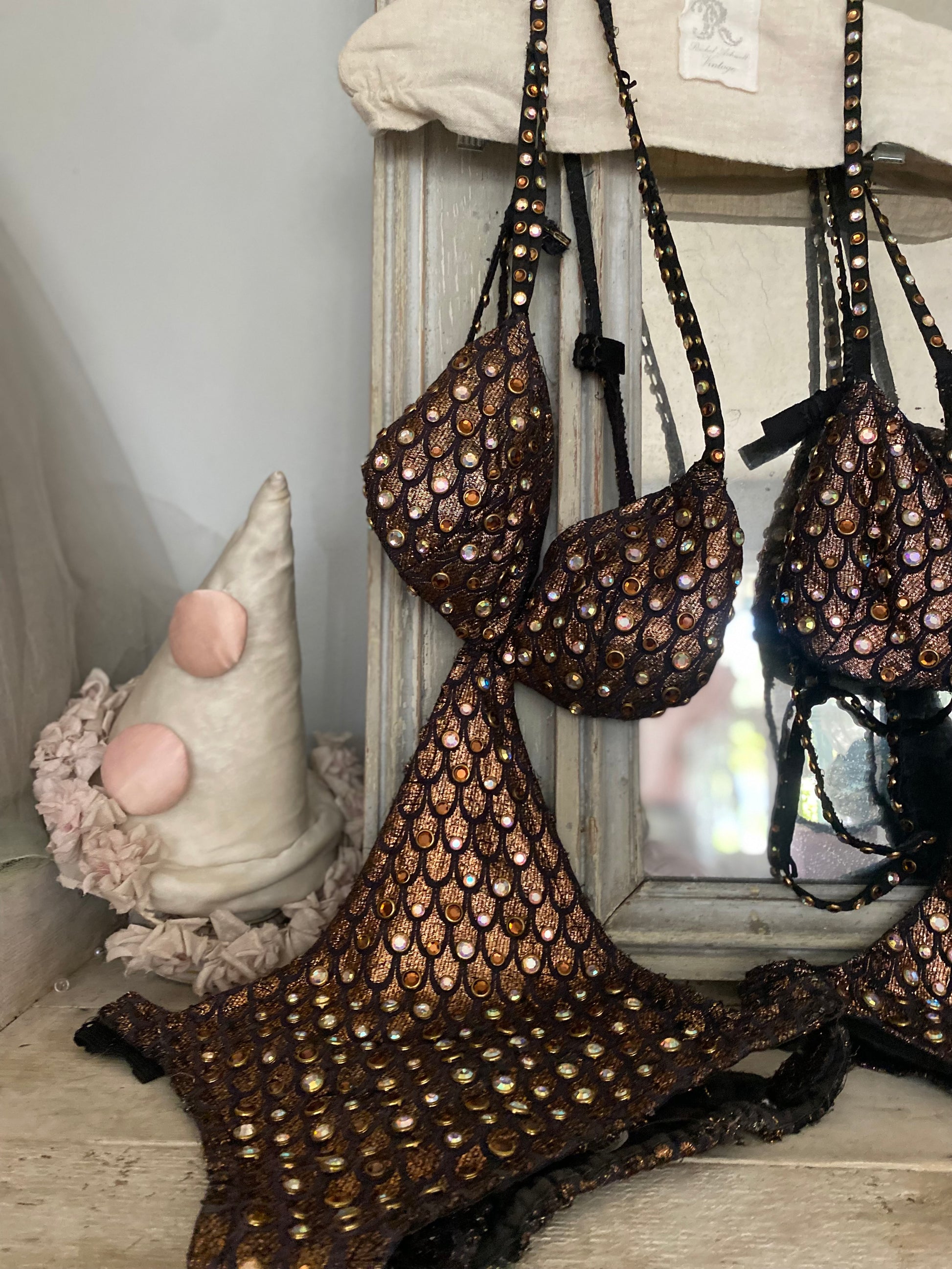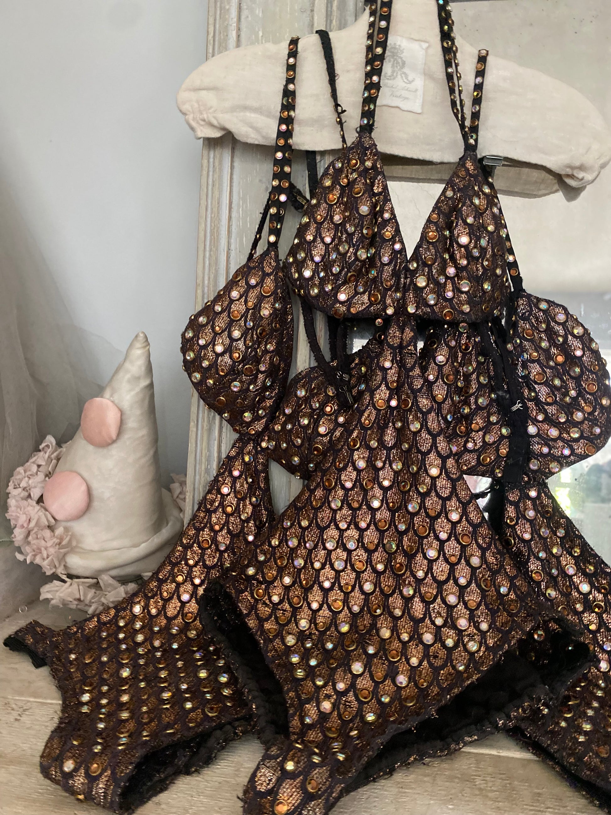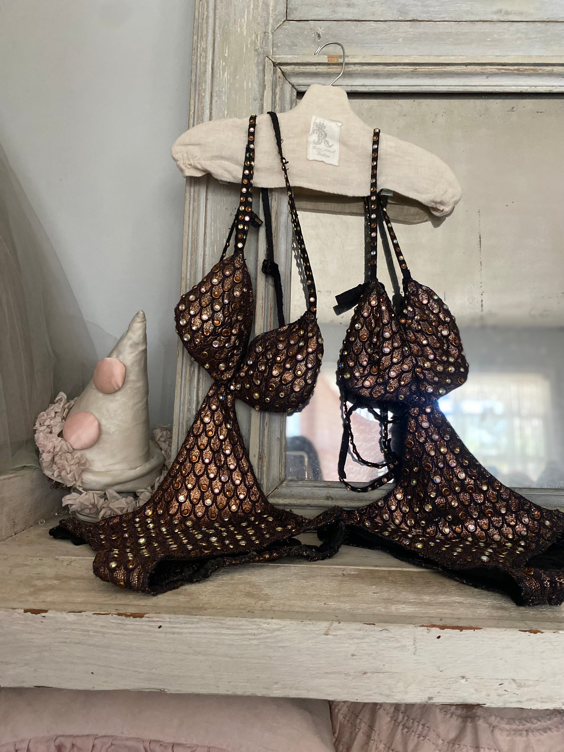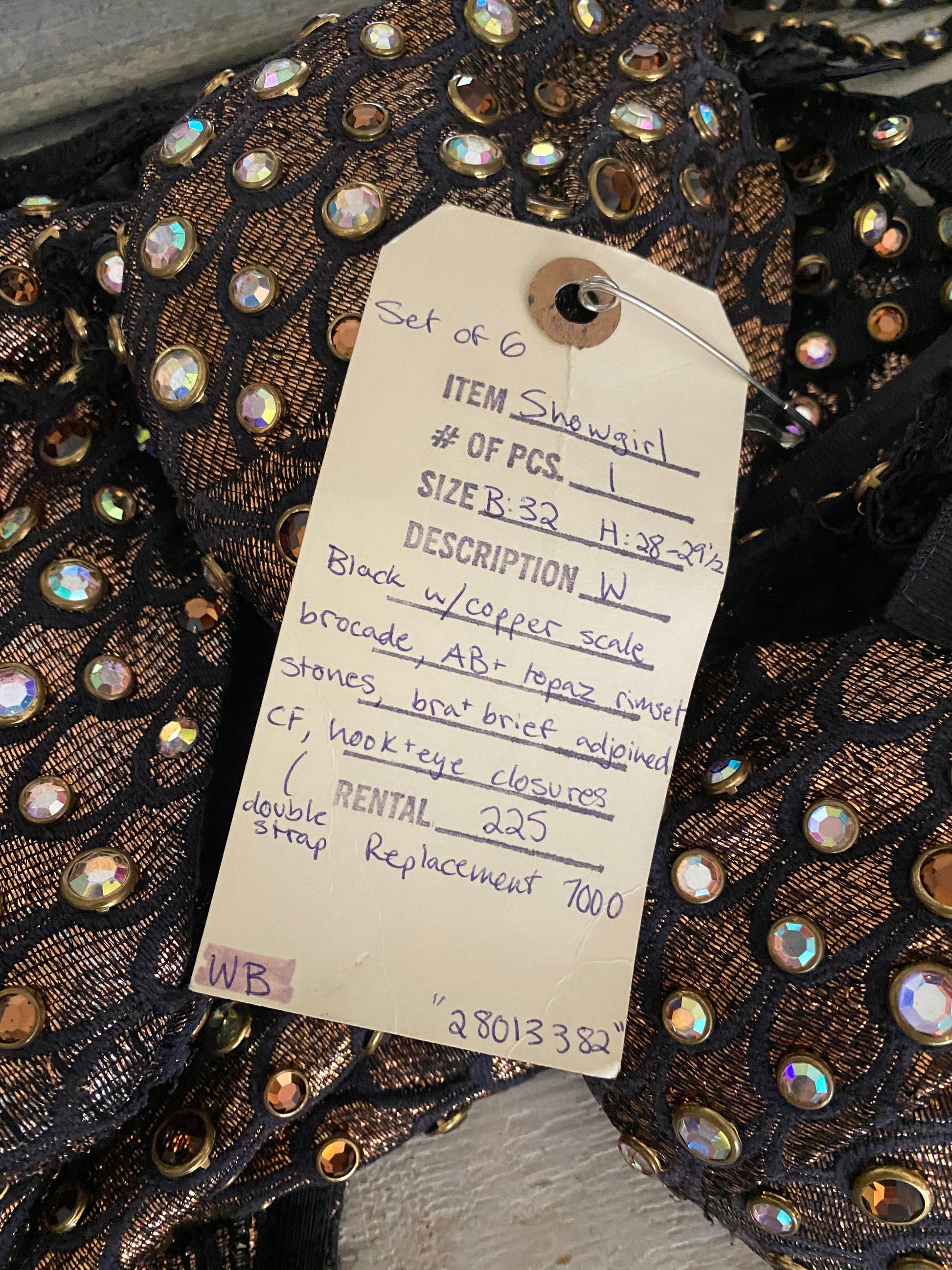 A group of four showgirl costumes from unknown productions, each in copper metallic and black non-stretch fabric with a scale pattern, studded with topaz colored and AB iridescent faceted "gems". The cut of each piece is made up of a triangle bra top with double criss cross straps adjoined by a thin strip from chest to high-waisted bottoms with high-cut leg holes. Hook and eye closures at straps and at side of bikini style bottoms. Each piece has a "The Costume House " tag affixed to the interior.
