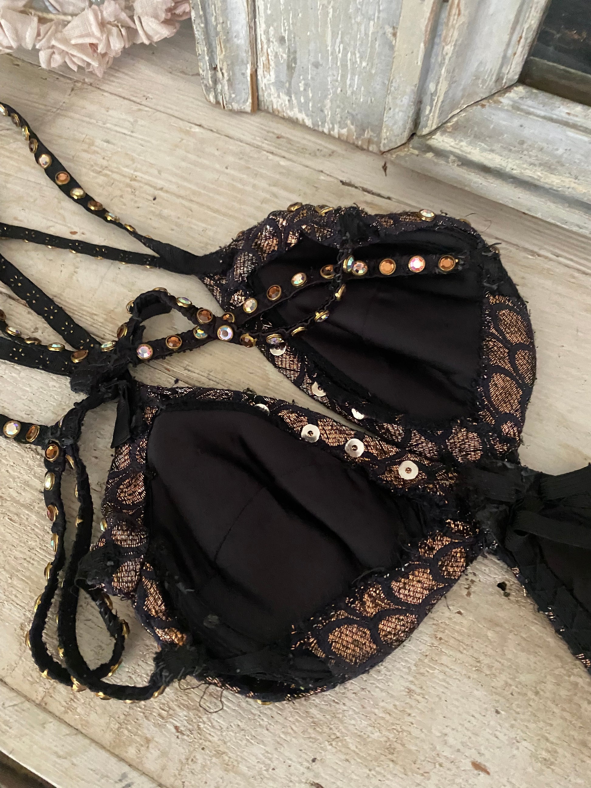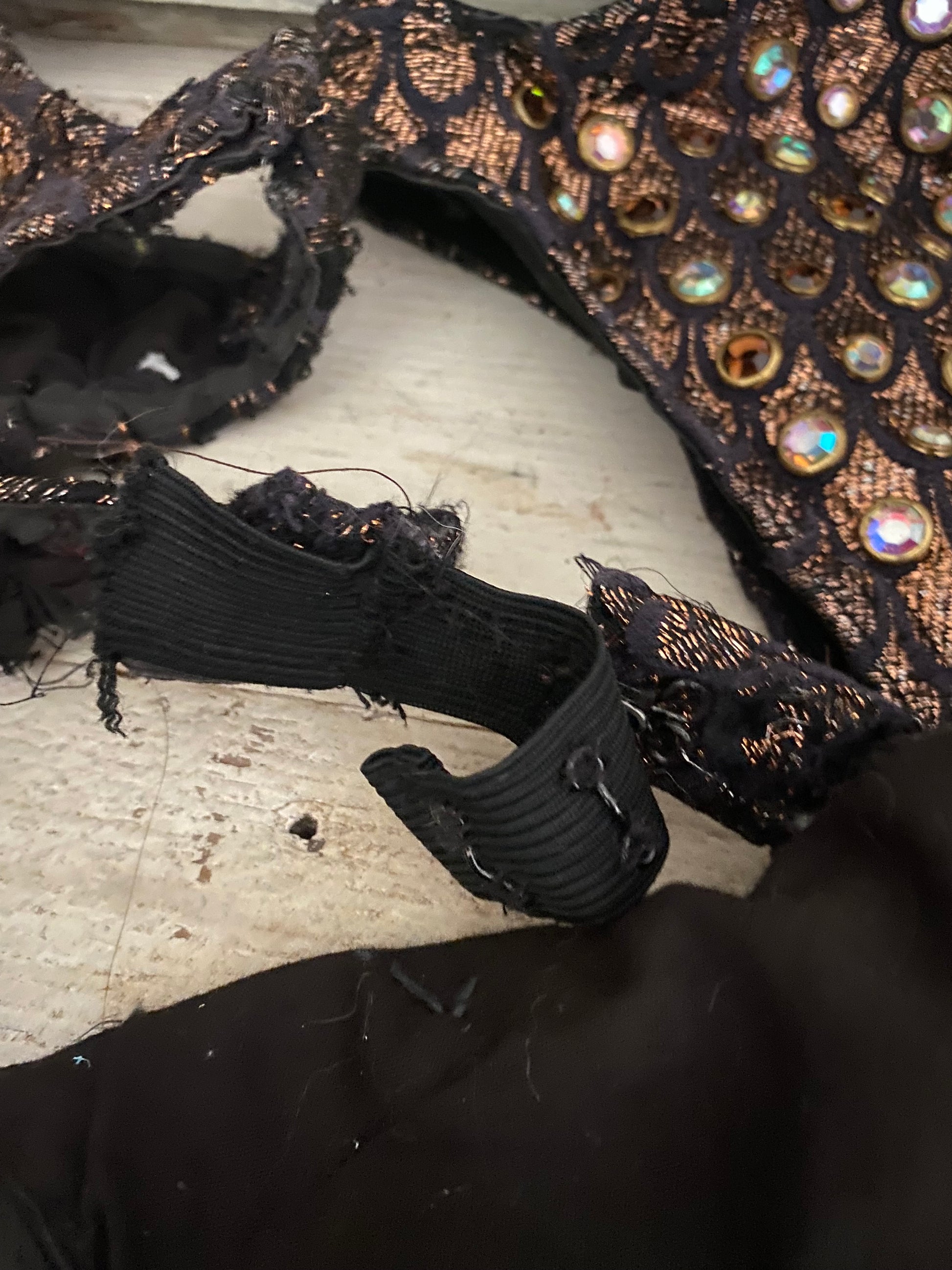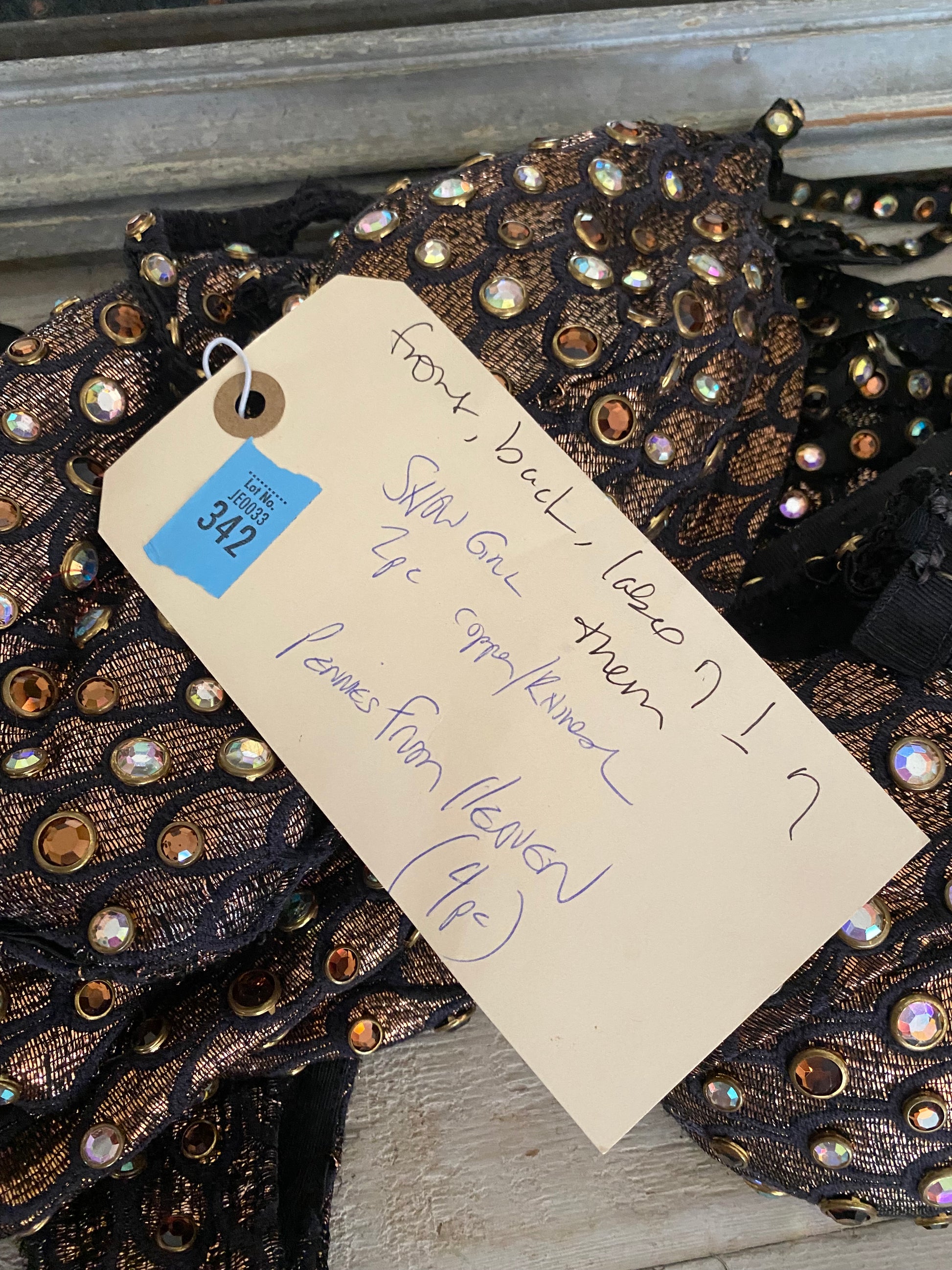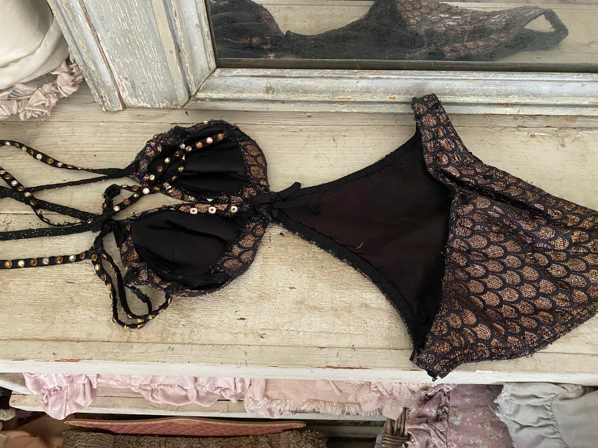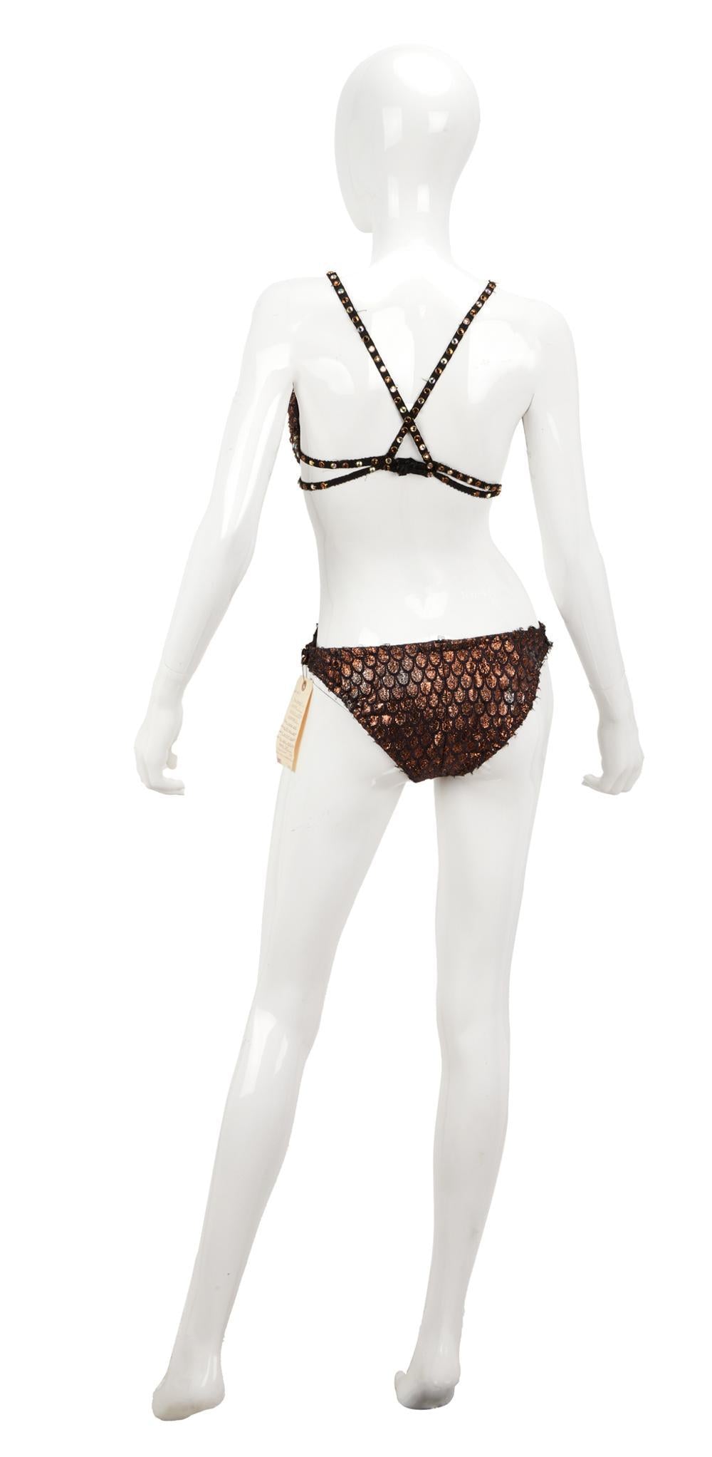 A group of four showgirl costumes from unknown productions, each in copper metallic and black non-stretch fabric with a scale pattern, studded with topaz colored and AB iridescent faceted "gems". The cut of each piece is made up of a triangle bra top with double criss cross straps adjoined by a thin strip from chest to high-waisted bottoms with high-cut leg holes. Hook and eye closures at straps and at side of bikini style bottoms. Each piece has a "The Costume House " tag affixed to the interior.