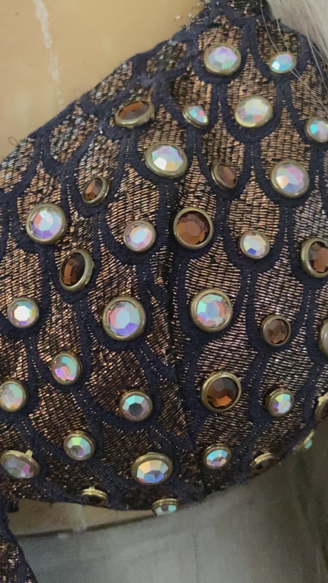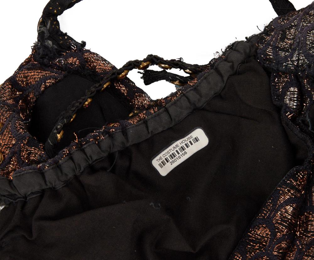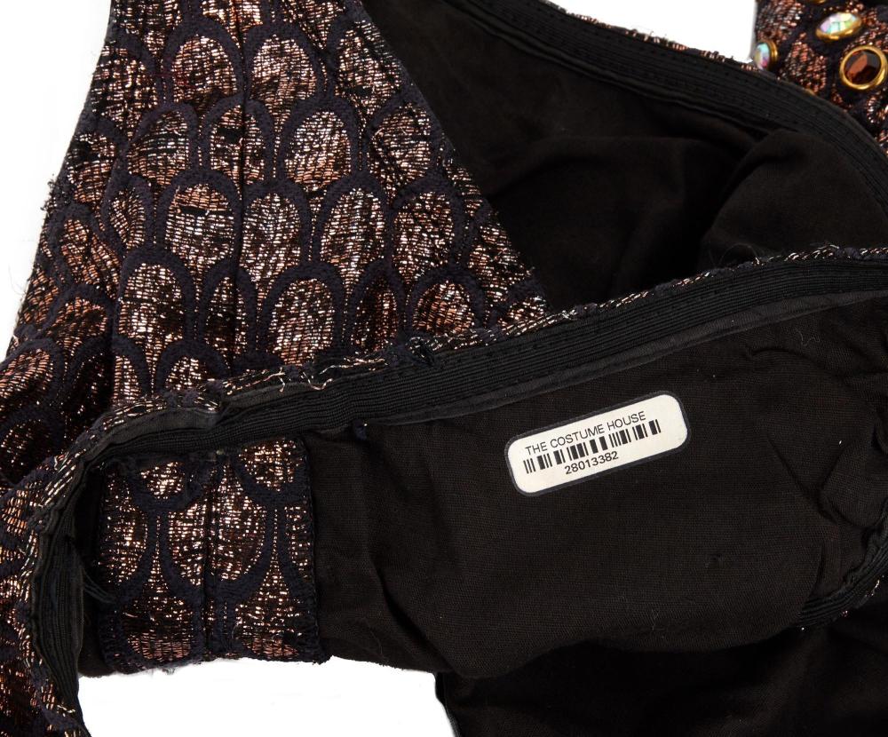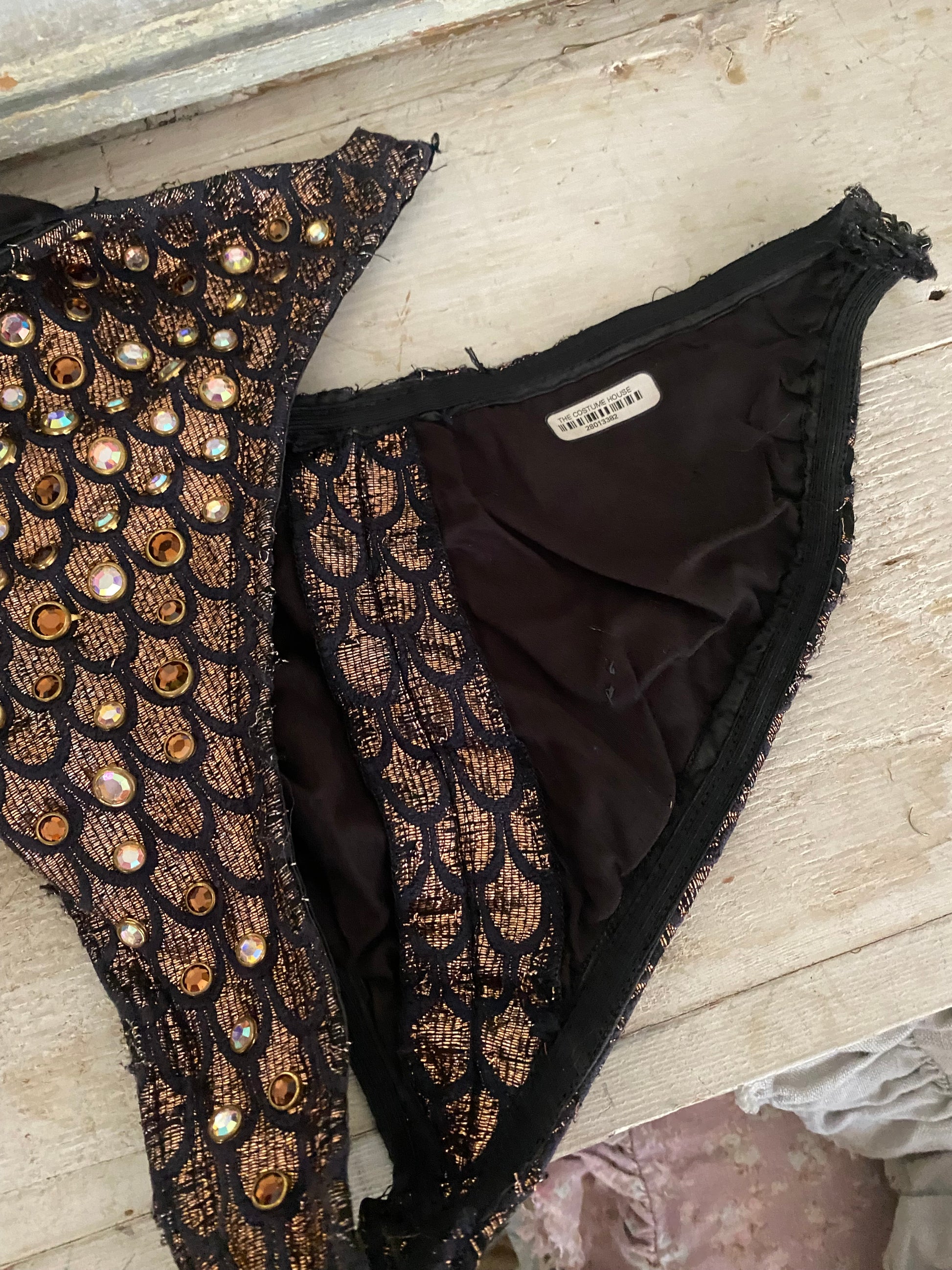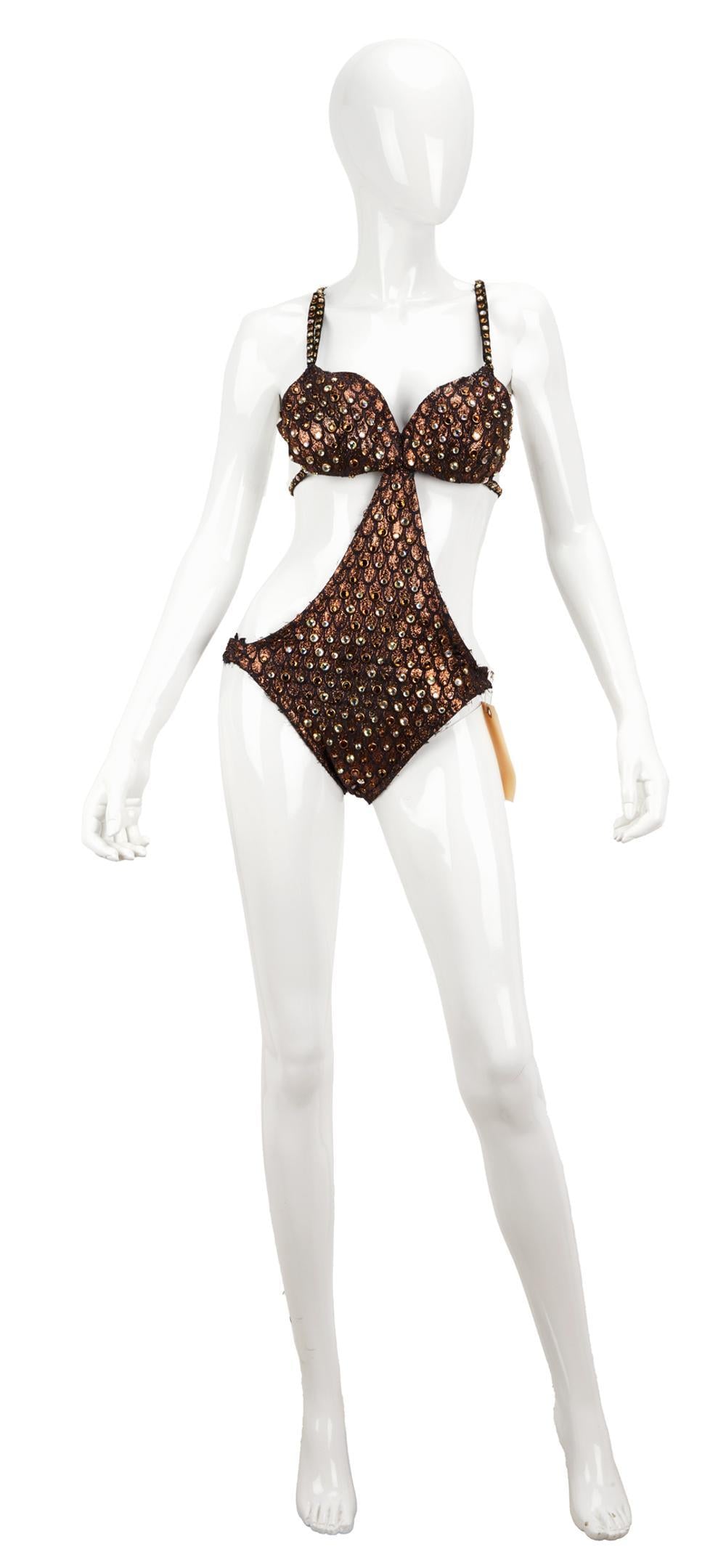A group of four showgirl costumes from unknown productions, each in copper metallic and black non-stretch fabric with a scale pattern, studded with topaz colored and AB iridescent faceted "gems". The cut of each piece is made up of a triangle bra top with double criss cross straps adjoined by a thin strip from chest to high-waisted bottoms with high-cut leg holes. Hook and eye closures at straps and at side of bikini style bottoms. Each piece has a "The Costume House " tag affixed to the interior.